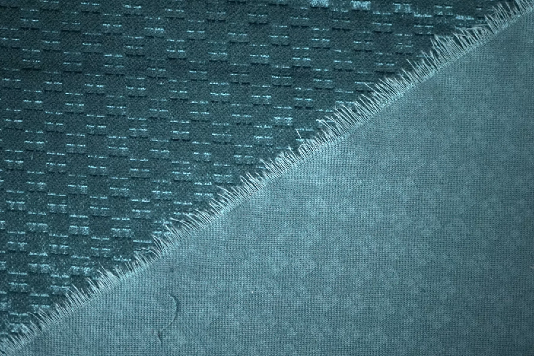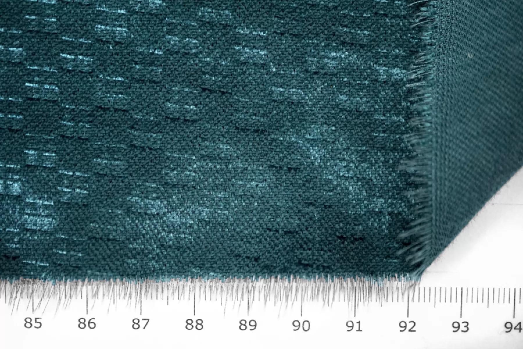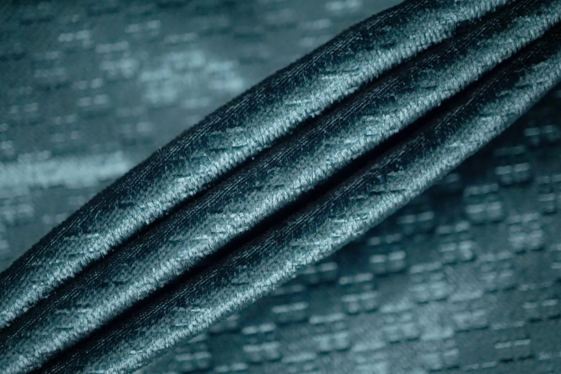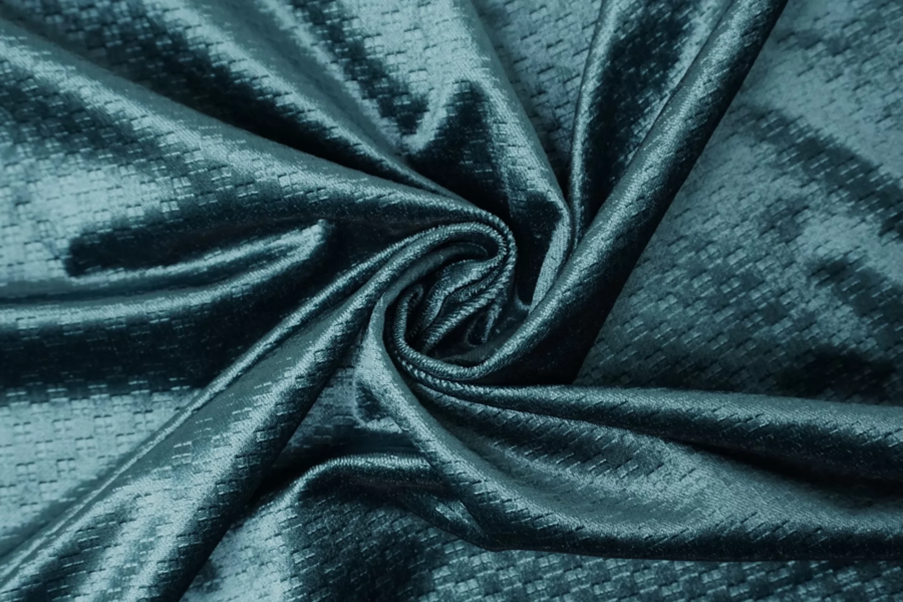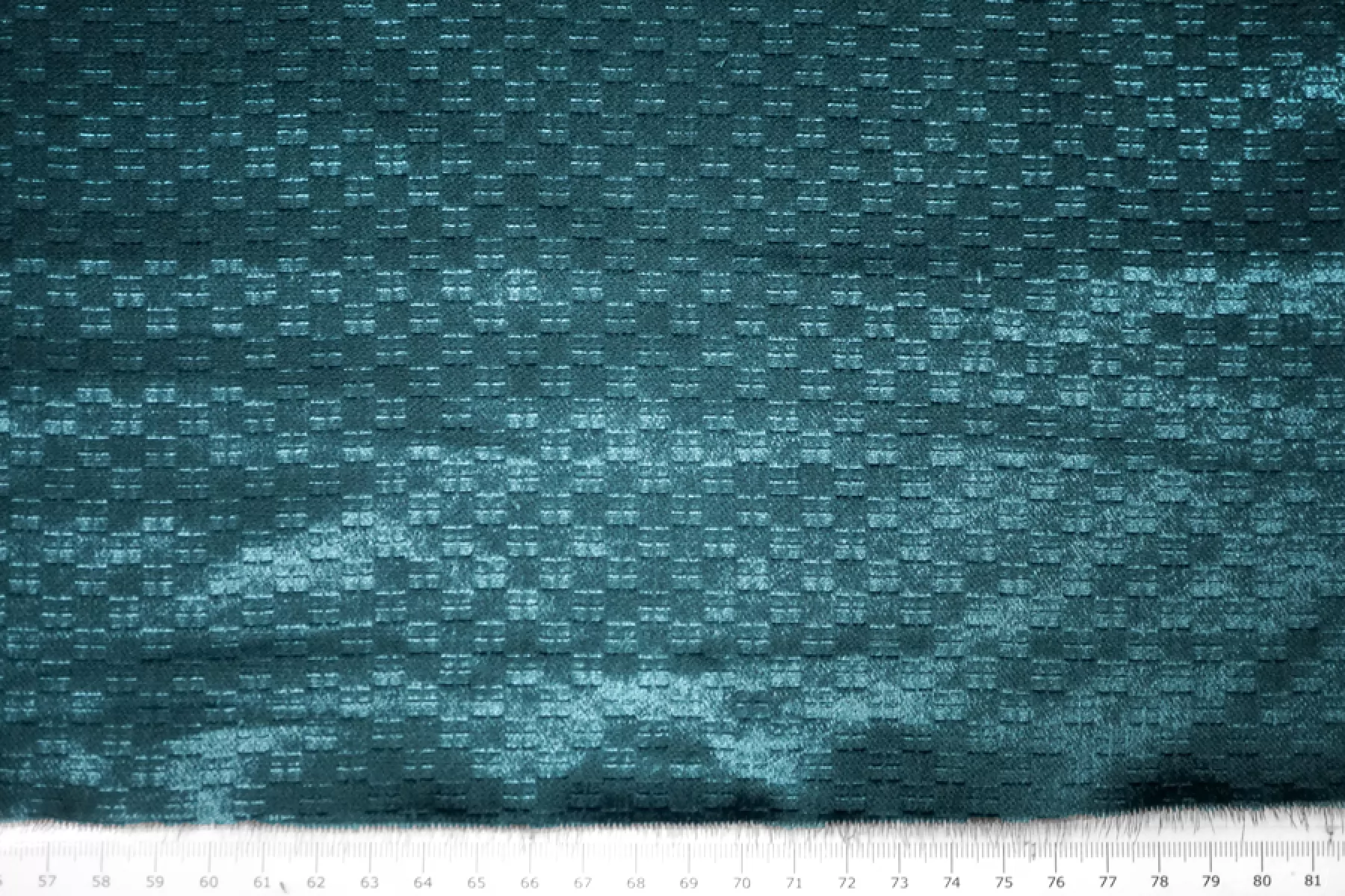 Очень красивый бархат с геометрической выработкой в слегка приглушенном сине-зеленом оттенке. Основа материала их хлопка, ворс из вискозы - короткий и направленный. Тактильно нетолстый, мягкий, приятный. Обладает прекрасным блеском. Немного тянется за счет эластана. Низкая степень сминаемости. Не просвечивает. Пластичный. Отлично подойдет на платья, юбки, мягкие жакеты, кимоно и не только.