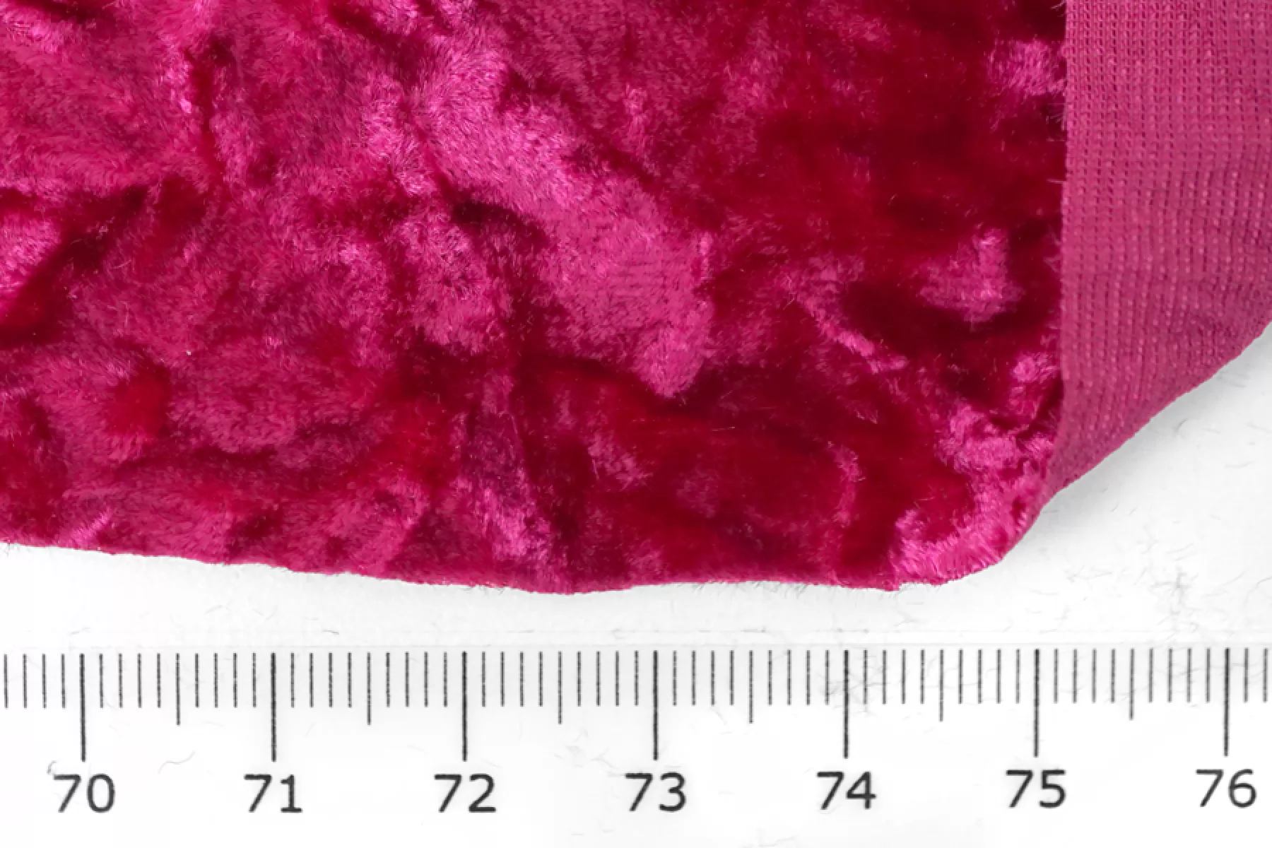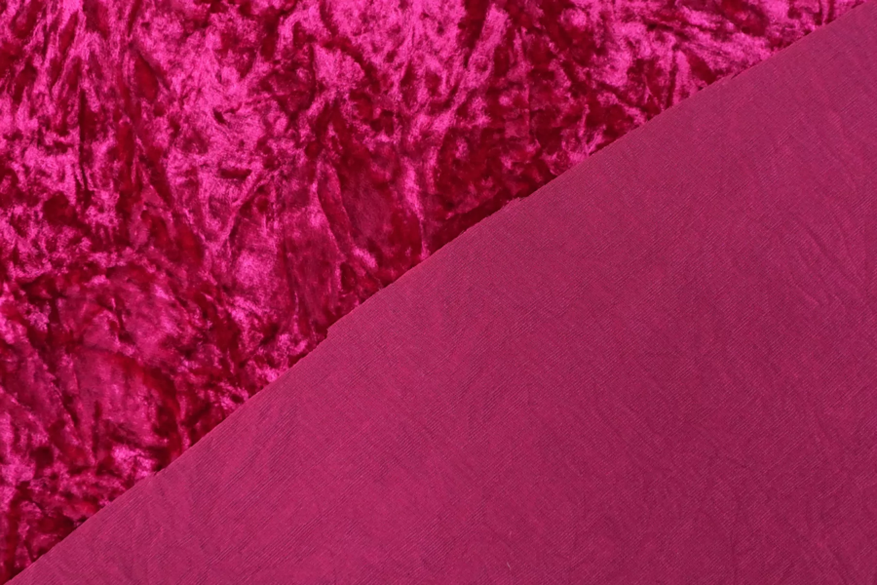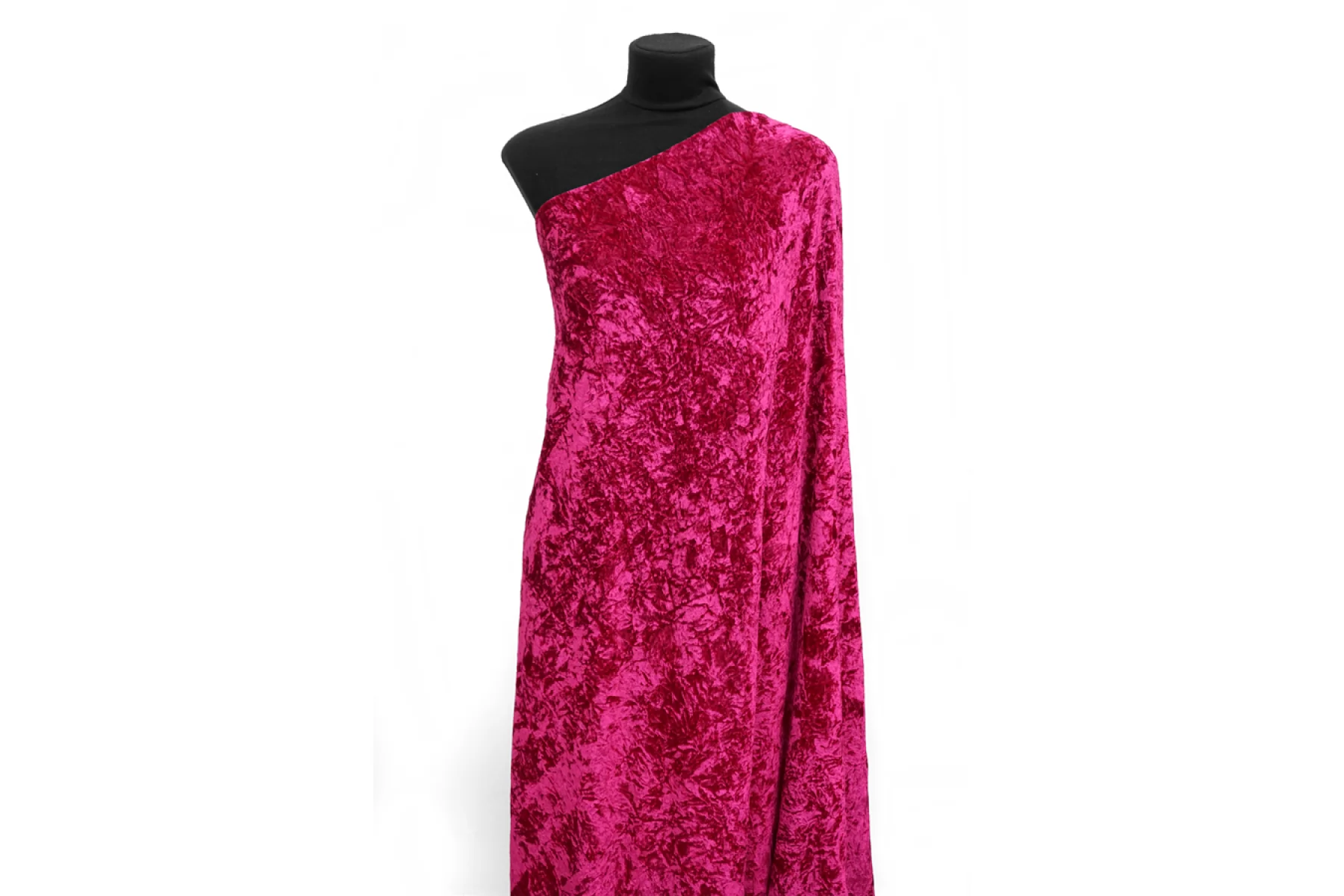 Шикарнейшего качества и очень красивый бархат на шелковой основе в насыщенном оттенке розовой фуксии. Тактильно тонкий, мягкий, приятный, пластичный. Материал жатый. Обладает красивым бархатным блеском. Не тянется. Не просвечивает, но т.к. само по себе полотно нетолстое, если смотреть прямо на просвет, будет заметна тень силуэта. Хорошо драпируется. Форму не держит. Шьем платья и костюмы в бельевом и пижамном стиле, кимоно и не только. Уход деликатный.