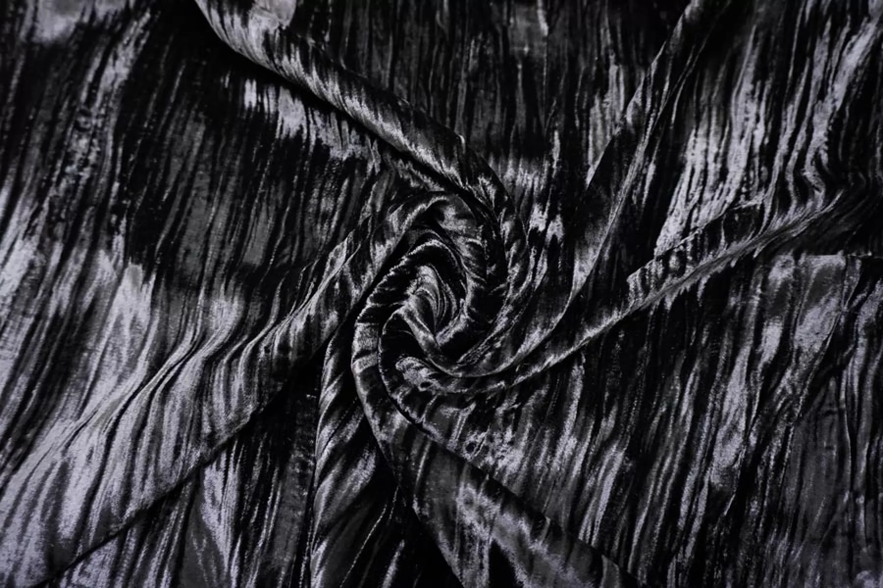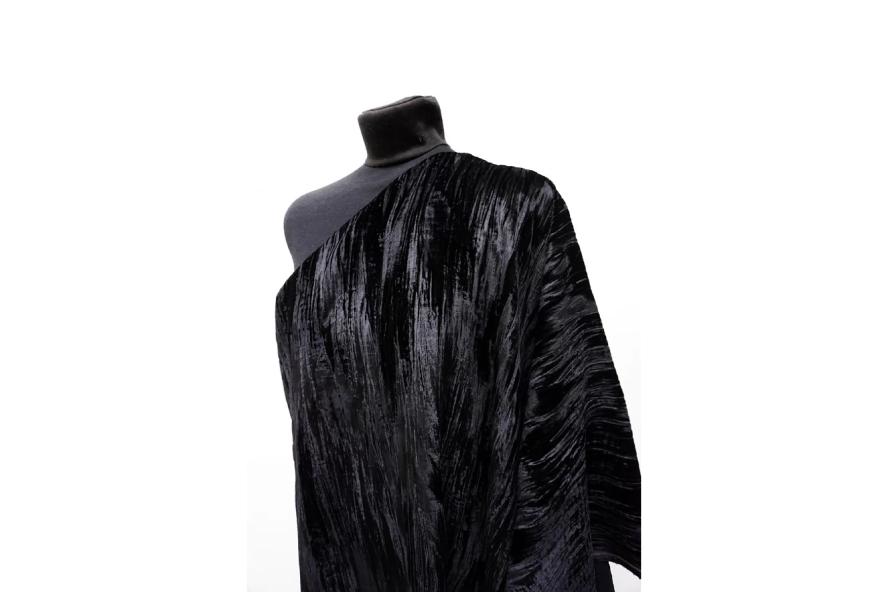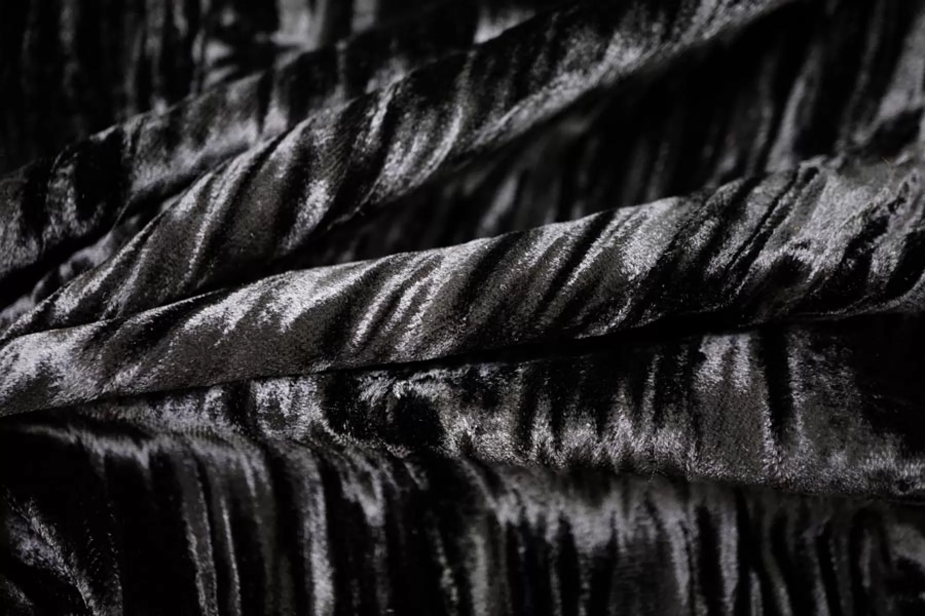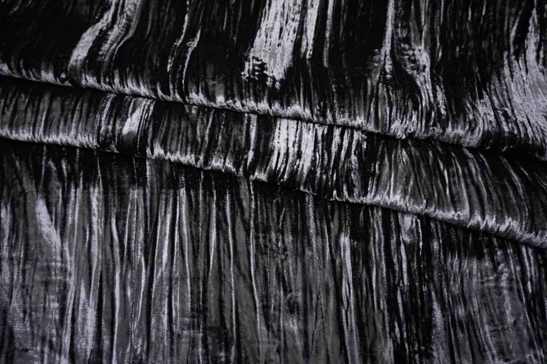 Шикарный вискозный бархат от бренда Yves Saint Laurent на шелковой основе в глубоком чёрном цвете. Вся поверхность с красивым жатой (крешированной) фактурой. Ворс достаточно короткий, а сам материал тонкий, но пластичный. Тактильно приятный, мягкий. Совсем немного виден силуэт насквозь, но в изделии заметно не будет. Красиво выглядит в драпировках и обладает прекрасным лоском. Не тянется. Подойдет на платья, юбки, мягкие жакеты и не только. При необходимости используйте подкладочный материал. Уход деликатный.