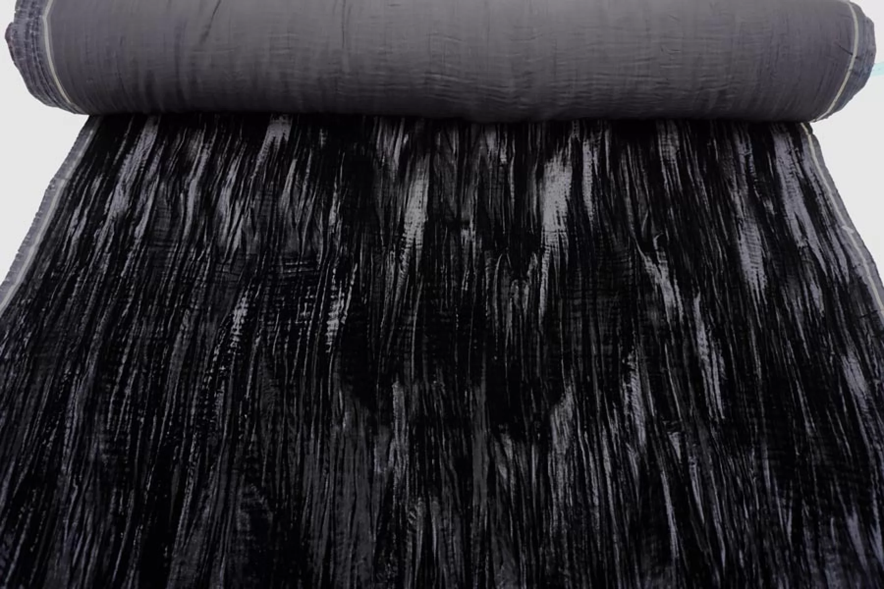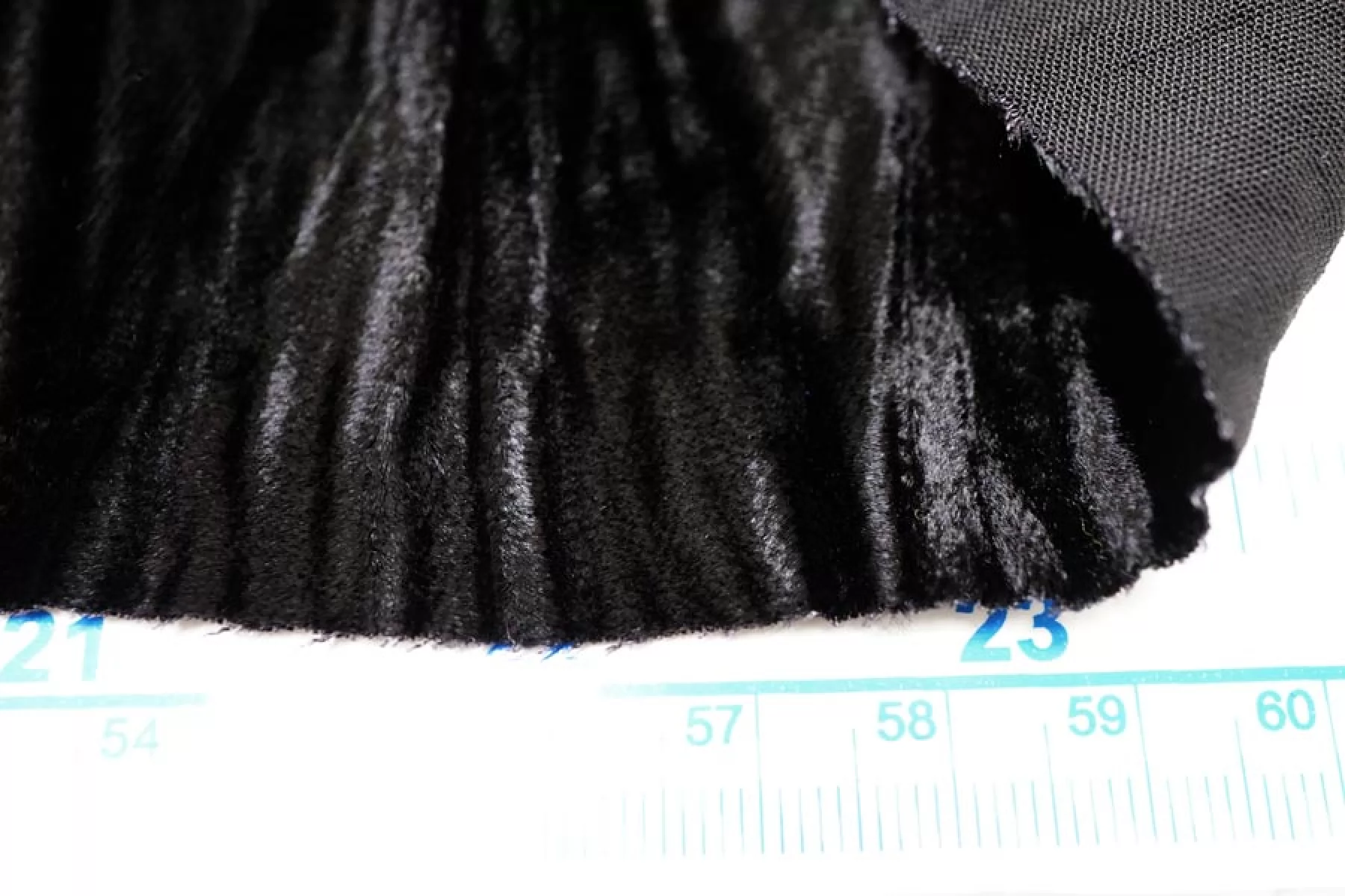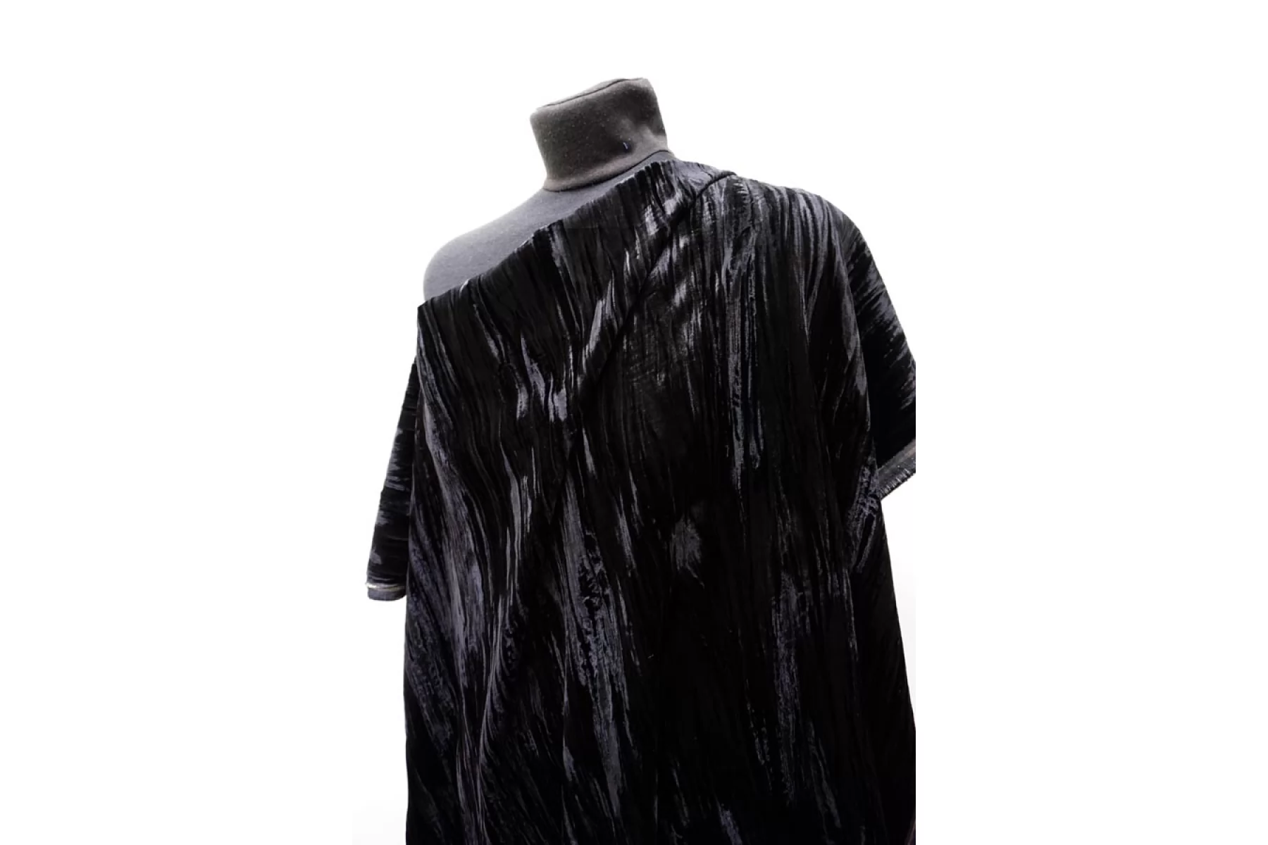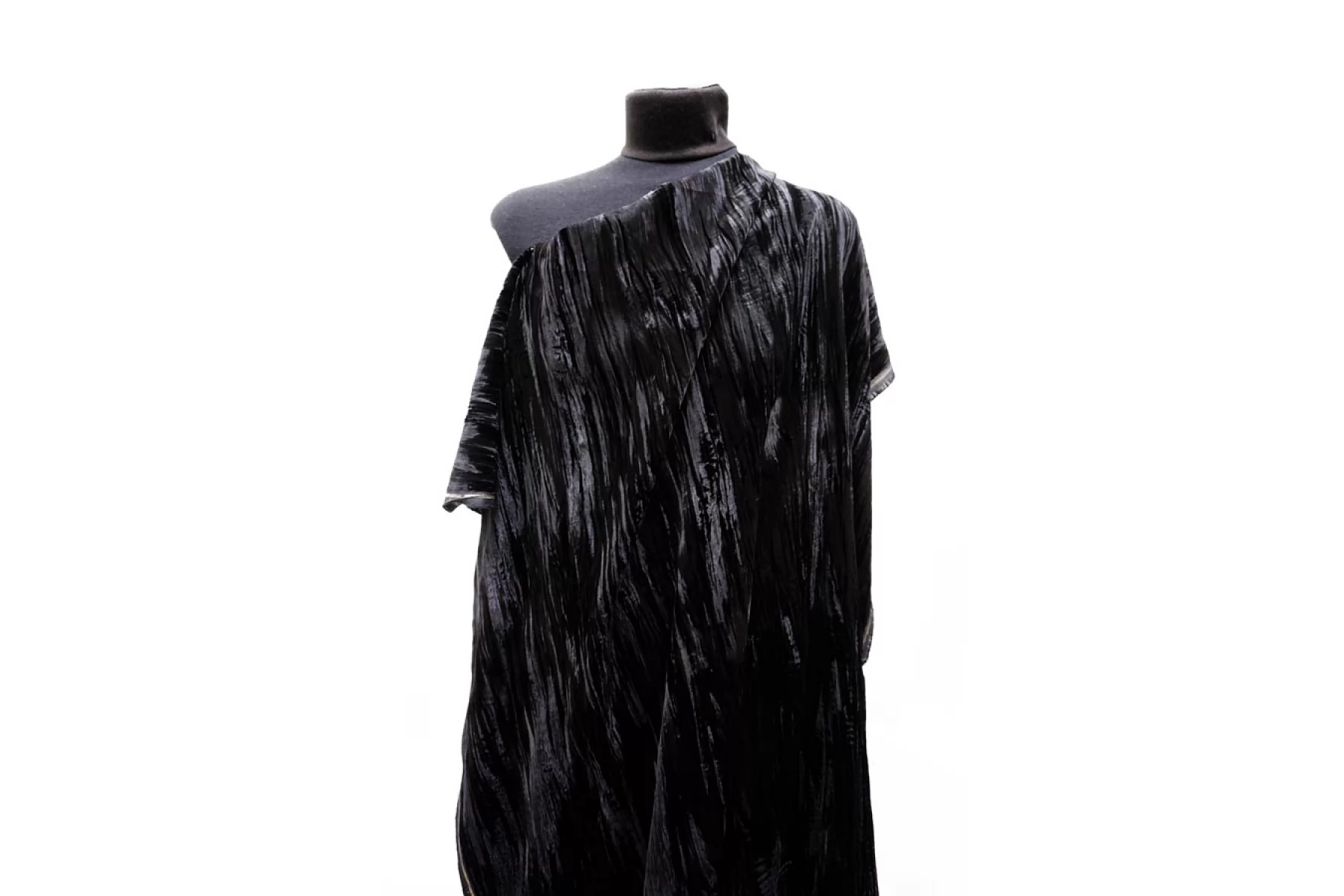 Шикарный вискозный бархат от бренда Yves Saint Laurent на шелковой основе в глубоком чёрном цвете. Вся поверхность с красивым жатой (крешированной) фактурой. Ворс достаточно короткий, а сам материал тонкий, но пластичный. Тактильно приятный, мягкий. Совсем немного виден силуэт насквозь, но в изделии заметно не будет. Красиво выглядит в драпировках и обладает прекрасным лоском. Не тянется. Подойдет на платья, юбки, мягкие жакеты и не только. При необходимости используйте подкладочный материал. Уход деликатный.