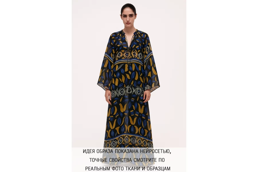 Тонкий хлопковый батист черного цвета с абстрактным орнаментом синего, желтого, белого и оттенков хаки. Материал полупрозрачный. Тактильно приятный и мягкий, легкий и летящий. Плетение достаточно плотное. Не тянется, немного держит форму. Шьем платья, юбки, сарафаны и рубашки. При необходимости используйте подкладочный материал.