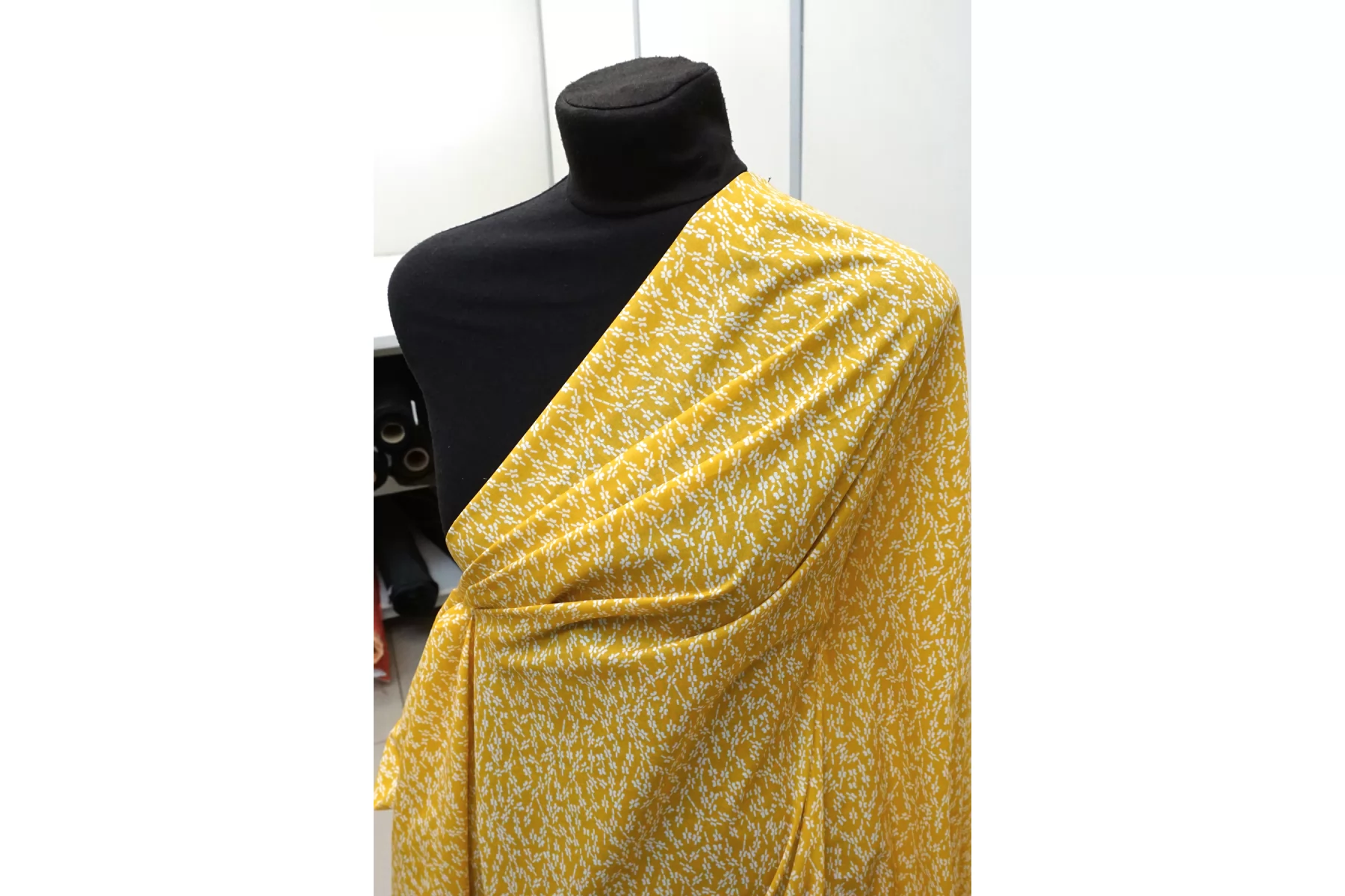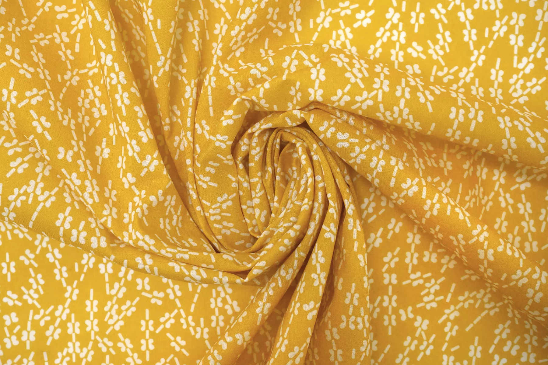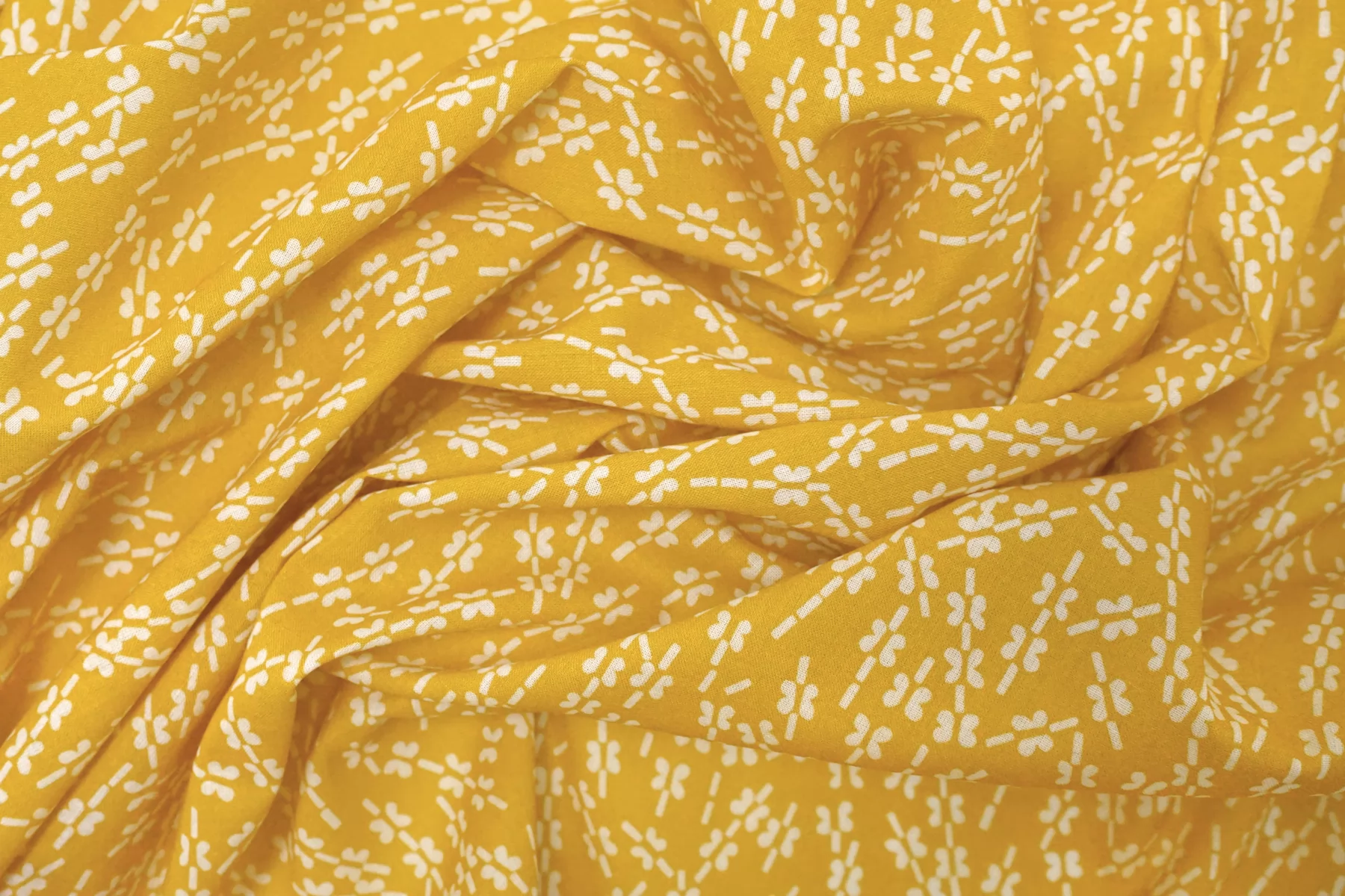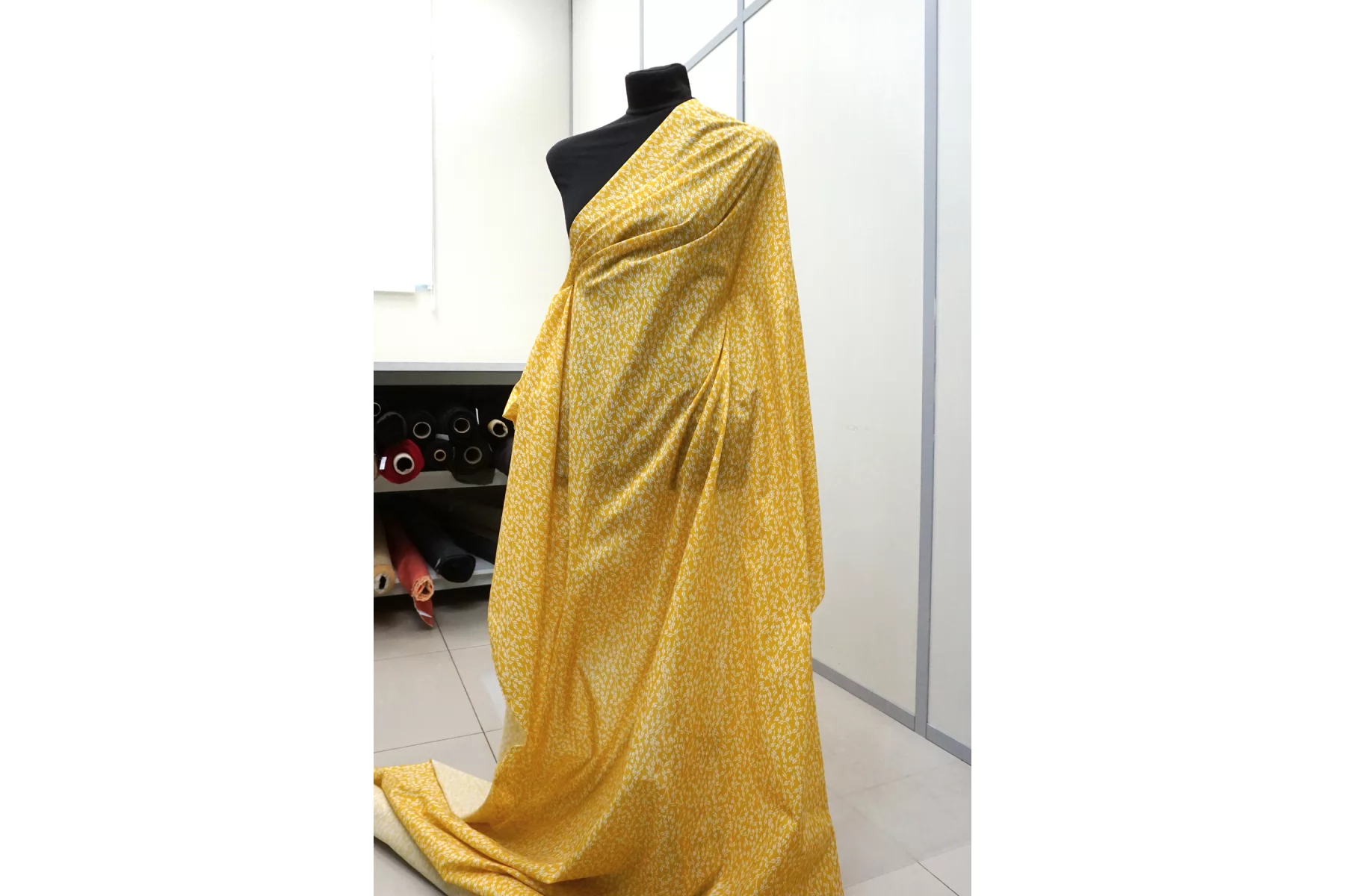 Хлопковый батист жёлтого цвета с абстрактным белым принтом. Материал очень приятный, мягкий, тонкий, легкий, летящий. Просвечивает. Мнется. Держит форму и драпируется. Отлично подойдет на свободные рубашки, платья, юбки и не только. При необходимости используйте подкладочный материал.