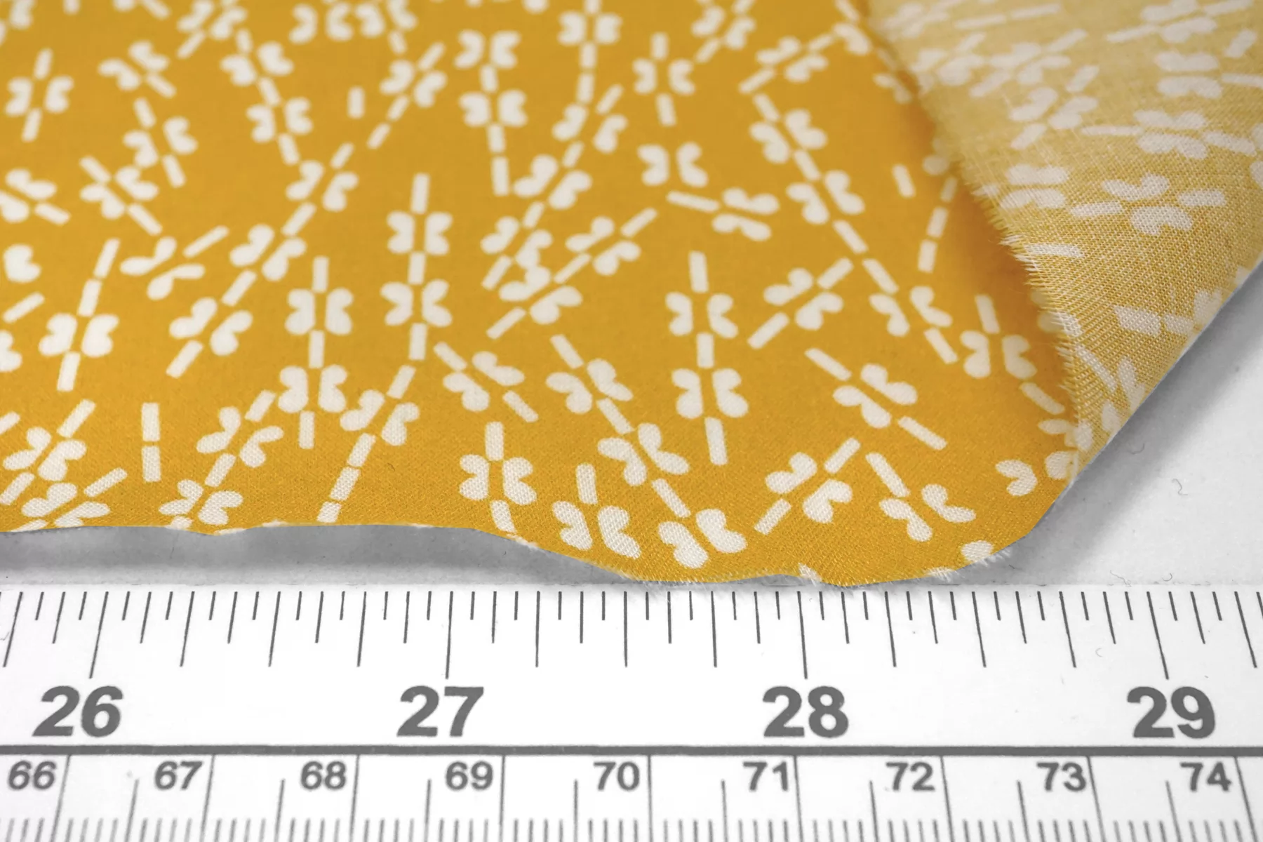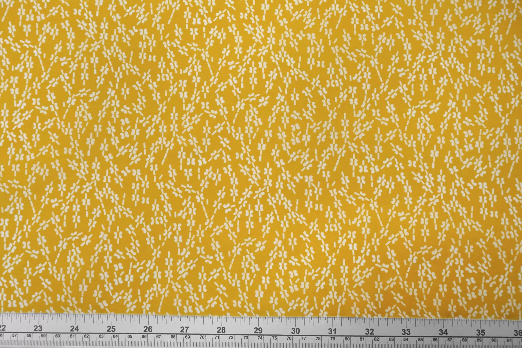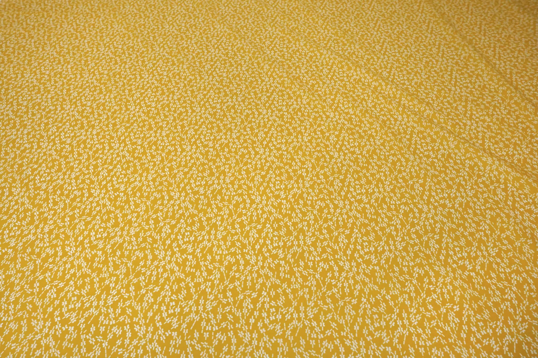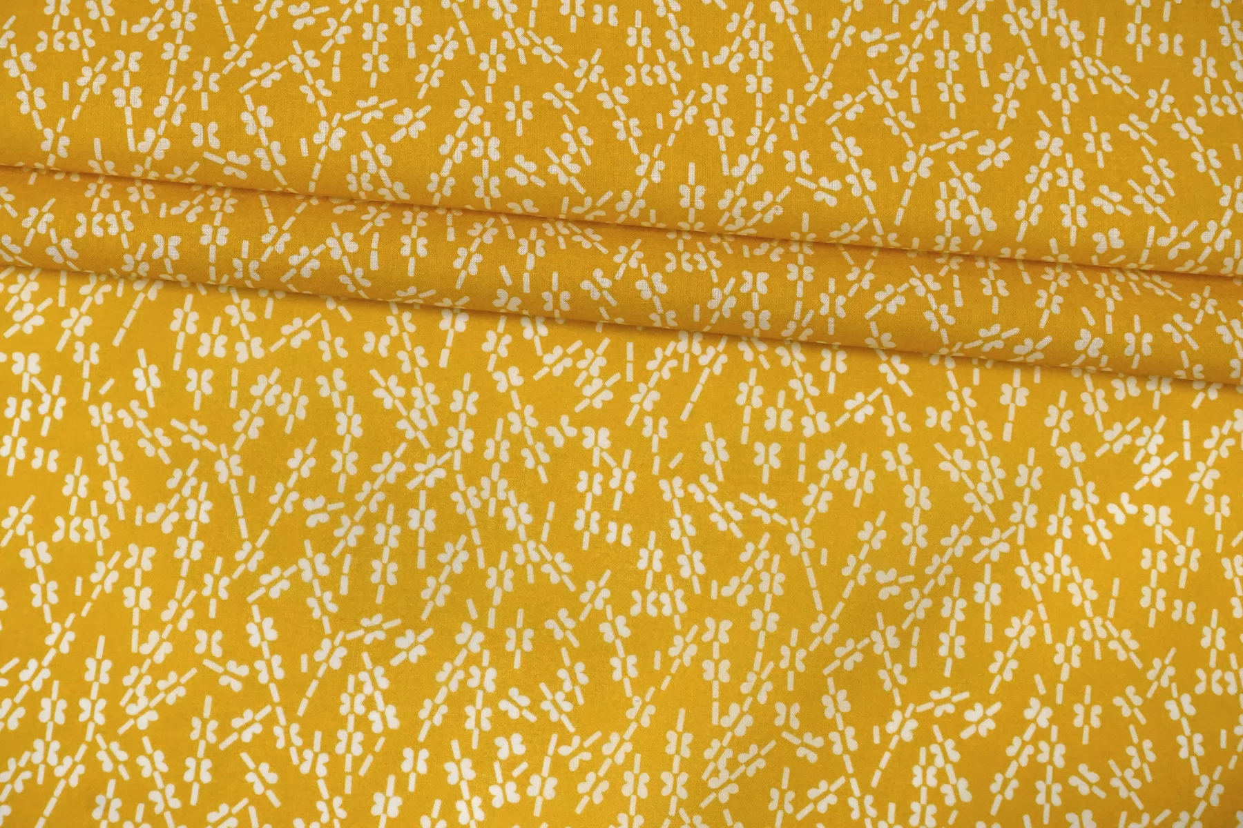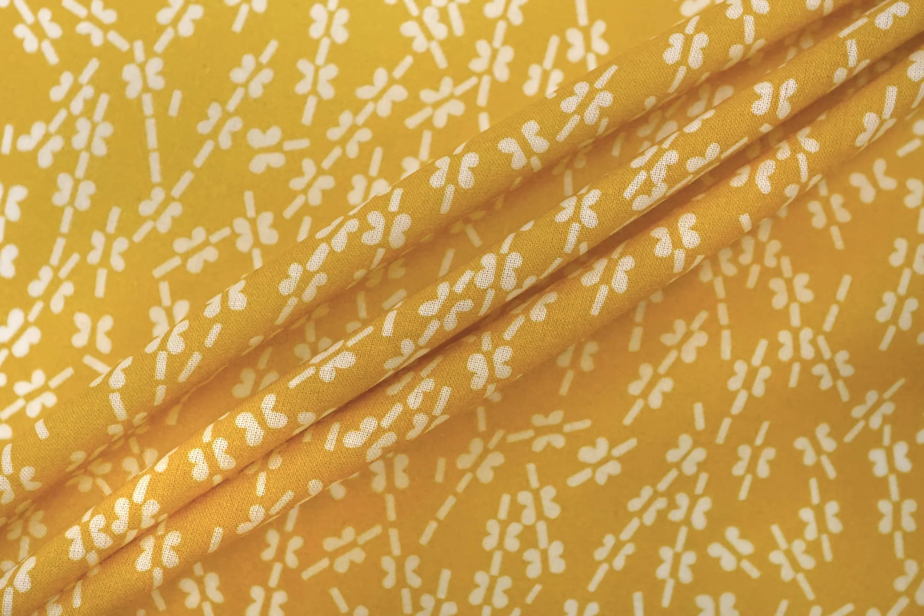 Хлопковый батист жёлтого цвета с абстрактным белым принтом. Материал очень приятный, мягкий, тонкий, легкий, летящий. Просвечивает. Мнется. Держит форму и драпируется. Отлично подойдет на свободные рубашки, платья, юбки и не только. При необходимости используйте подкладочный материал.