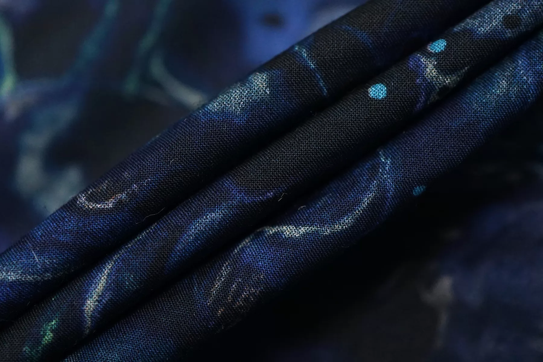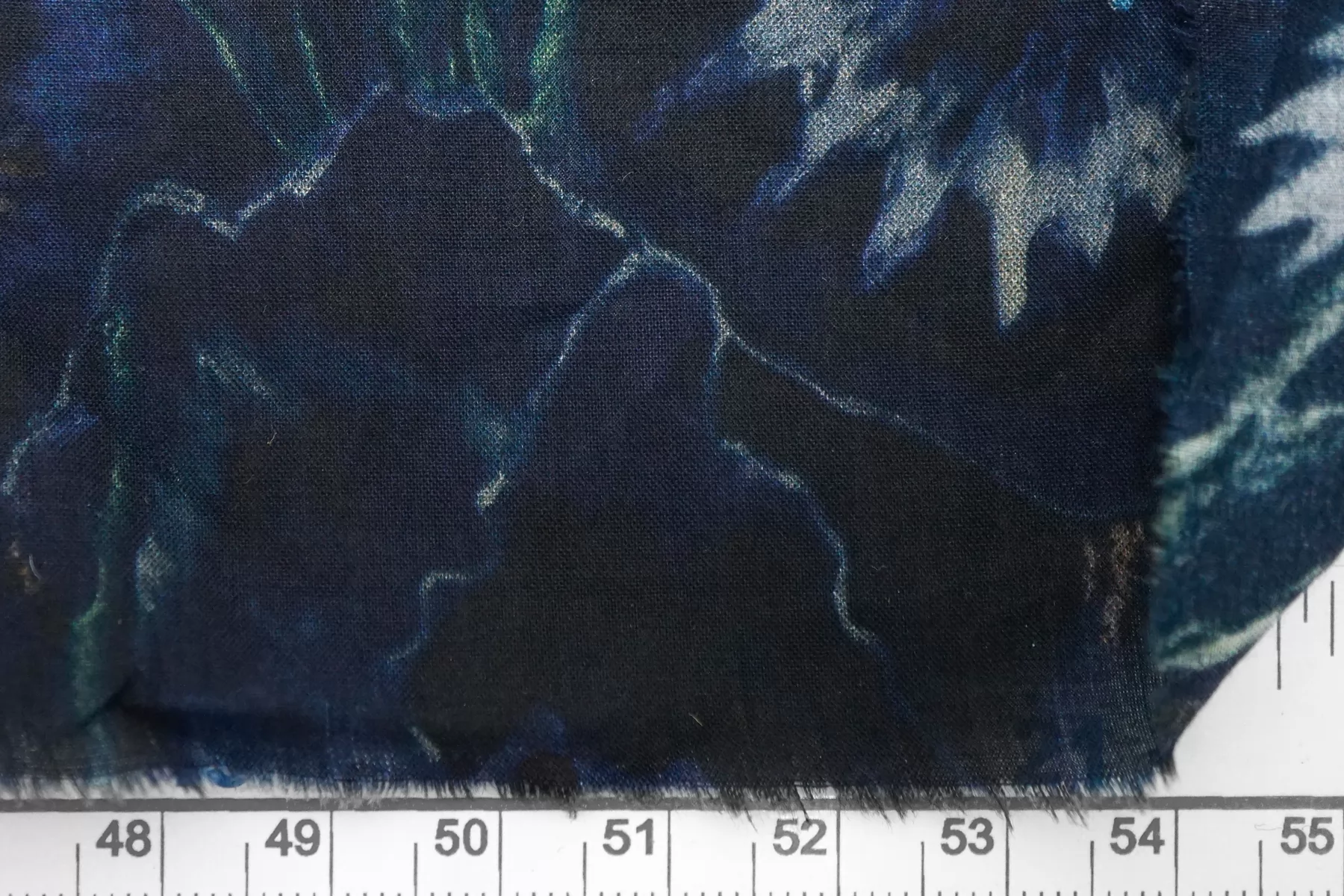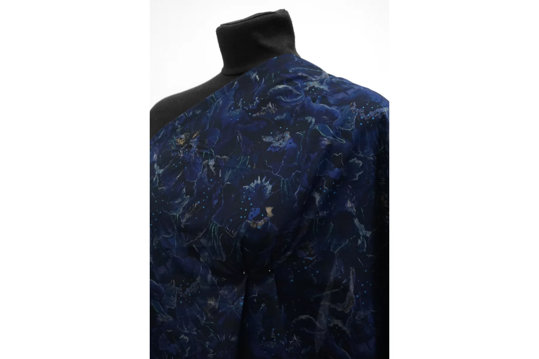 Тонкий хлопковый батист черного и синего цвета с крупным цветочным принтом. Материал полупрозрачный. Тактильно приятный и мягкий, легкий. Плетение достаточно плотное. Не тянется, хорошо держит форму. Шьем платья, юбки, сарафаны и рубашки. При необходимости используйте подкладочный материал. Учитывайте возможную усадку