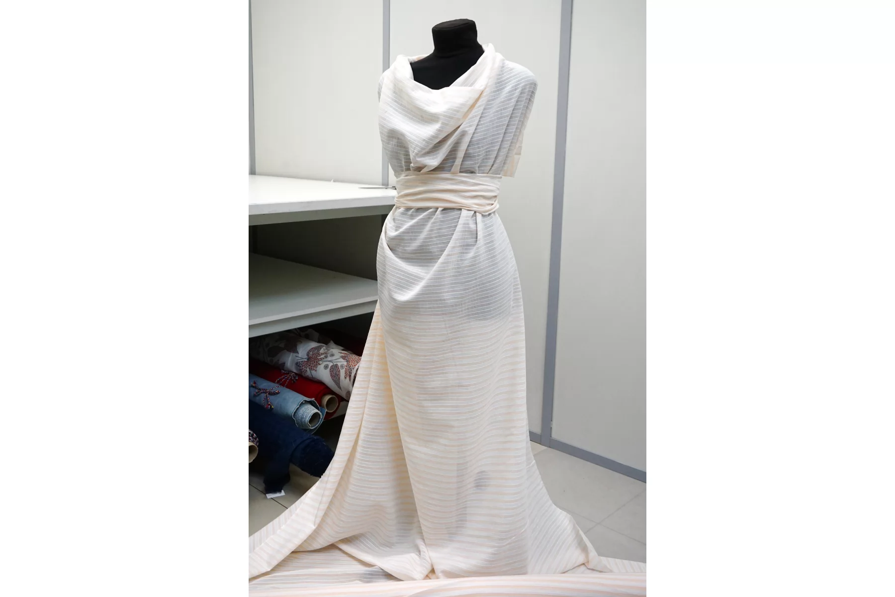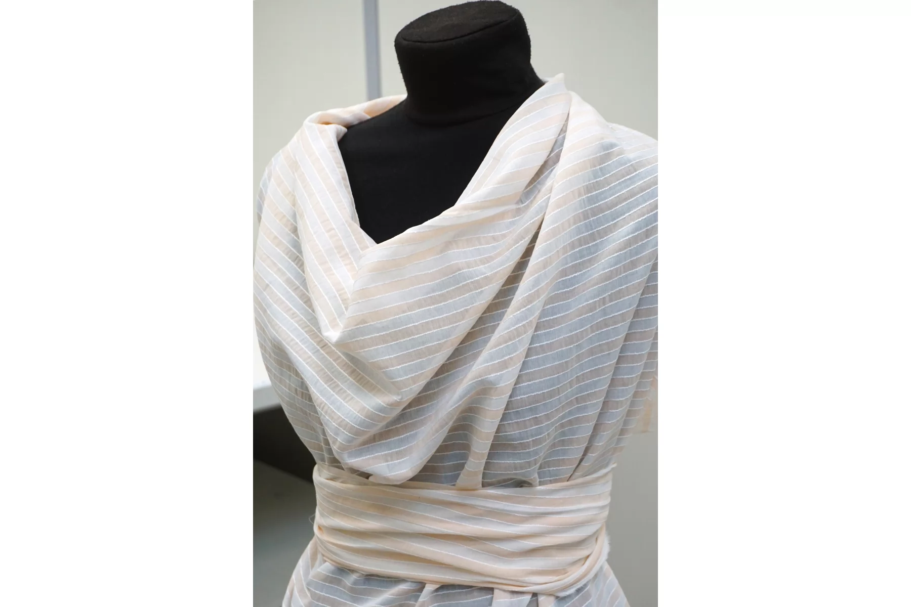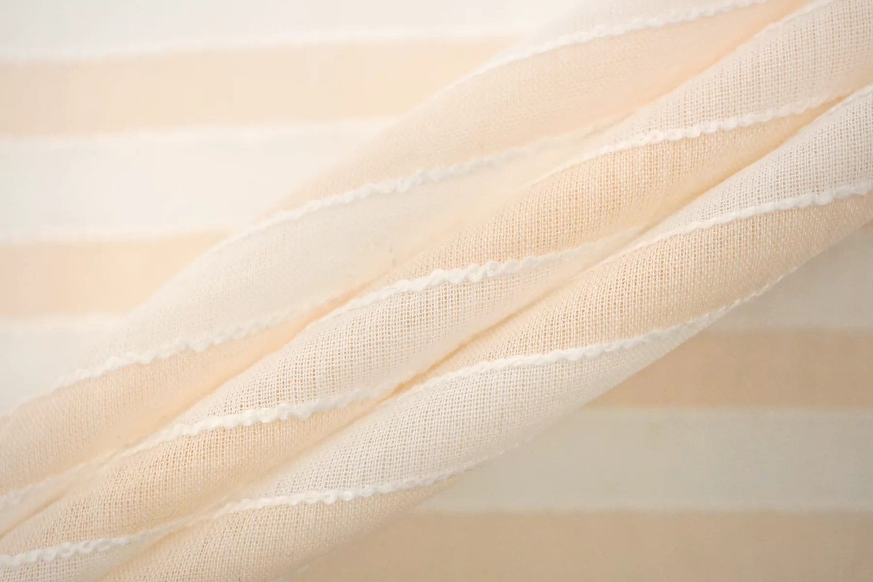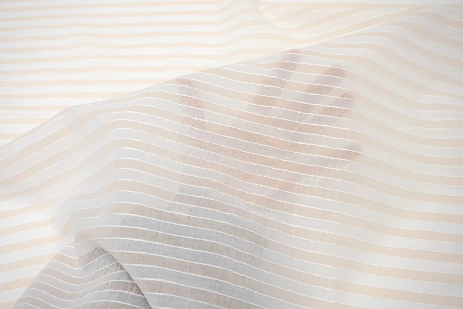 Интересный батист из хлопка, с узором-полоской, нити белого и нежно-персикового цвета, плюс проходит фактурная белая прострочка (поперек кромки). Тактильно очень мягкий, воздушный, легкий гладкий и приятный. Не тянется, сминается. Просвечивает. Отлично подойдет на свободные рубашки, блузки, многослойные платья или юбки. Уход деликатный, шьем тонкими иглами.