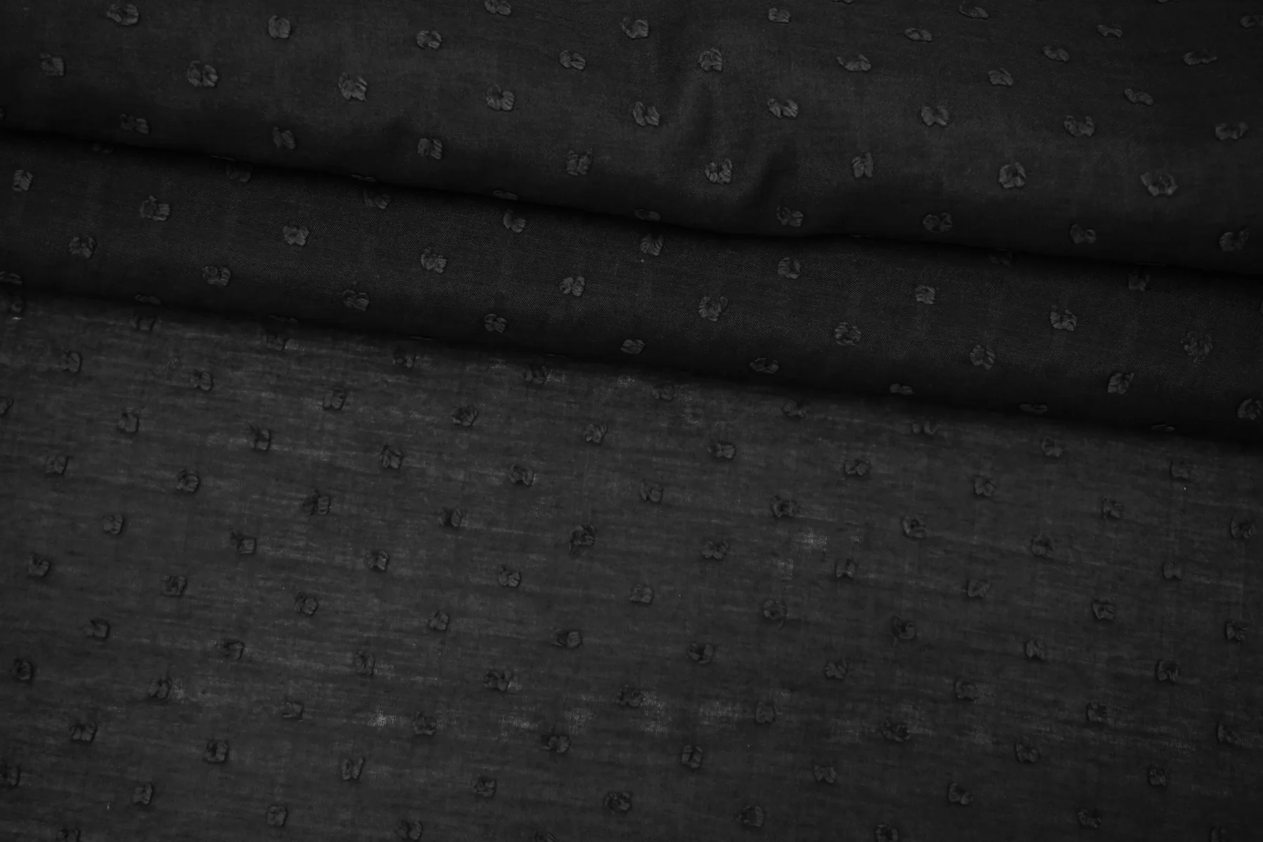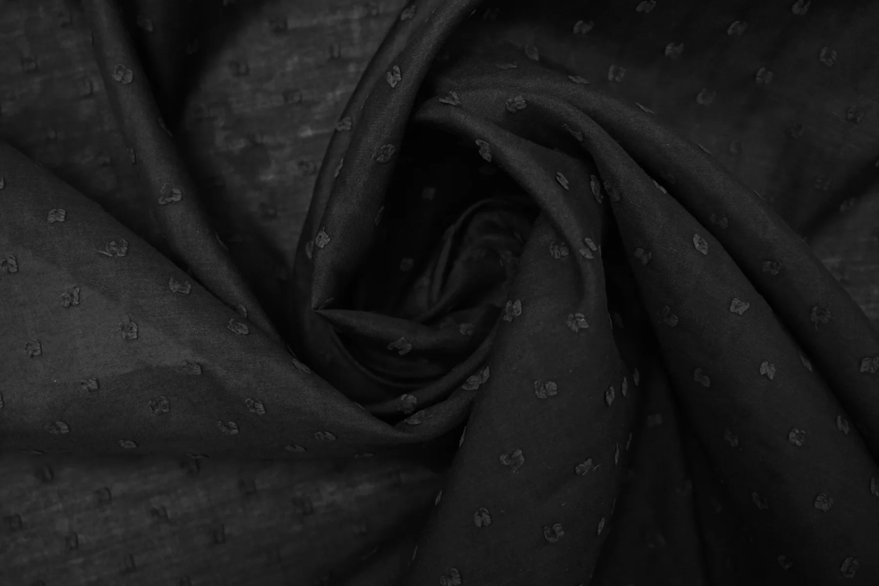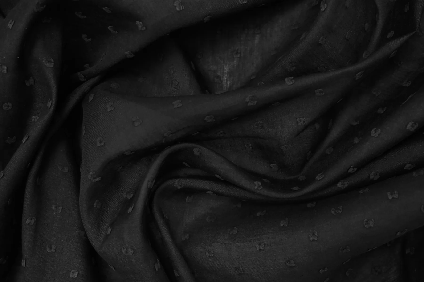 Батист чёрного цвета в чёрную мушку-филькупе из хлопка и шёлка. Материал гладкий, мягкий, тонкий, приятный тактильно. Мнется. Просвечивает. Не тянется. Пластичный, форму не держит. Прекрасный вариант на рубашки, туники, юбки, платья и не только. В юбках и платьях лучше использовать с подкладкой. Материал дает усадку.