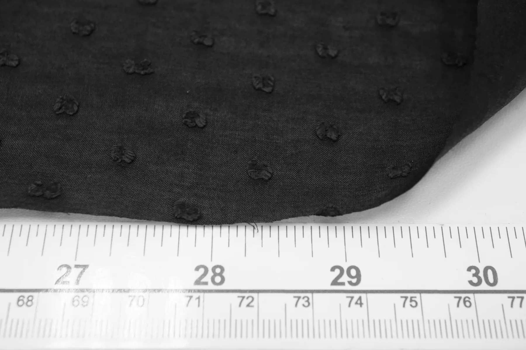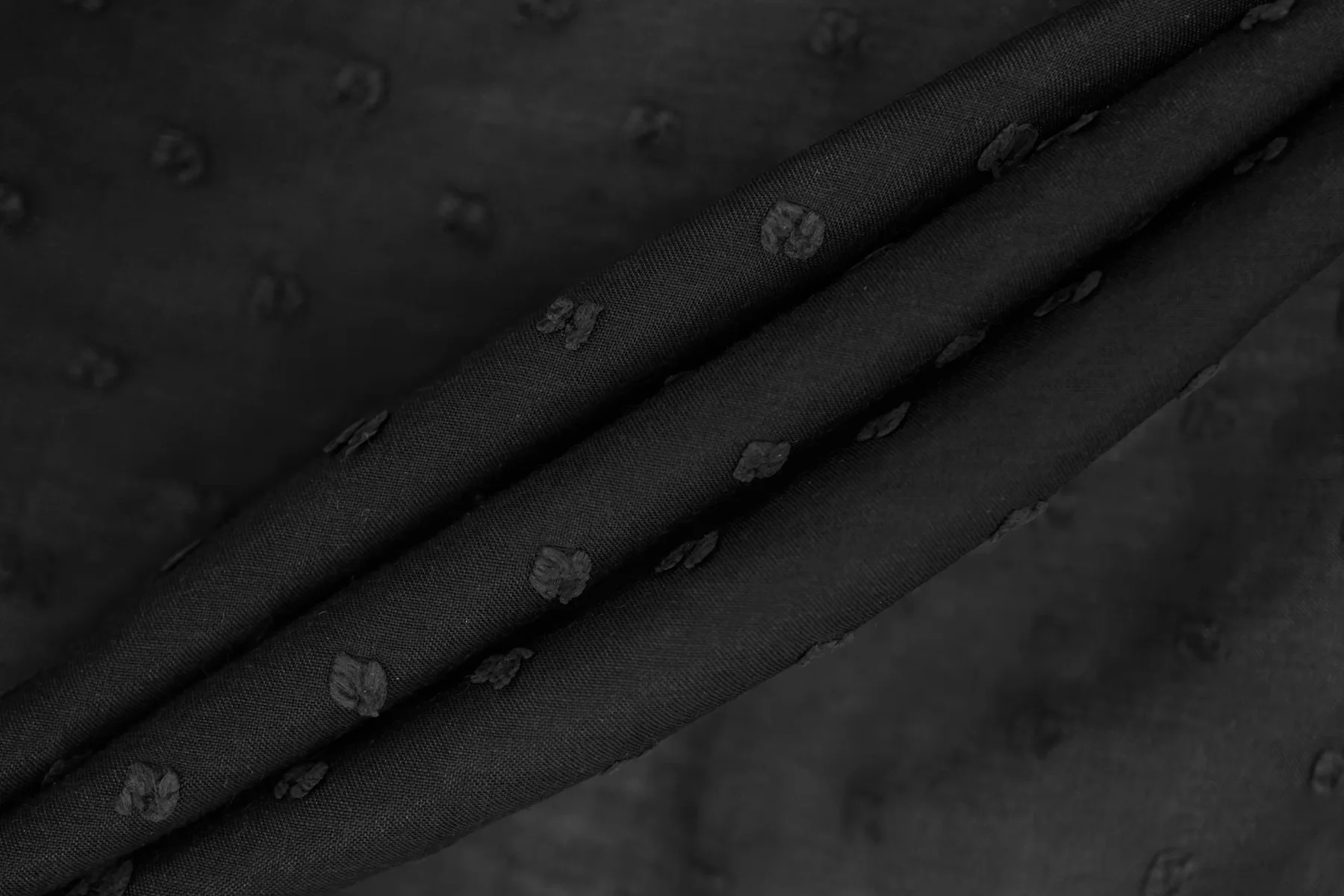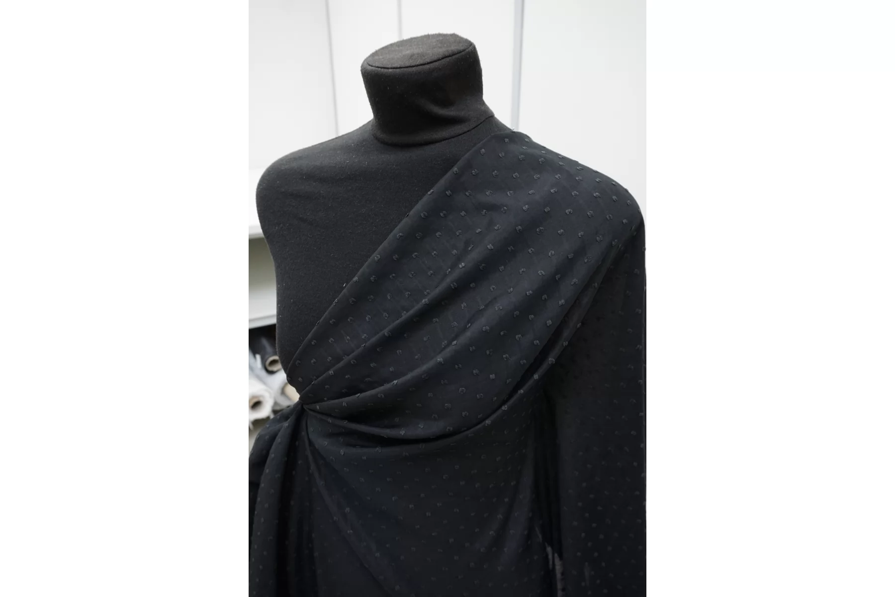 Батист чёрного цвета в чёрную мушку-филькупе из хлопка и шёлка. Материал гладкий, мягкий, тонкий, приятный тактильно. Мнется. Просвечивает. Не тянется. Пластичный, форму не держит. Прекрасный вариант на рубашки, туники, юбки, платья и не только. В юбках и платьях лучше использовать с подкладкой. Материал дает усадку.
