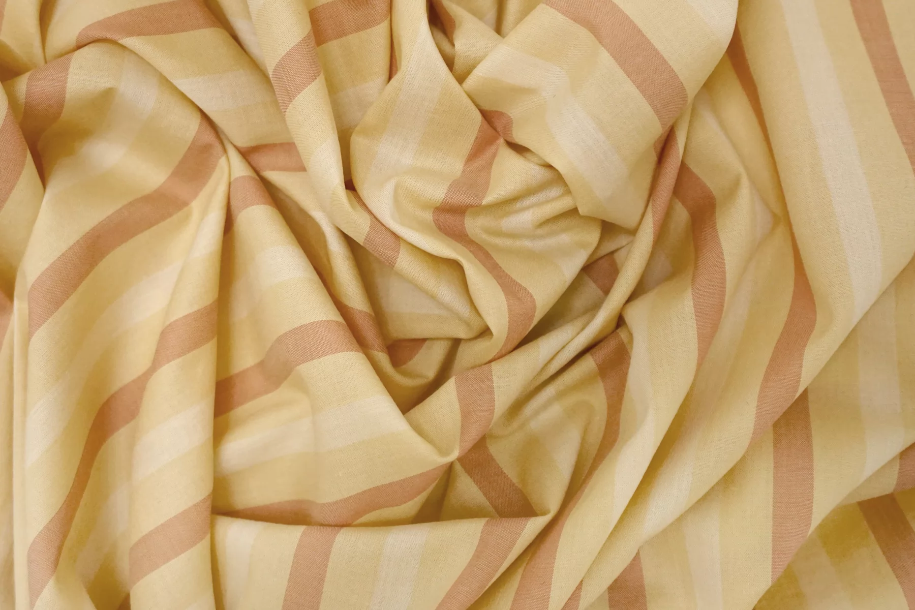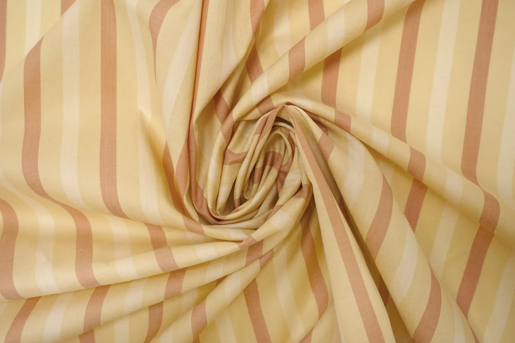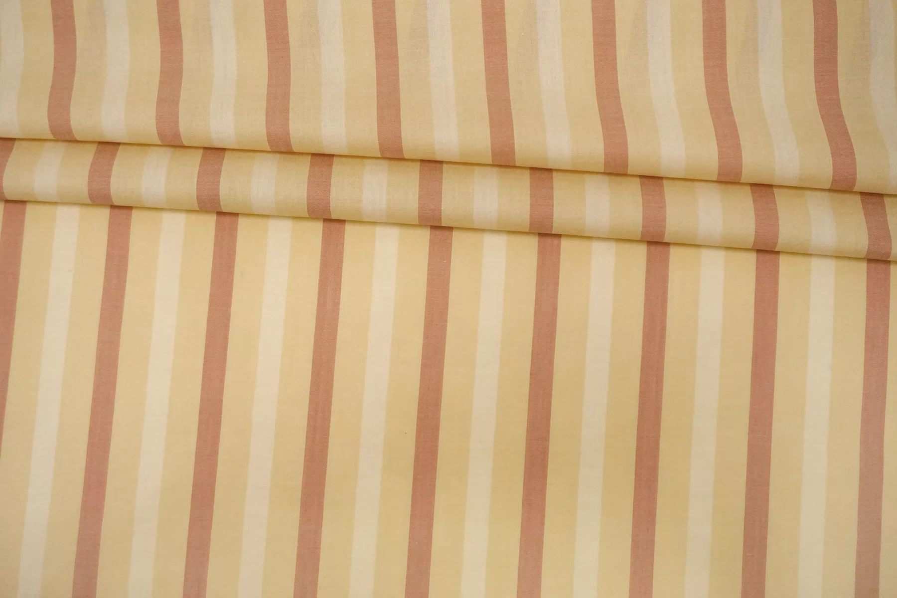 Тонкий хлопковый батист с принтом-полоской, нити светло-бежевого, выбеленно-жёлтого и выбеленно-терракотового цвета. Материал полупрозрачный. Тактильно приятный и мягкий, легкий. Не тянется, немного держит форму. Шьем платья, юбки, сарафаны и рубашки. При необходимости используйте подкладочный материал. Учитывайте возможную усадку