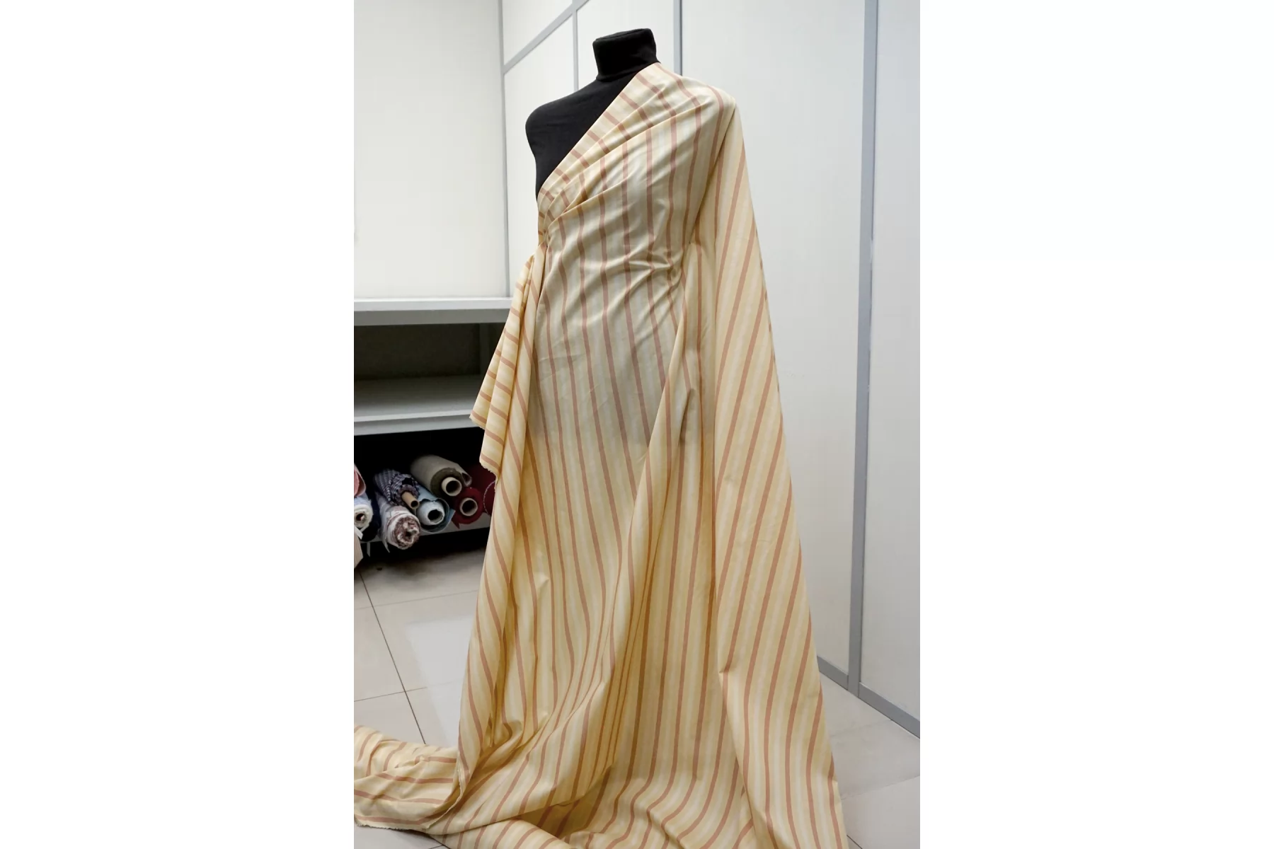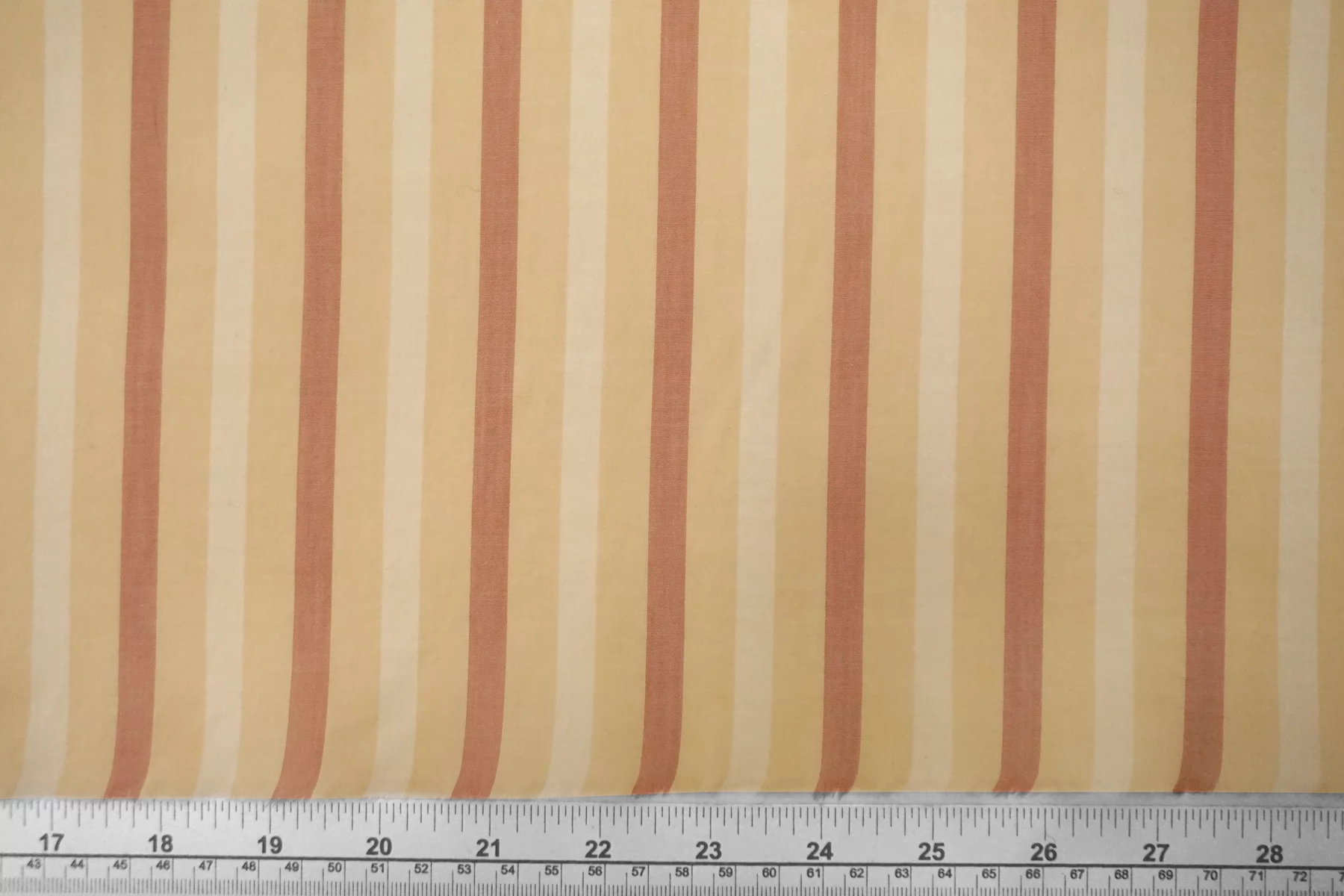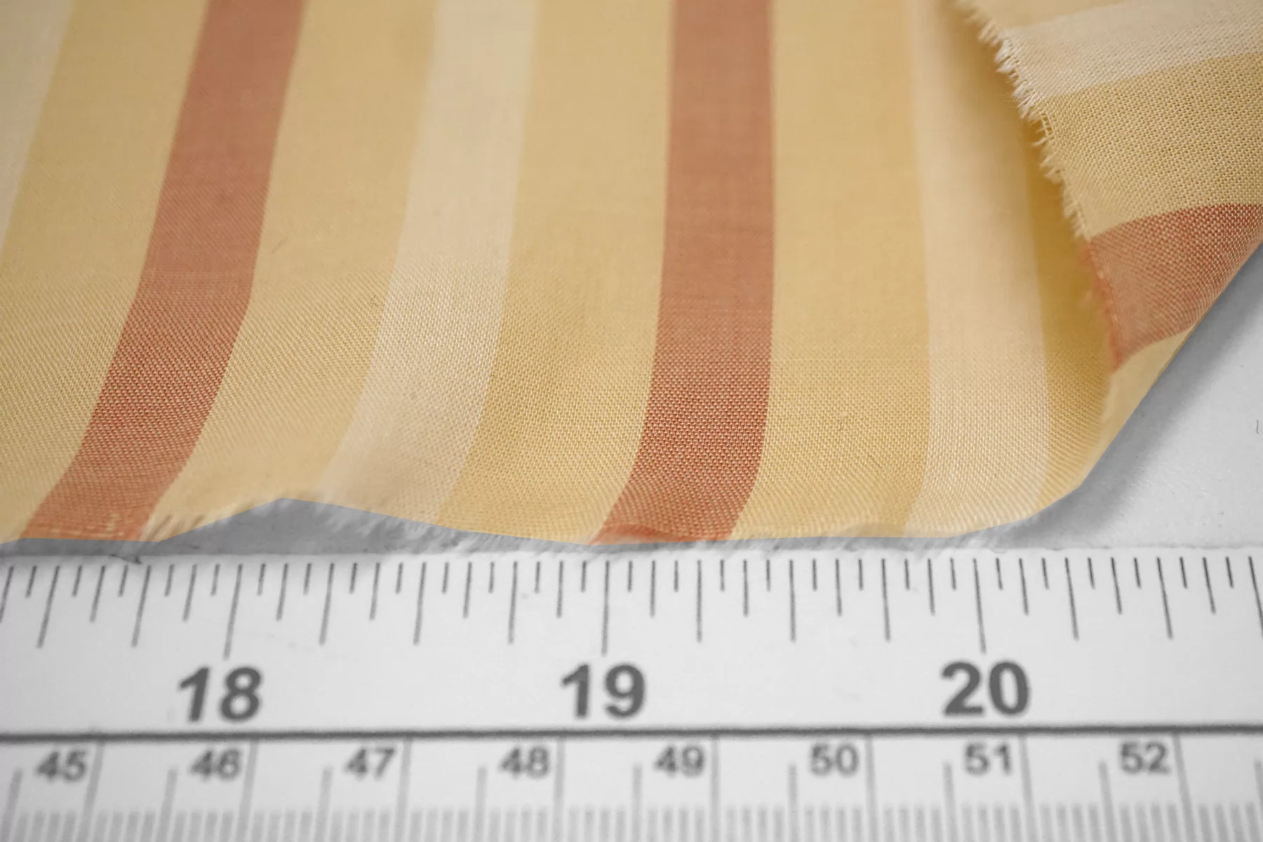 Тонкий хлопковый батист с принтом-полоской, нити светло-бежевого, выбеленно-жёлтого и выбеленно-терракотового цвета. Материал полупрозрачный. Тактильно приятный и мягкий, легкий. Не тянется, немного держит форму. Шьем платья, юбки, сарафаны и рубашки. При необходимости используйте подкладочный материал. Учитывайте возможную усадку