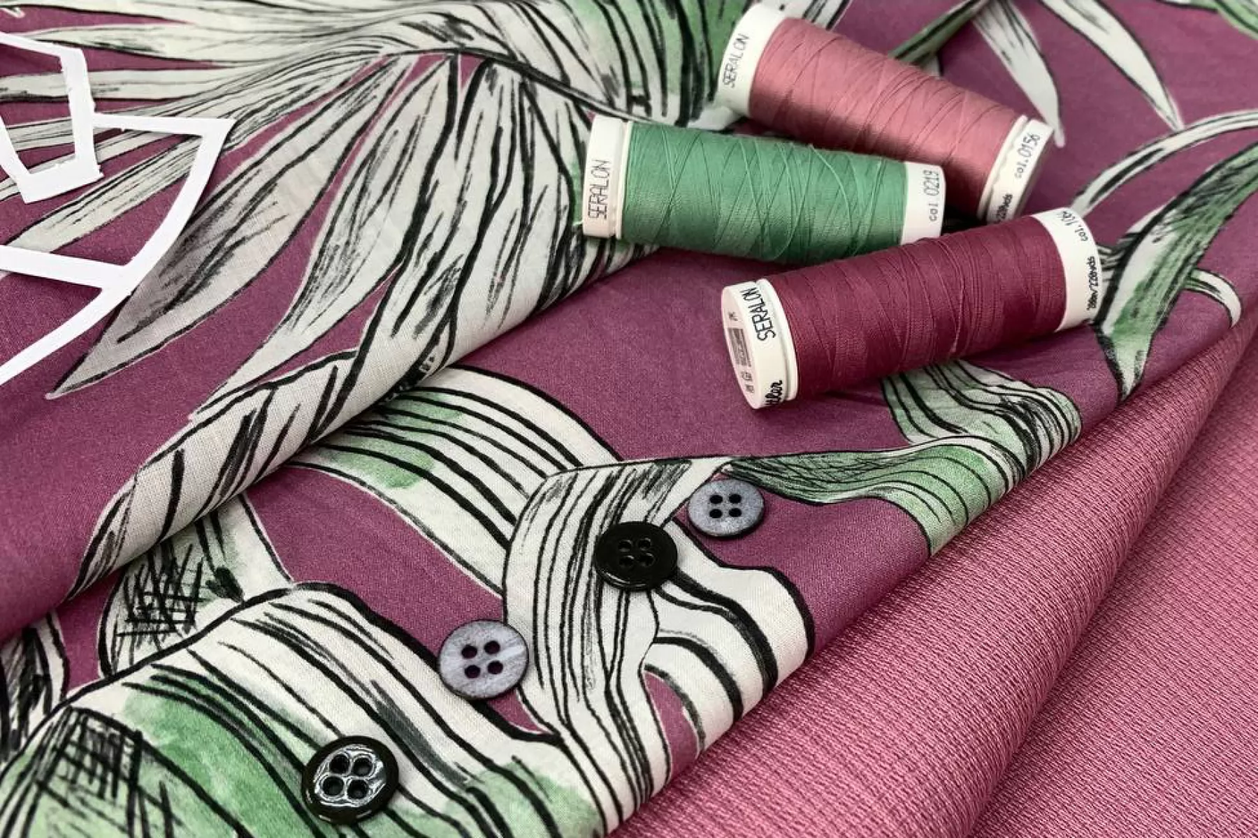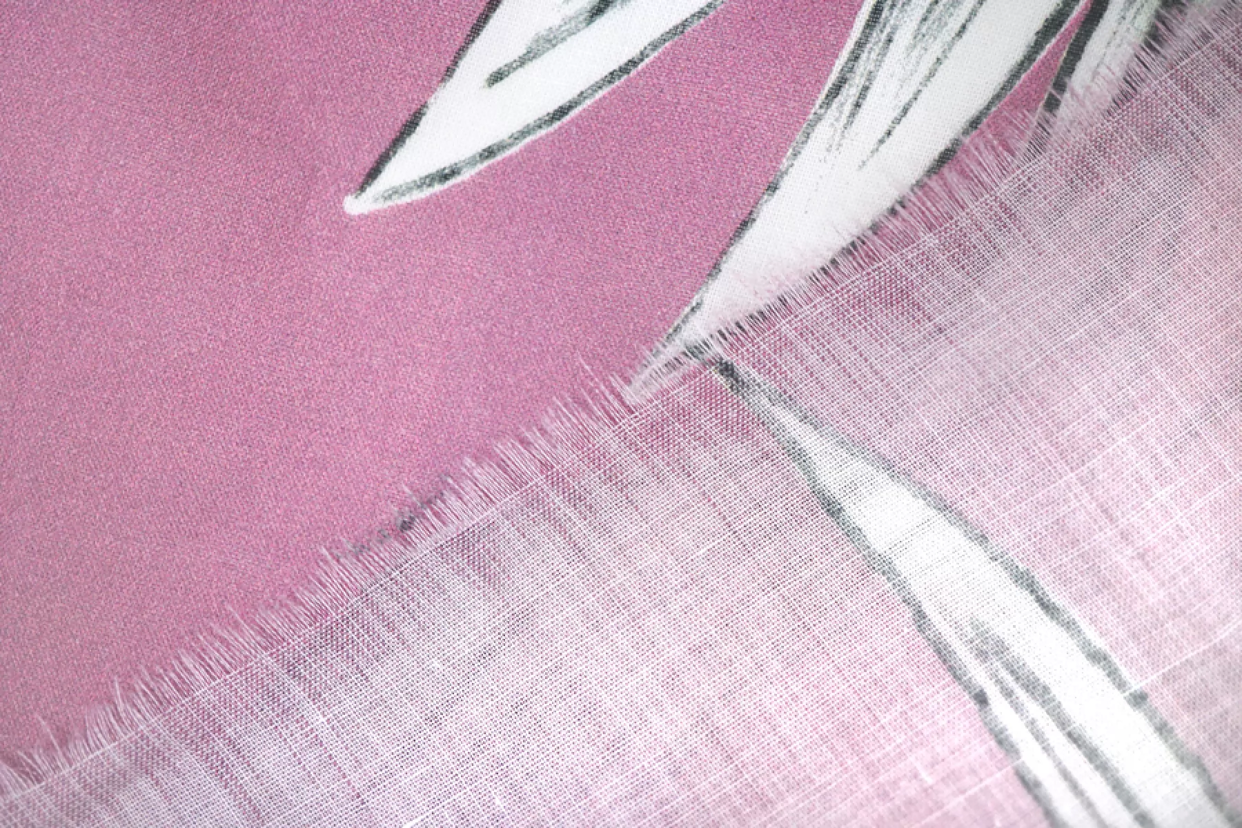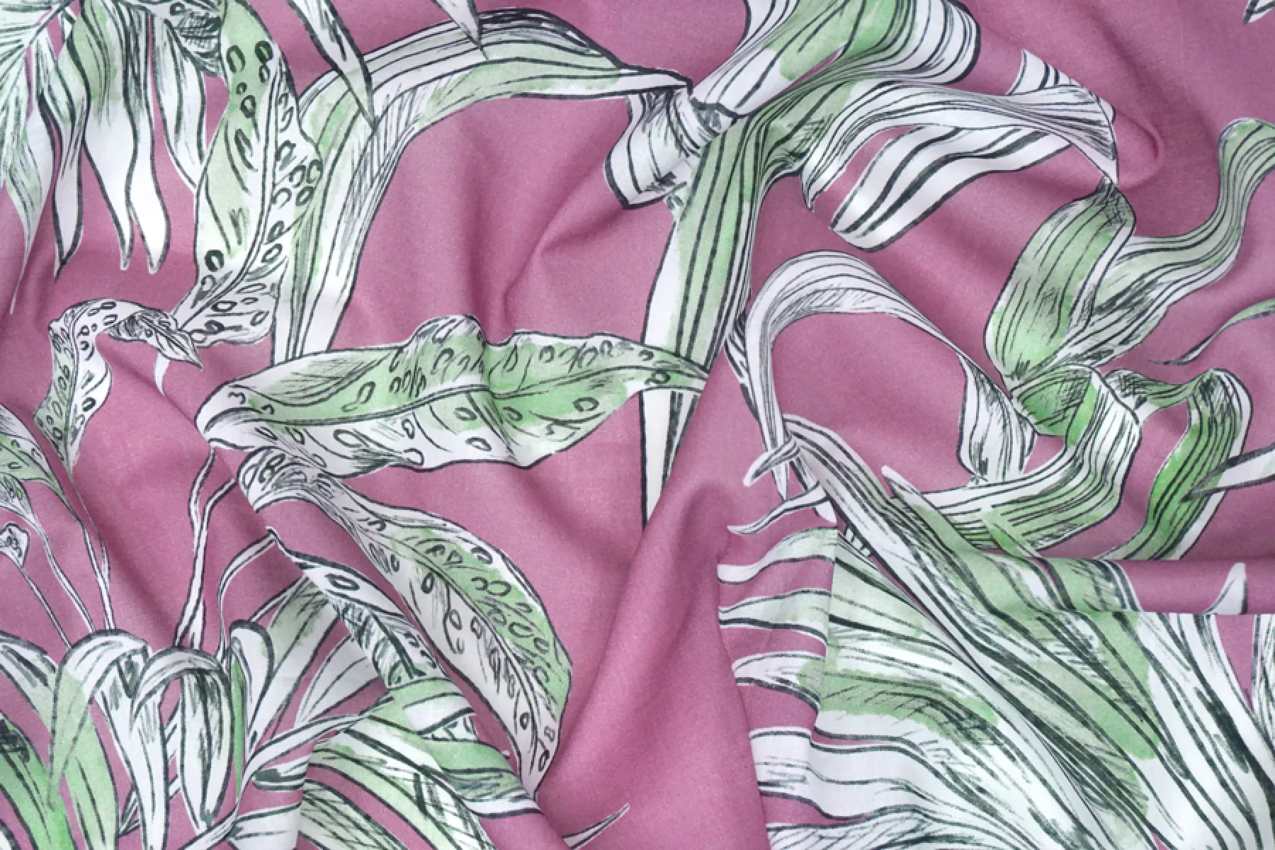 Хлопковыйбатист в оттенке припыленной фуксии с достаточно крупным принтом листьев в бело-зеленых оттенках. Материал приятный, мягкий, тонкий, легкий, летящий. Просвечивает силуэт. Совсем слегка пружинит за счет плетения. Мнется, как хлопок. Хорошо держит форму и драпируется. Отлично подойдет на свободные рубашки, платья, юбки и не только. При необходимости используйте подкладочный материал.