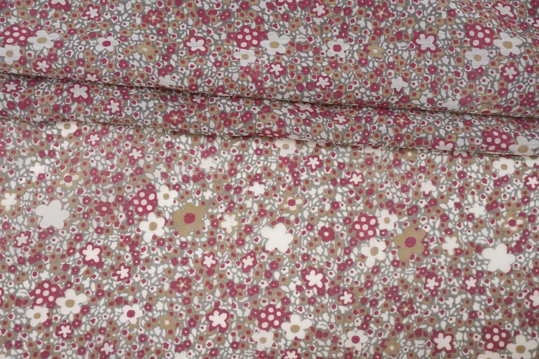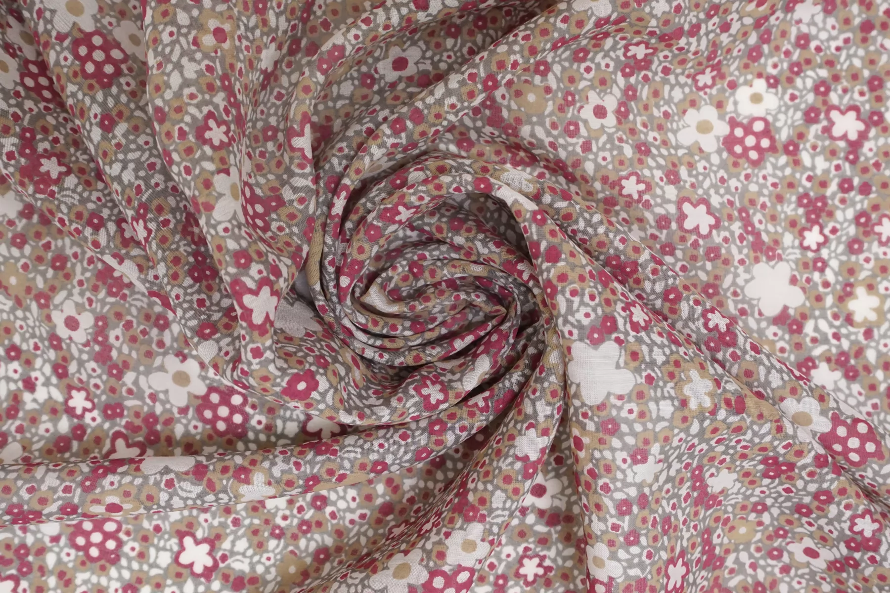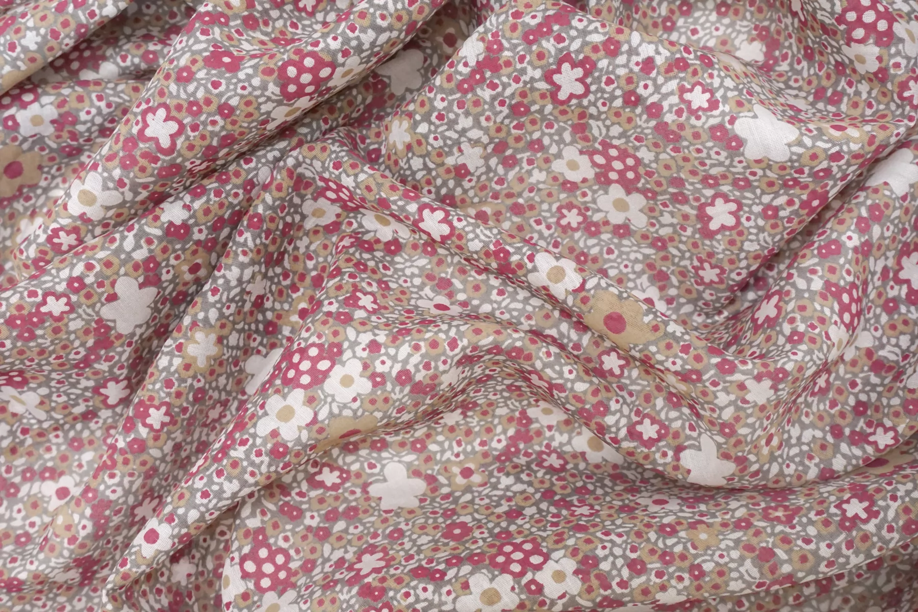 Батист из хлопка с шелком, принт стилизованный цветочный на сером фоне. Сочетание белого, бежевого, ягодного цвета. Тактильно очень мягкий, воздушный, легкий гладкий и приятный, ощущается шелк. Не тянется, слегка сминается. Просвечивает. Форму не держит. Отлично подойдет на свободные рубашки, блузки, многослойные платья или юбки. Уход деликатный, шьем тонкими иглами.