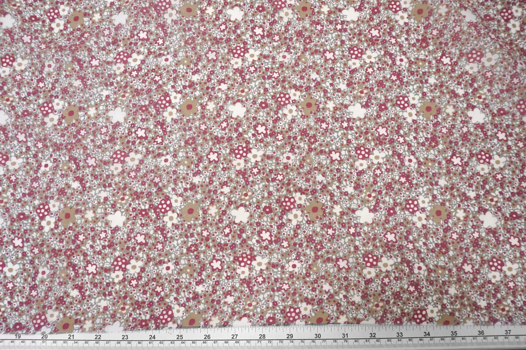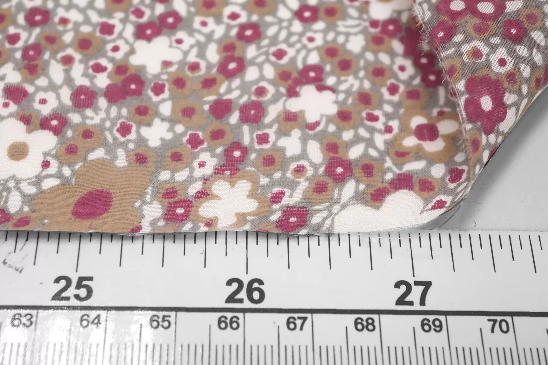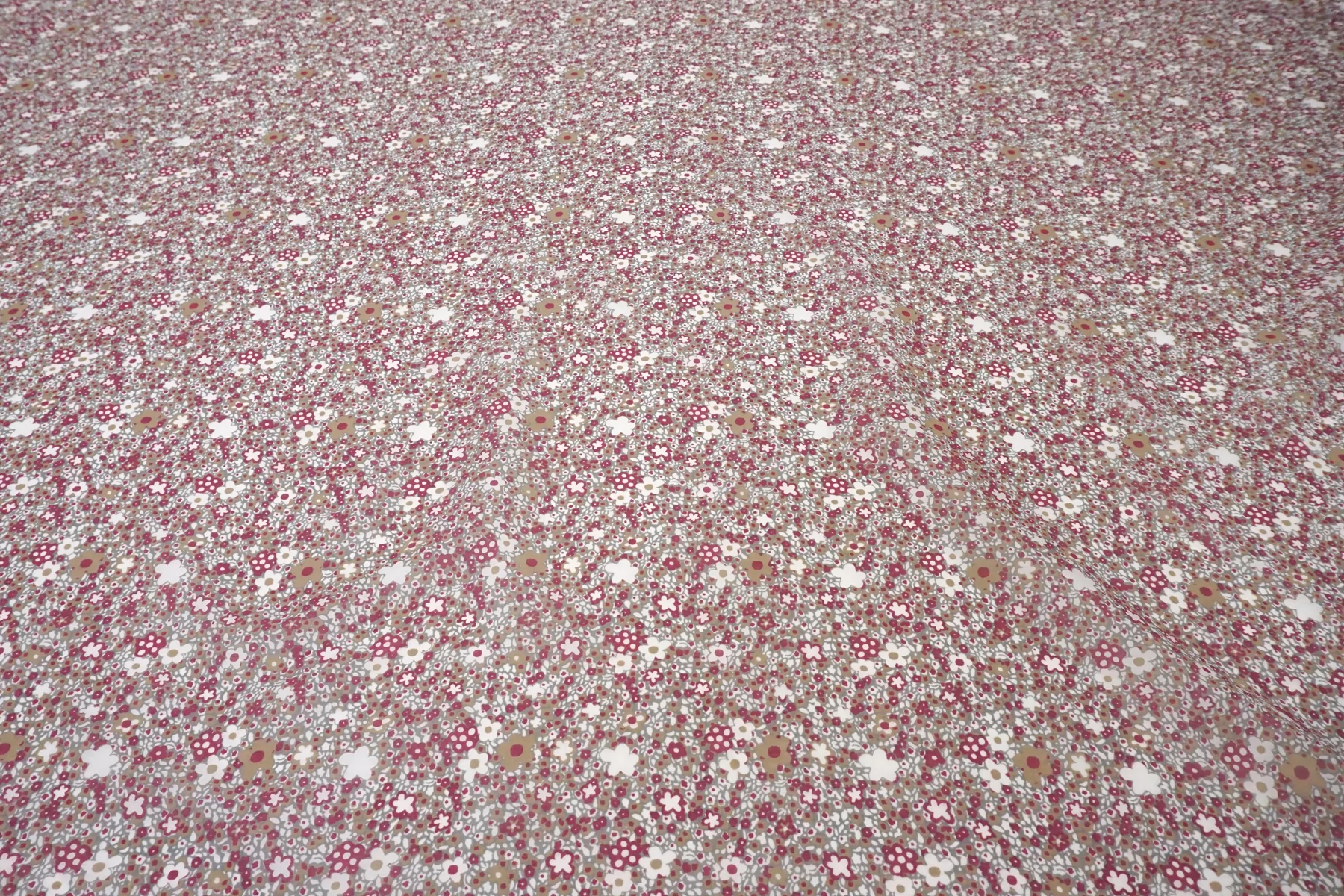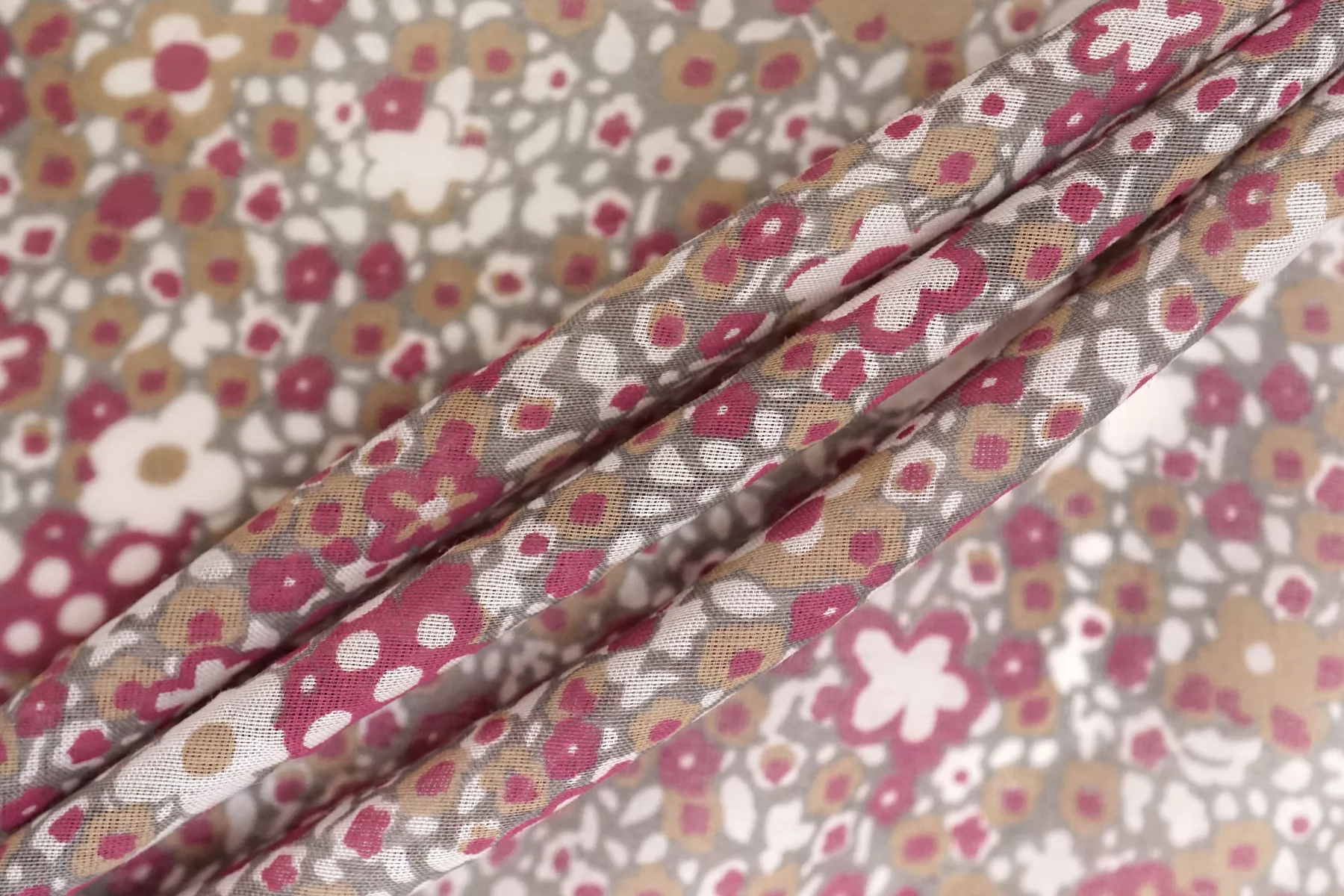 Батист из хлопка с шелком, принт стилизованный цветочный на сером фоне. Сочетание белого, бежевого, ягодного цвета. Тактильно очень мягкий, воздушный, легкий гладкий и приятный, ощущается шелк. Не тянется, слегка сминается. Просвечивает. Форму не держит. Отлично подойдет на свободные рубашки, блузки, многослойные платья или юбки. Уход деликатный, шьем тонкими иглами.