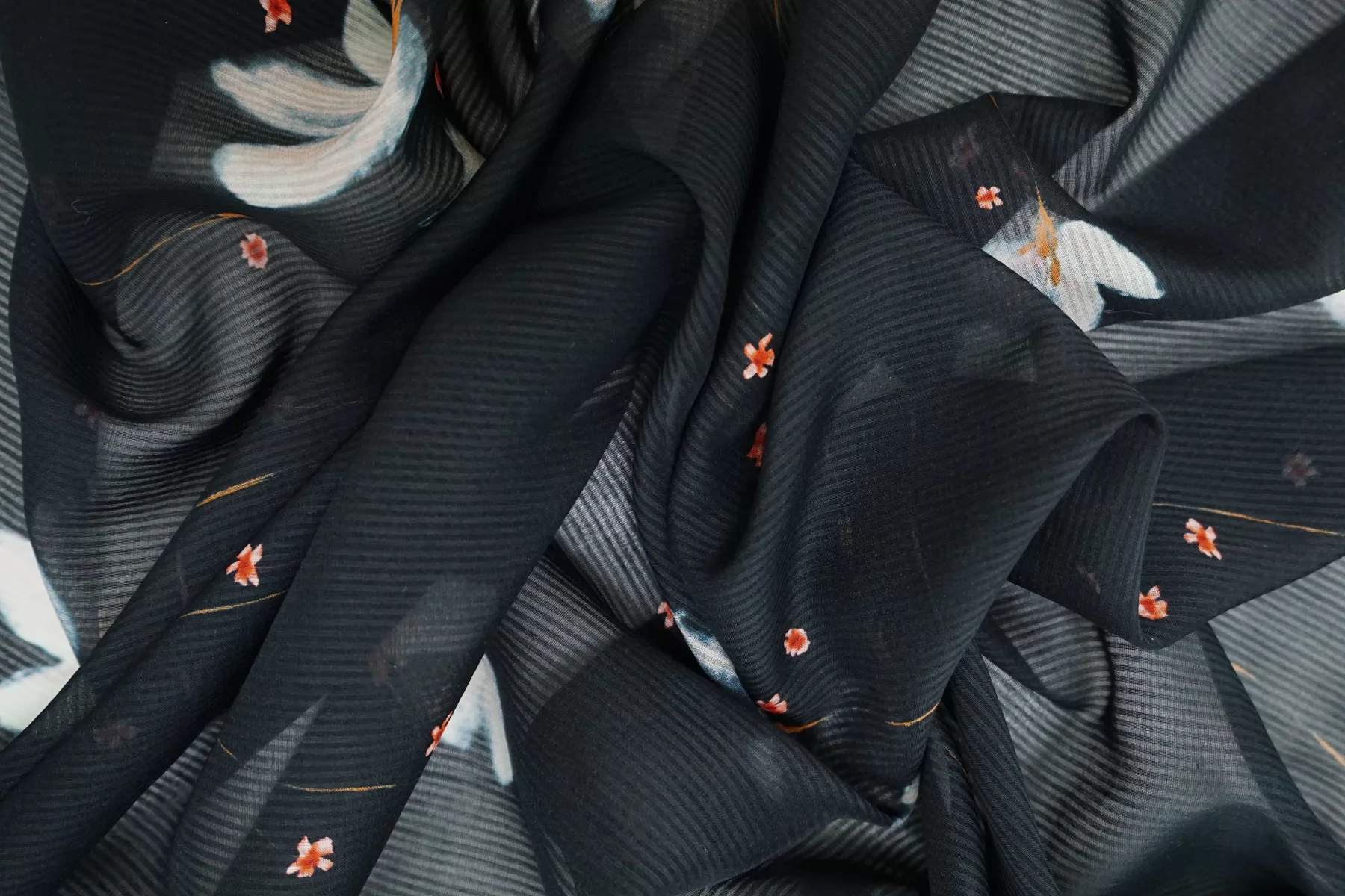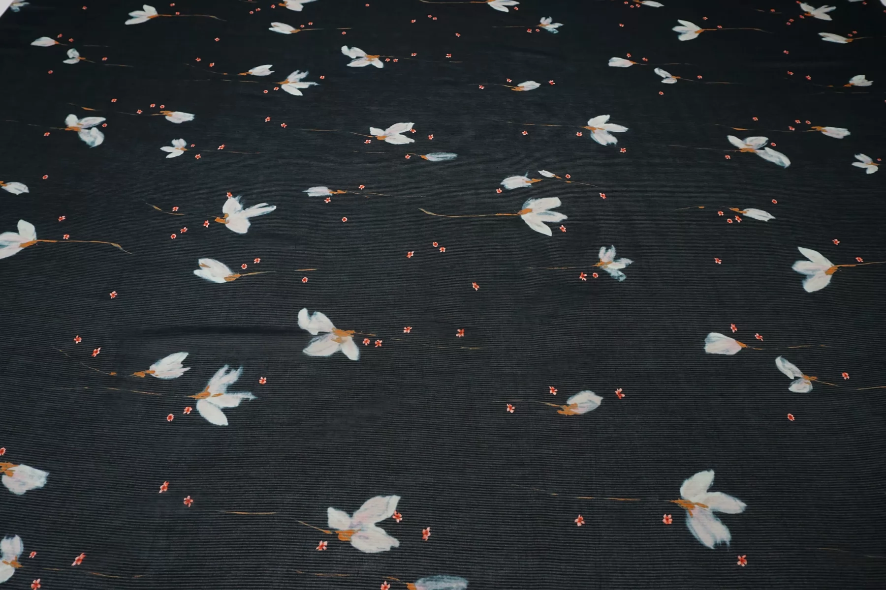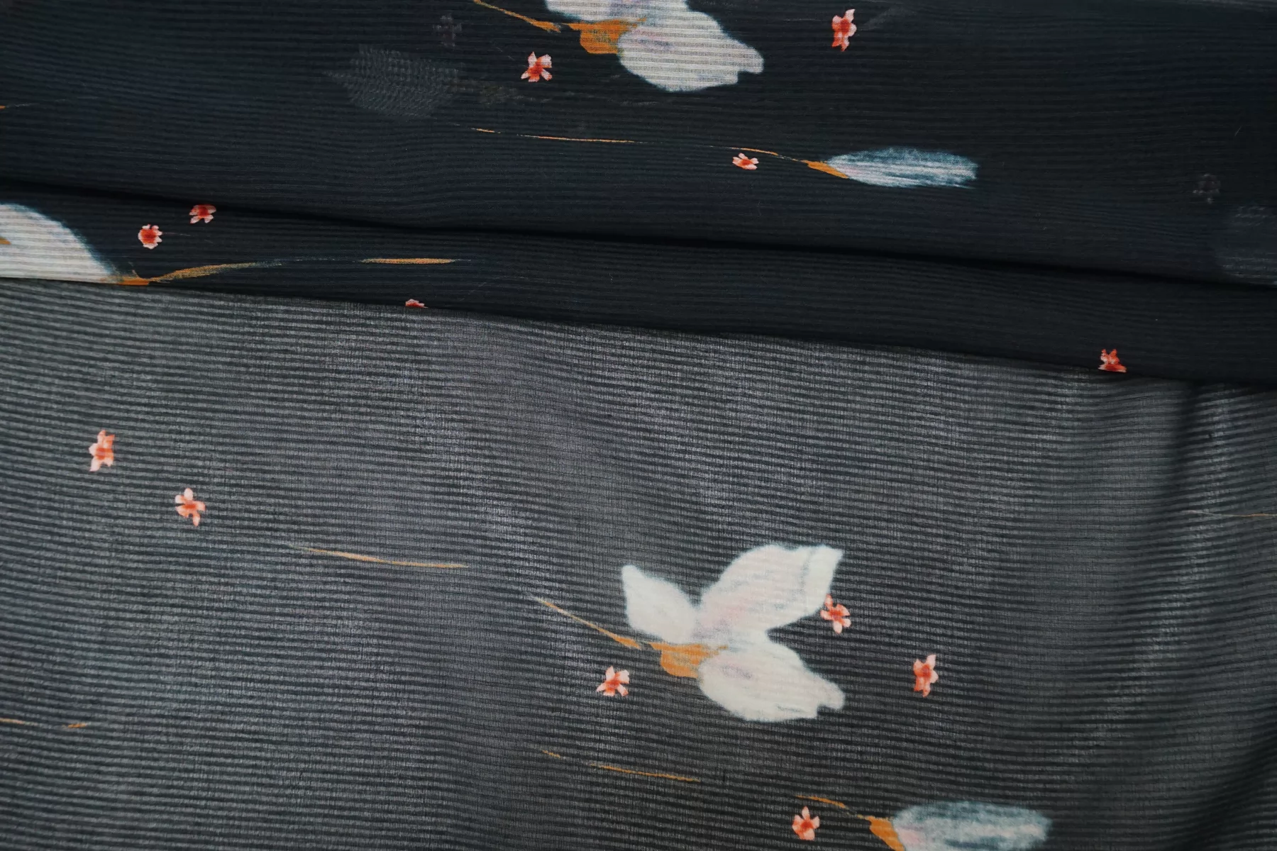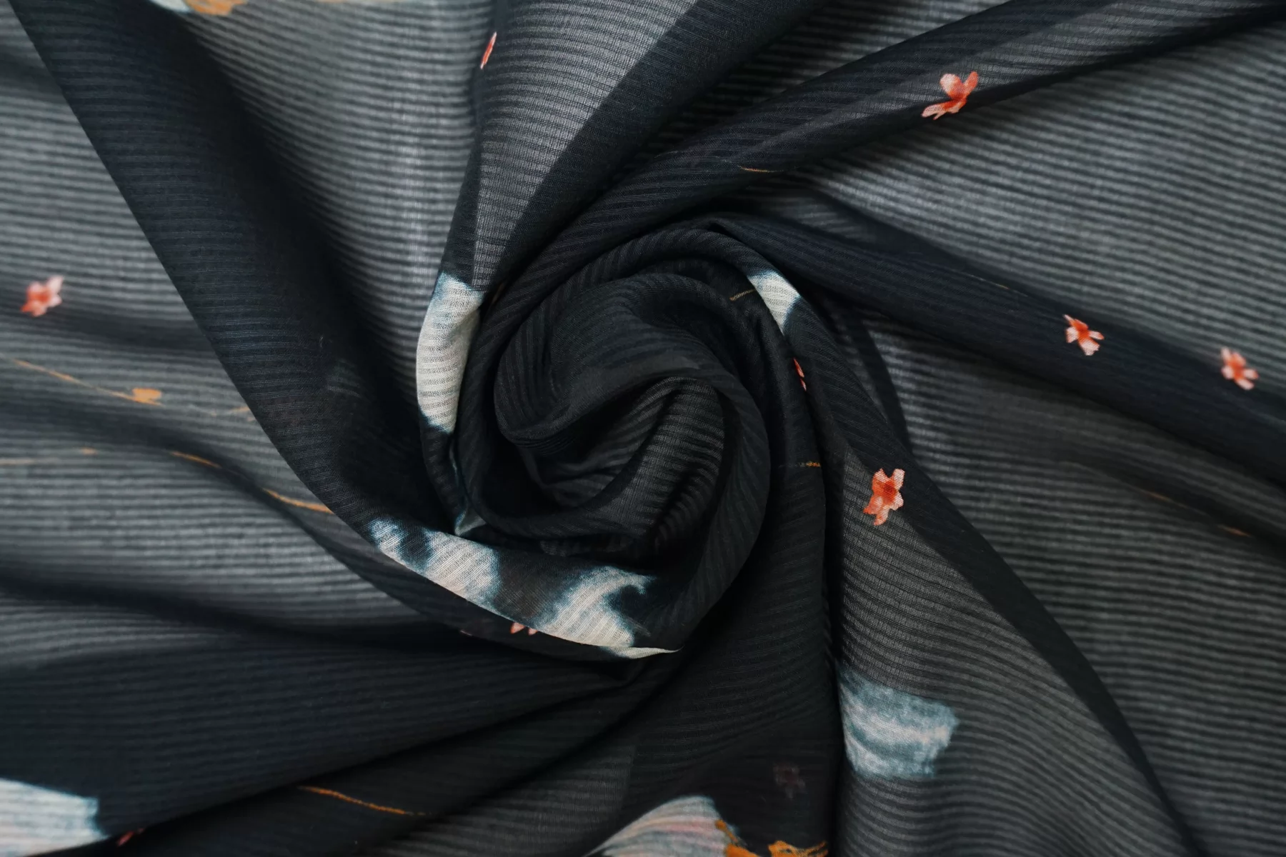 Шикарный итальянский батист из шёлка с хлопком, нежный цветочный принт на тёмно-синем фоне, плюс плетение образовывает узор-полоска. Полоска проходит поперек кромки, расположение принта подразумевает крой поперек. Тактильно очень мягкий, воздушный, легкий гладкий и приятный, ощущается шелк. Не тянется, слегка сминается. Просвечивает. Форму не держит. Отлично подойдет на свободные рубашки, блузки, многослойные платья или юбки. Уход деликатный, шьем тонкими иглами.