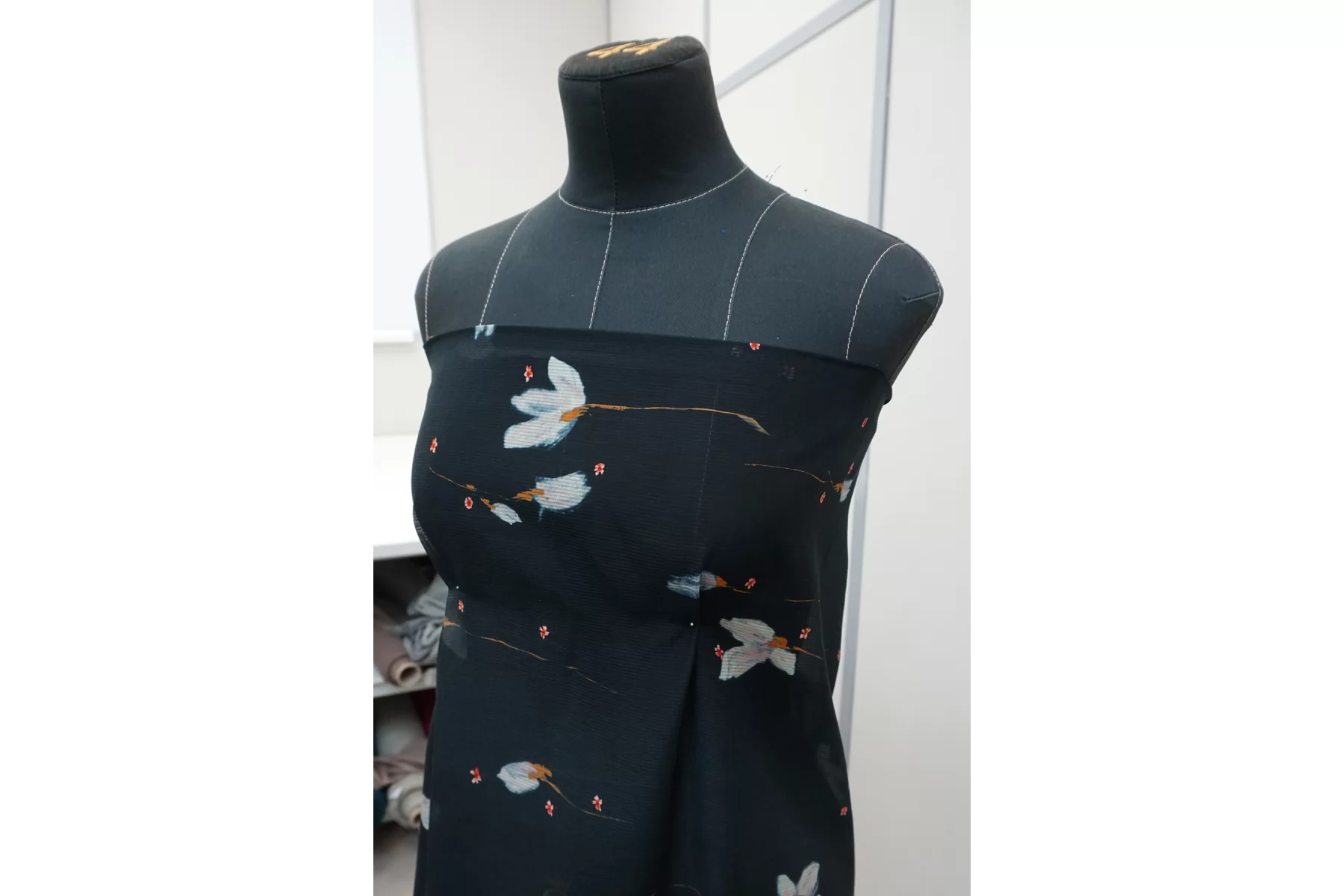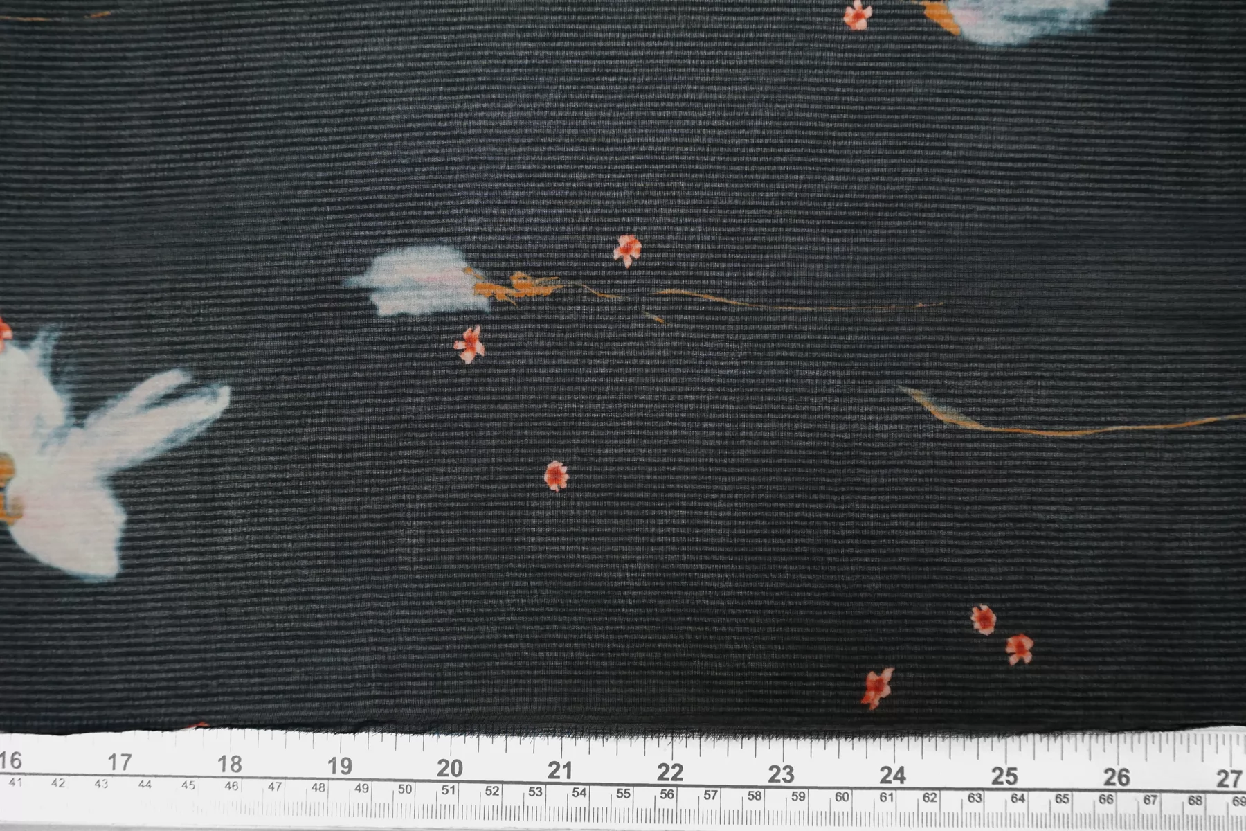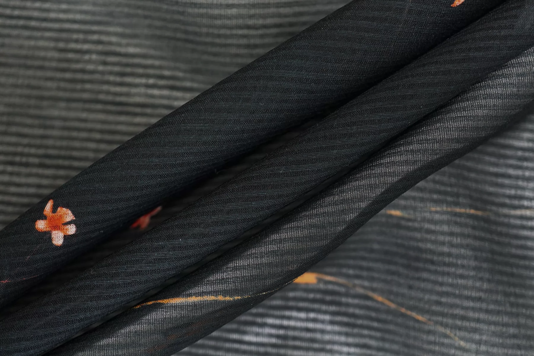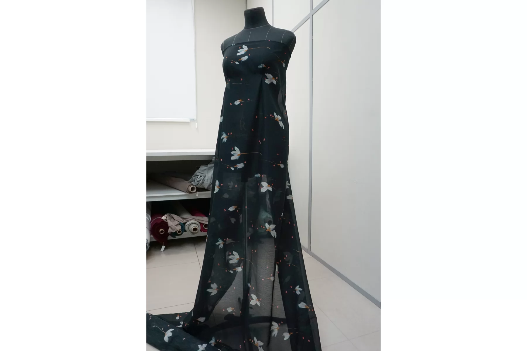Шикарный итальянский батист из шёлка с хлопком, нежный цветочный принт на тёмно-синем фоне, плюс плетение образовывает узор-полоска. Полоска проходит поперек кромки, расположение принта подразумевает крой поперек. Тактильно очень мягкий, воздушный, легкий гладкий и приятный, ощущается шелк. Не тянется, слегка сминается. Просвечивает. Форму не держит. Отлично подойдет на свободные рубашки, блузки, многослойные платья или юбки. Уход деликатный, шьем тонкими иглами.