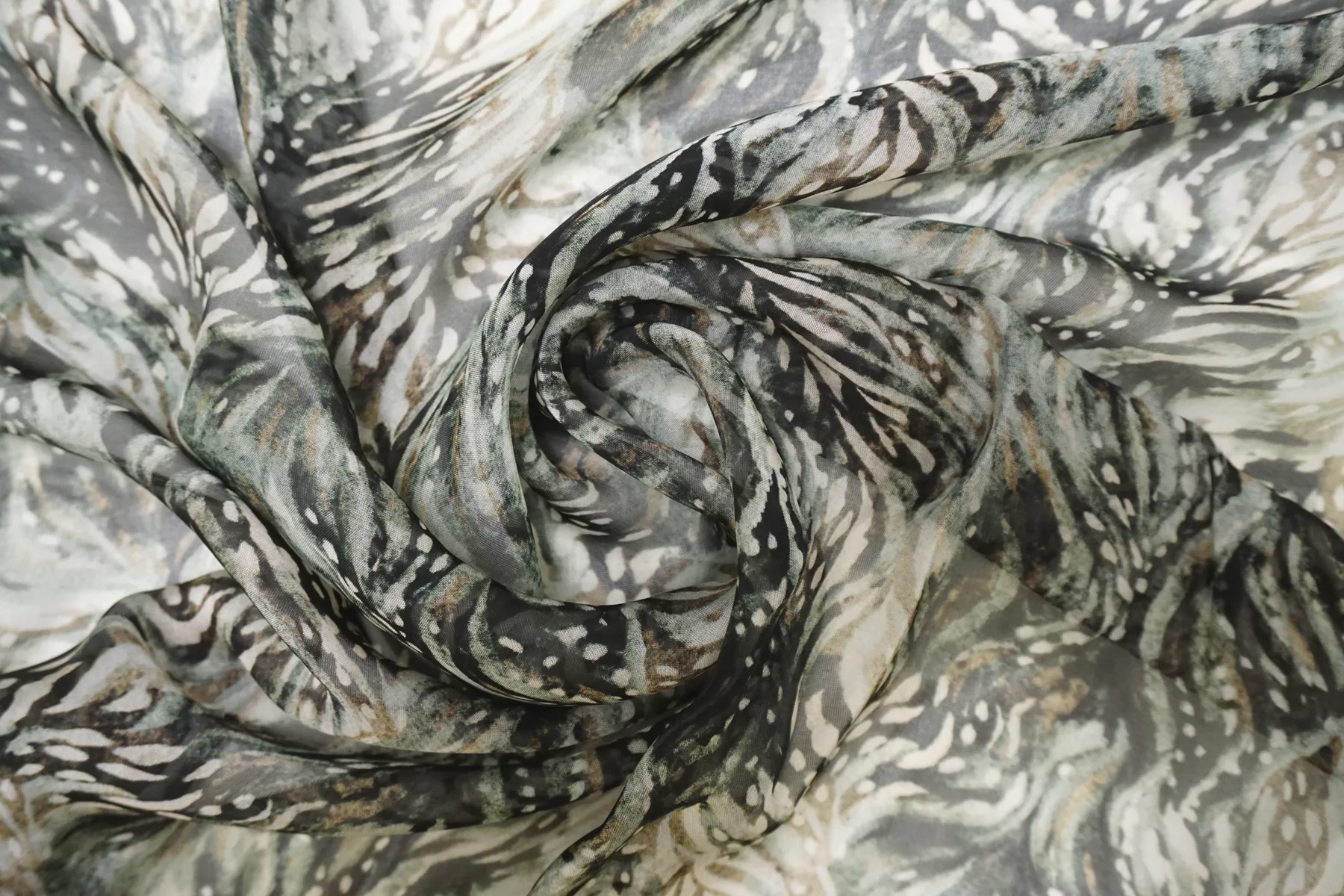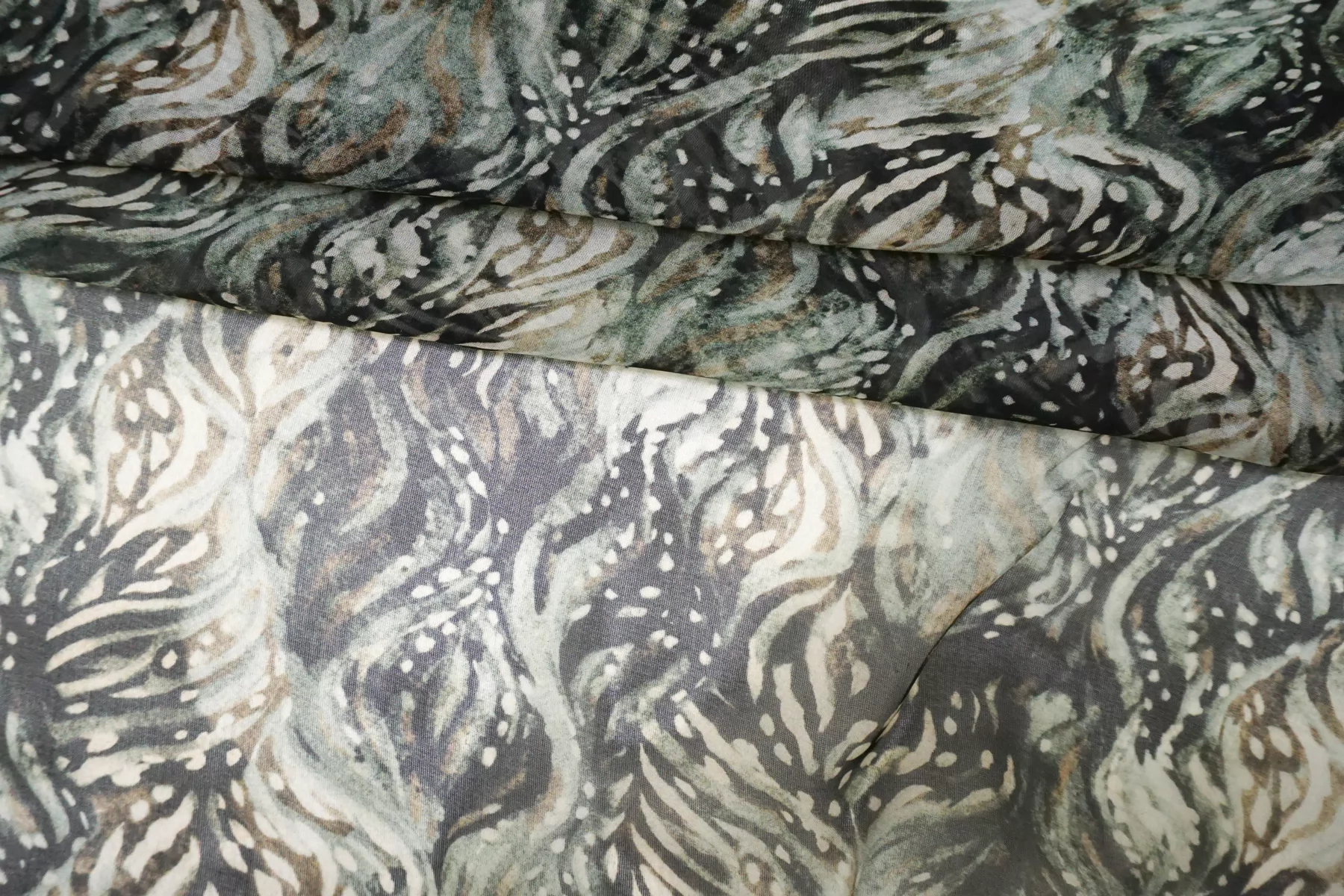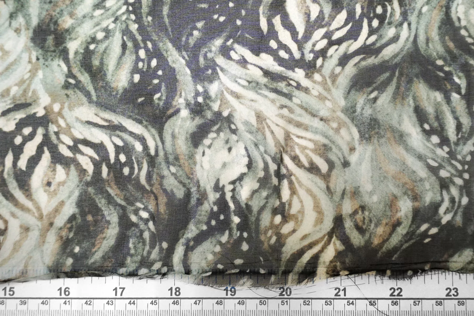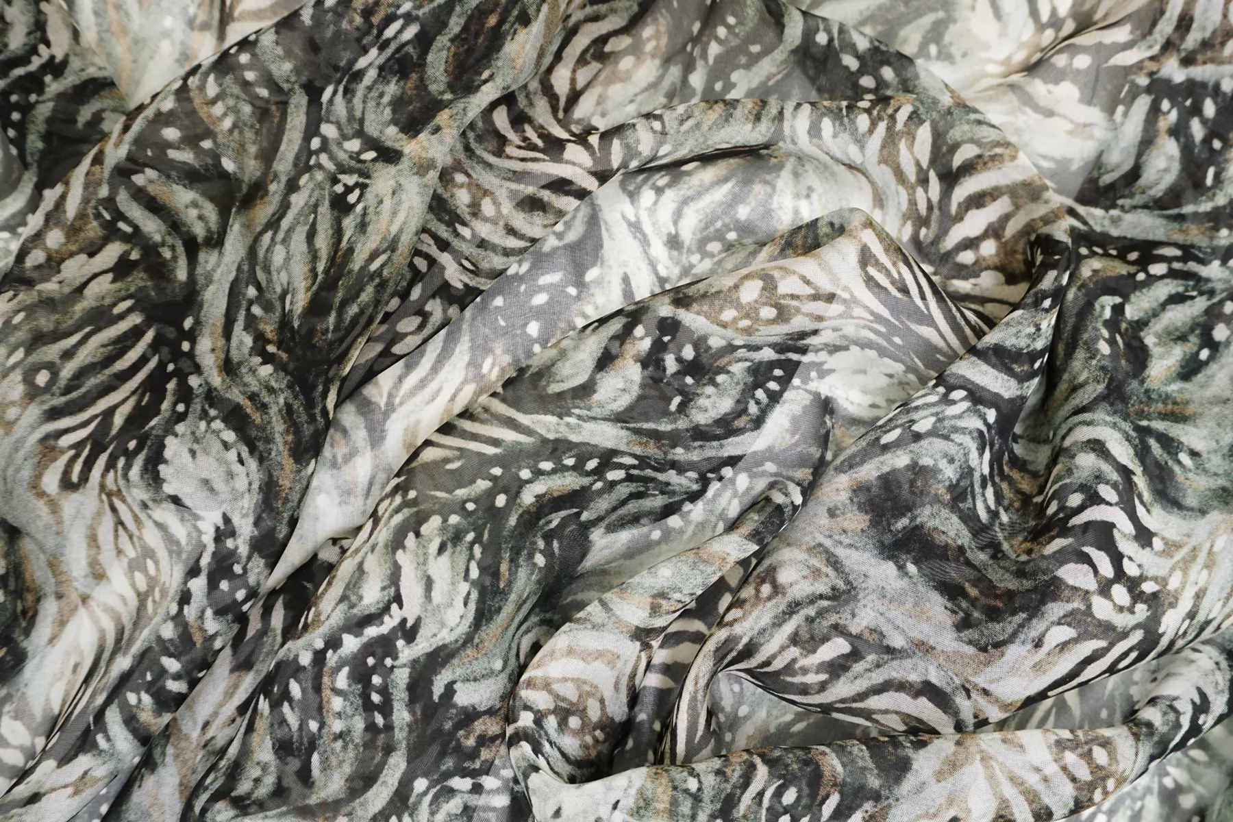 Шикарный итальянский батист из шёлка с хлопком, с приглушенно зеленоватым абстрактным принтом. Тактильно очень мягкий, воздушный, легкий гладкий и приятный, ощущается шелк. Не тянется, слегка сминается. Просвечивает. Форму не держит. Отлично подойдет на свободные рубашки, блузки, многослойные платья или юбки. Уход деликатный, шьем тонкими иглами.