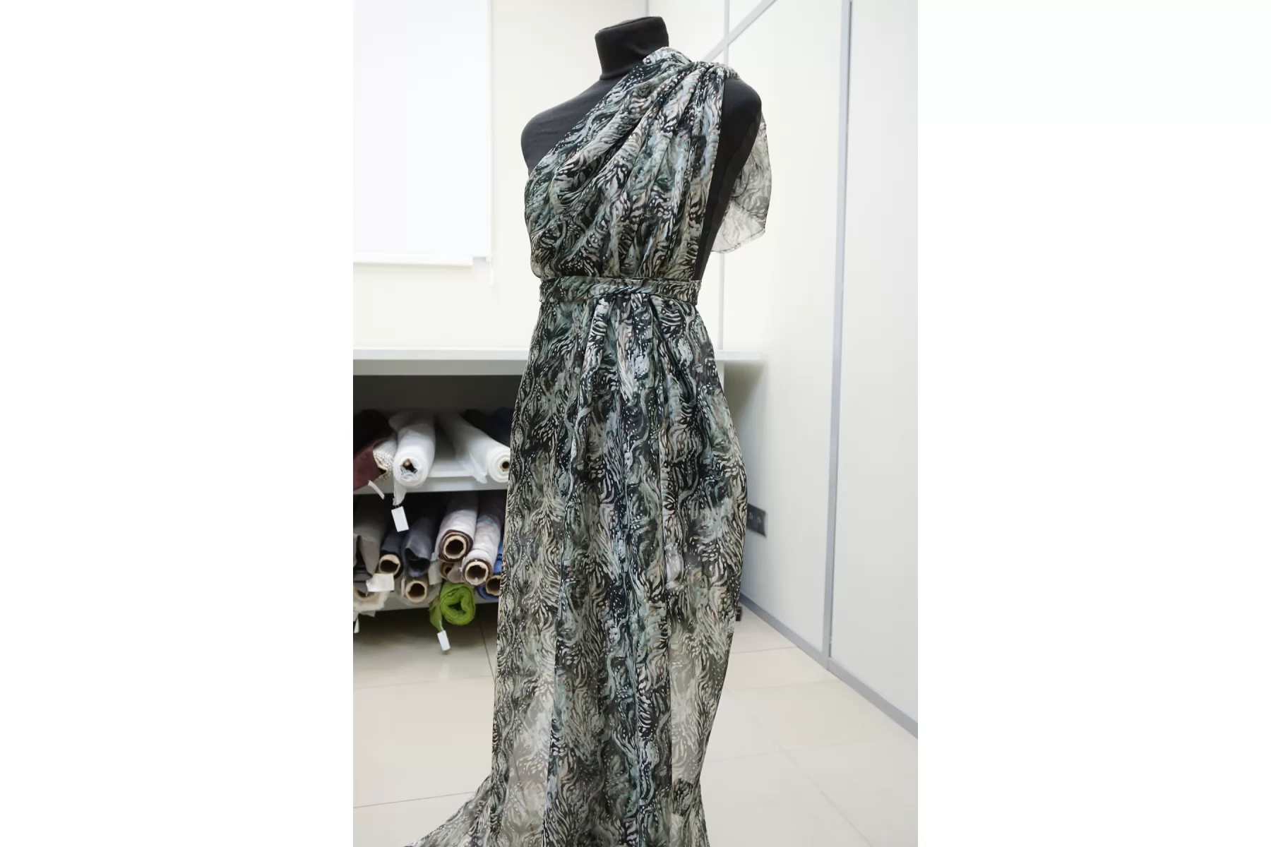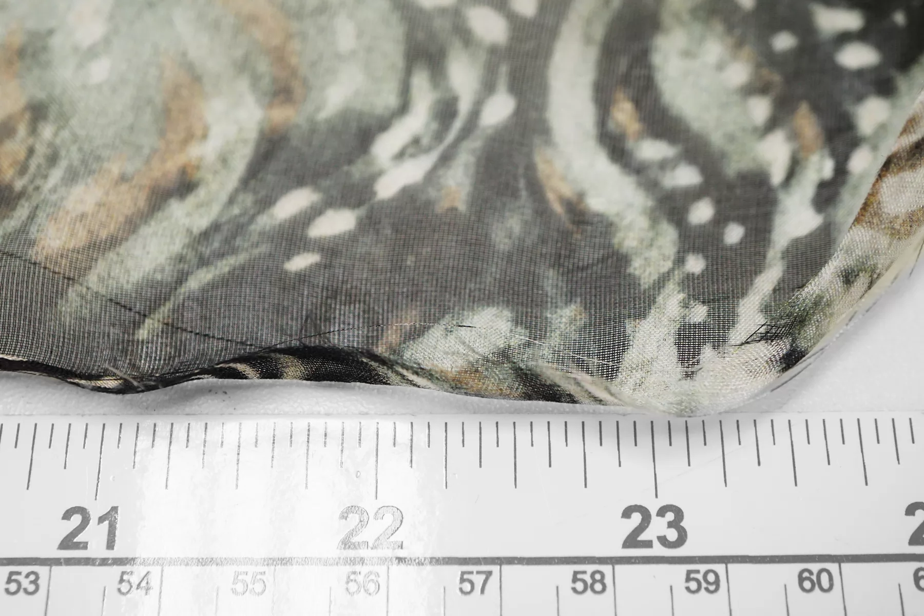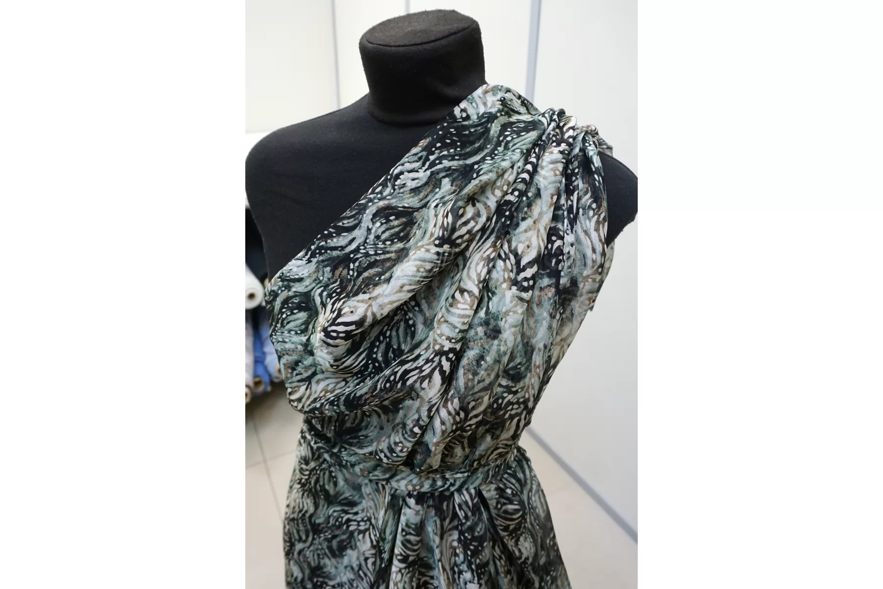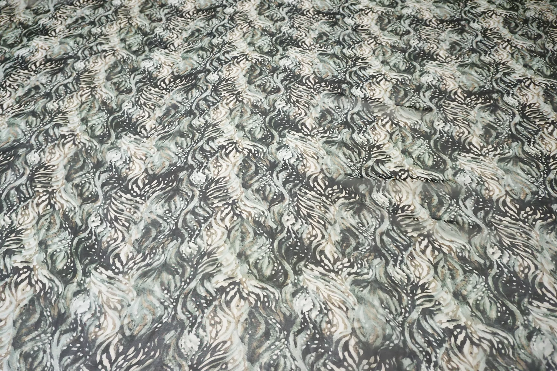 Шикарный итальянский батист из шёлка с хлопком, с приглушенно зеленоватым абстрактным принтом. Тактильно очень мягкий, воздушный, легкий гладкий и приятный, ощущается шелк. Не тянется, слегка сминается. Просвечивает. Форму не держит. Отлично подойдет на свободные рубашки, блузки, многослойные платья или юбки. Уход деликатный, шьем тонкими иглами.