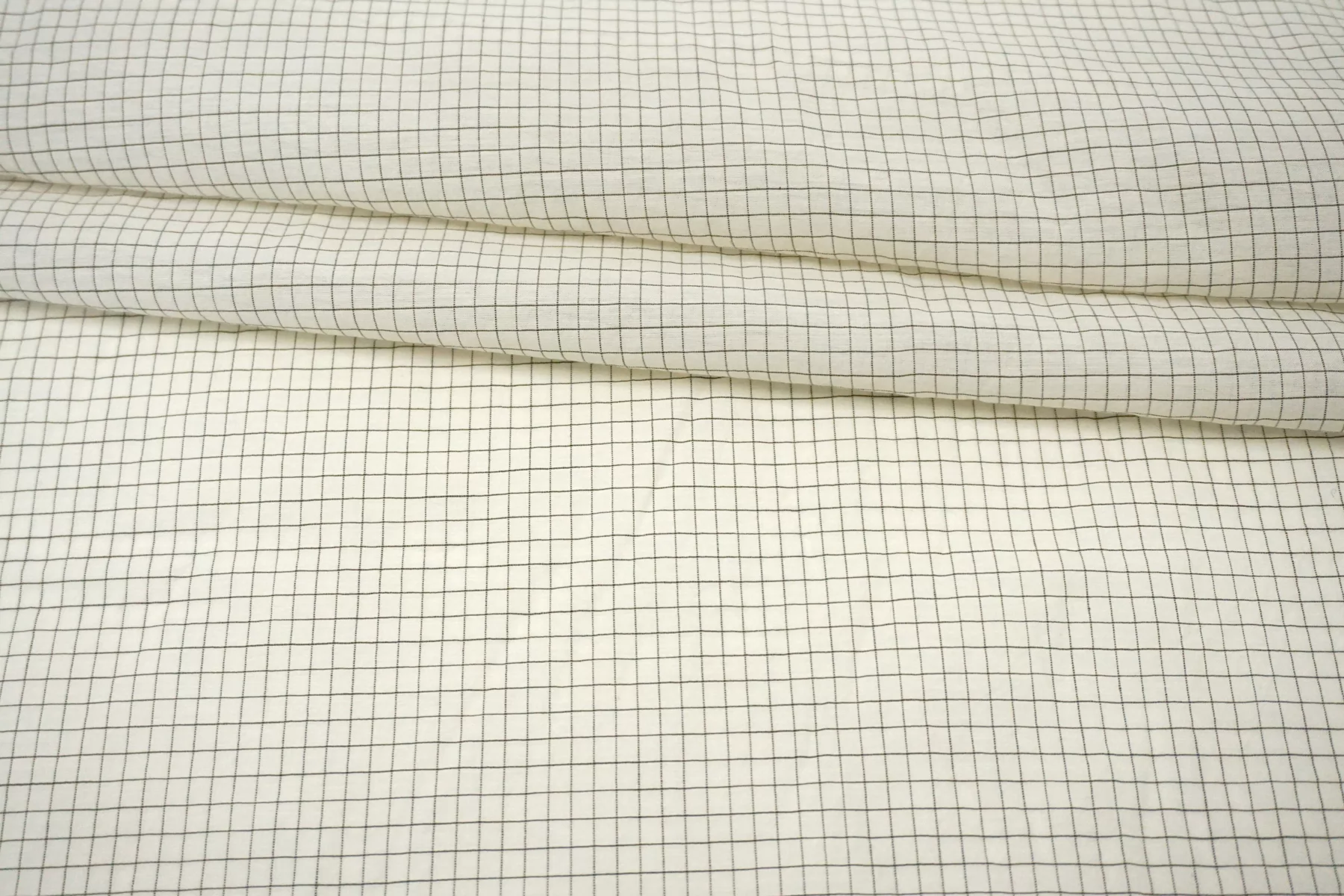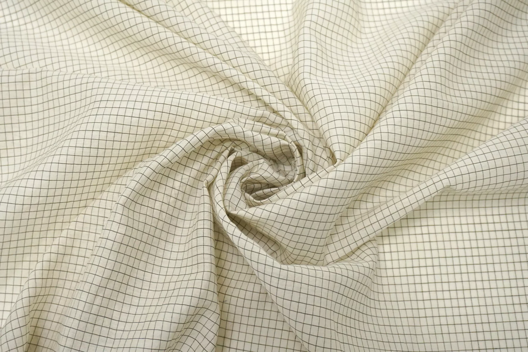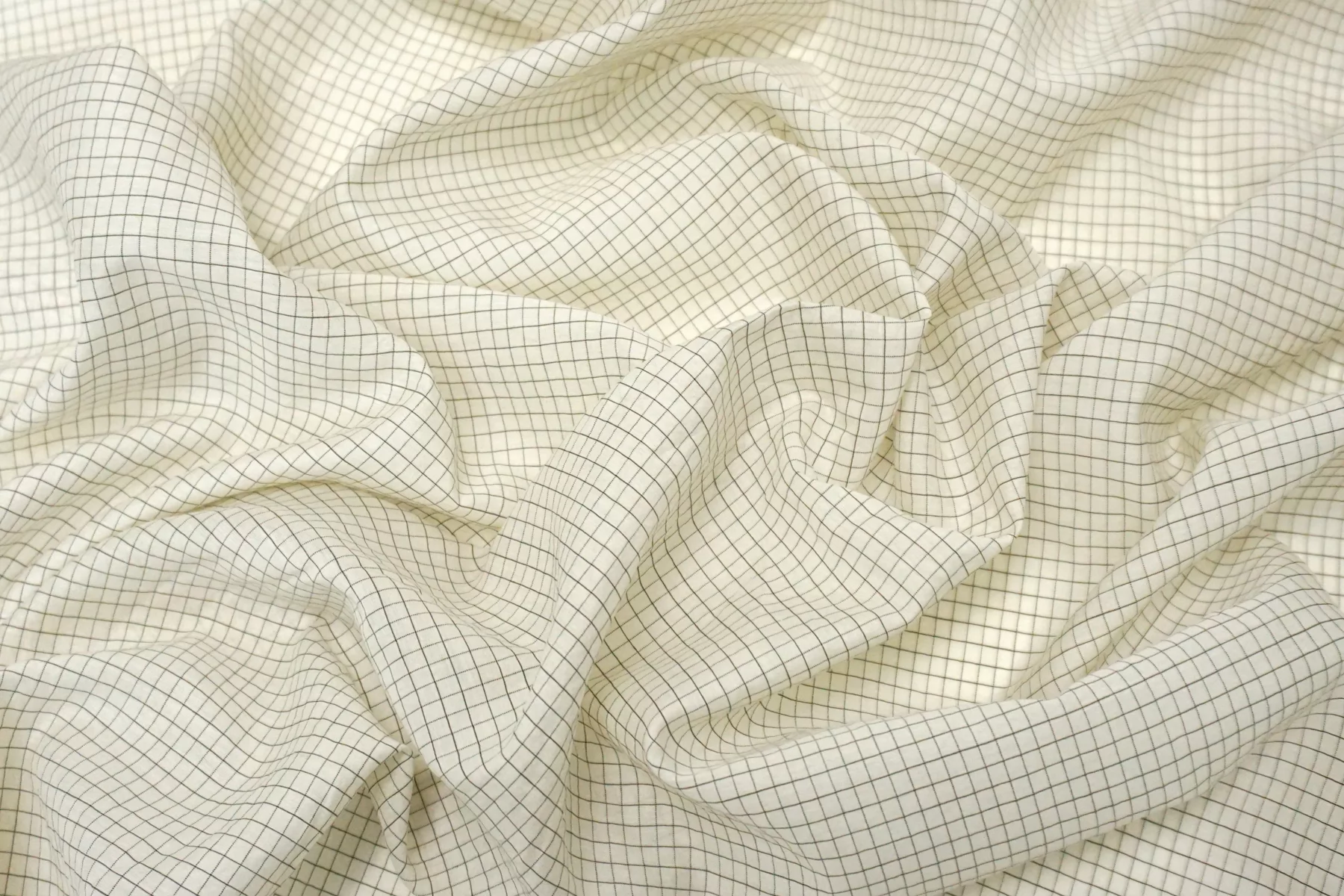 Шикарный итальянский батист из шёлка с хлопком, молочного цвета в мелкую клетку чёрной нитью. Фактура слегка напоминает марлёвку. Тактильно очень мягкий, воздушный, легкий гладкий и приятный, ощущается шелк. Не тянется, слегка сминается. Просвечивает. Форму не держит. Отлично подойдет на свободные рубашки, блузки, многослойные платья или юбки. Уход деликатный, шьем тонкими иглами.
