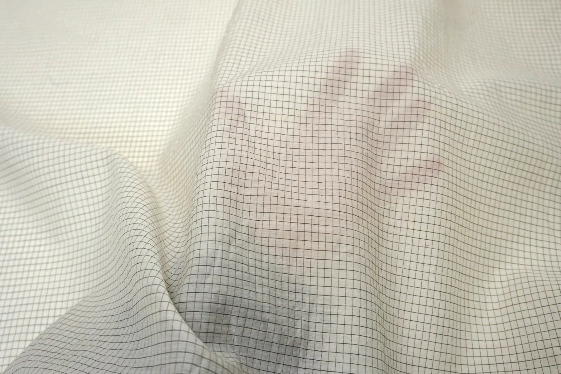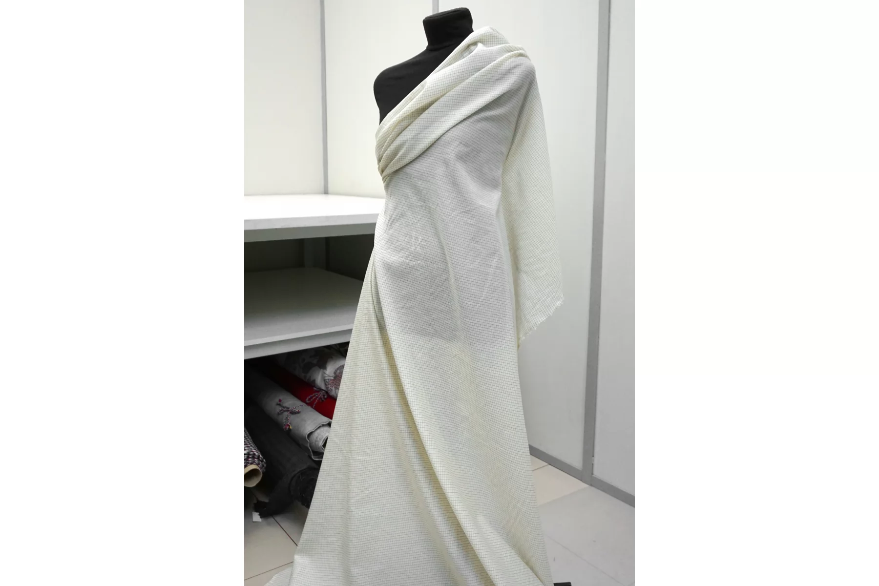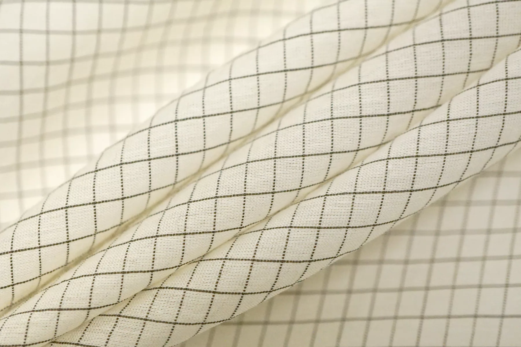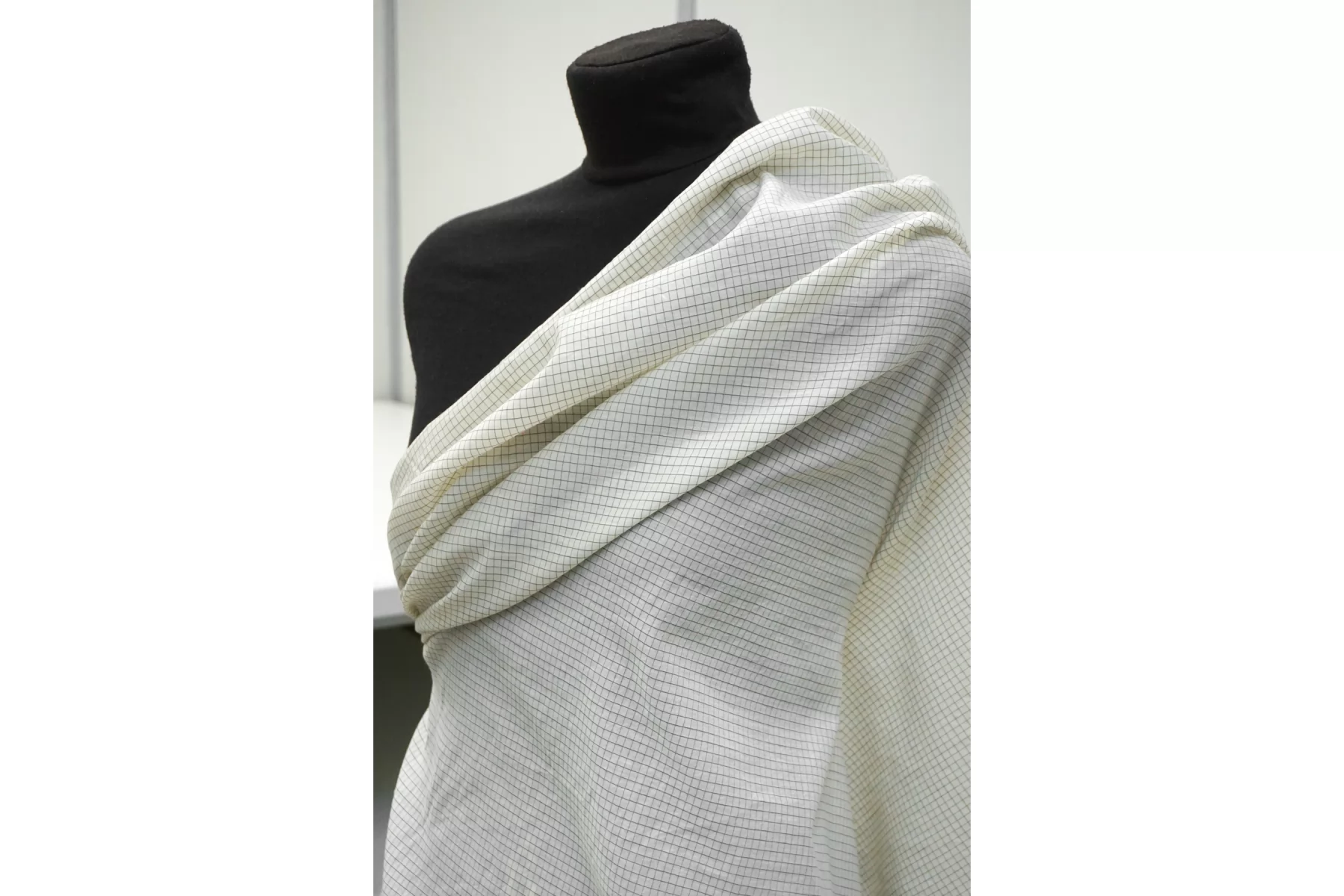 Шикарный итальянский батист из шёлка с хлопком, молочного цвета в мелкую клетку чёрной нитью. Фактура слегка напоминает марлёвку. Тактильно очень мягкий, воздушный, легкий гладкий и приятный, ощущается шелк. Не тянется, слегка сминается. Просвечивает. Форму не держит. Отлично подойдет на свободные рубашки, блузки, многослойные платья или юбки. Уход деликатный, шьем тонкими иглами.