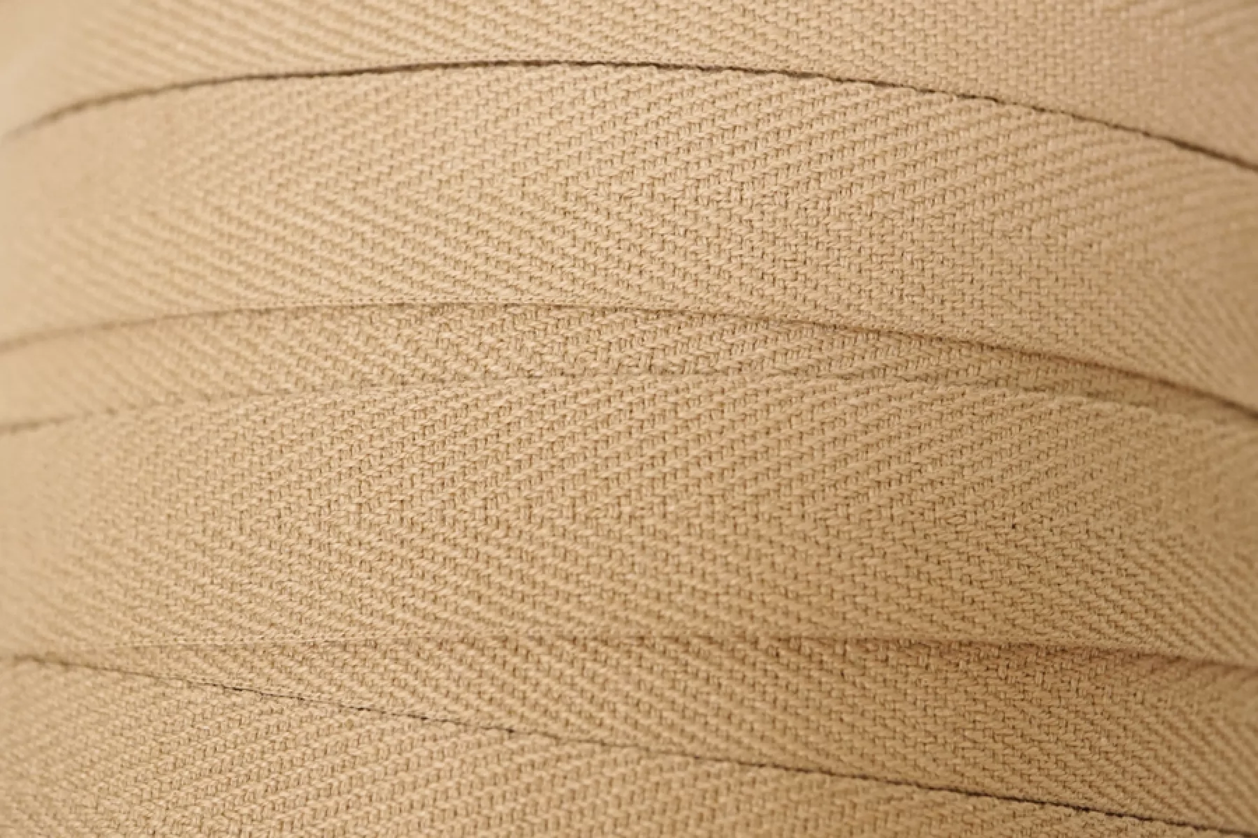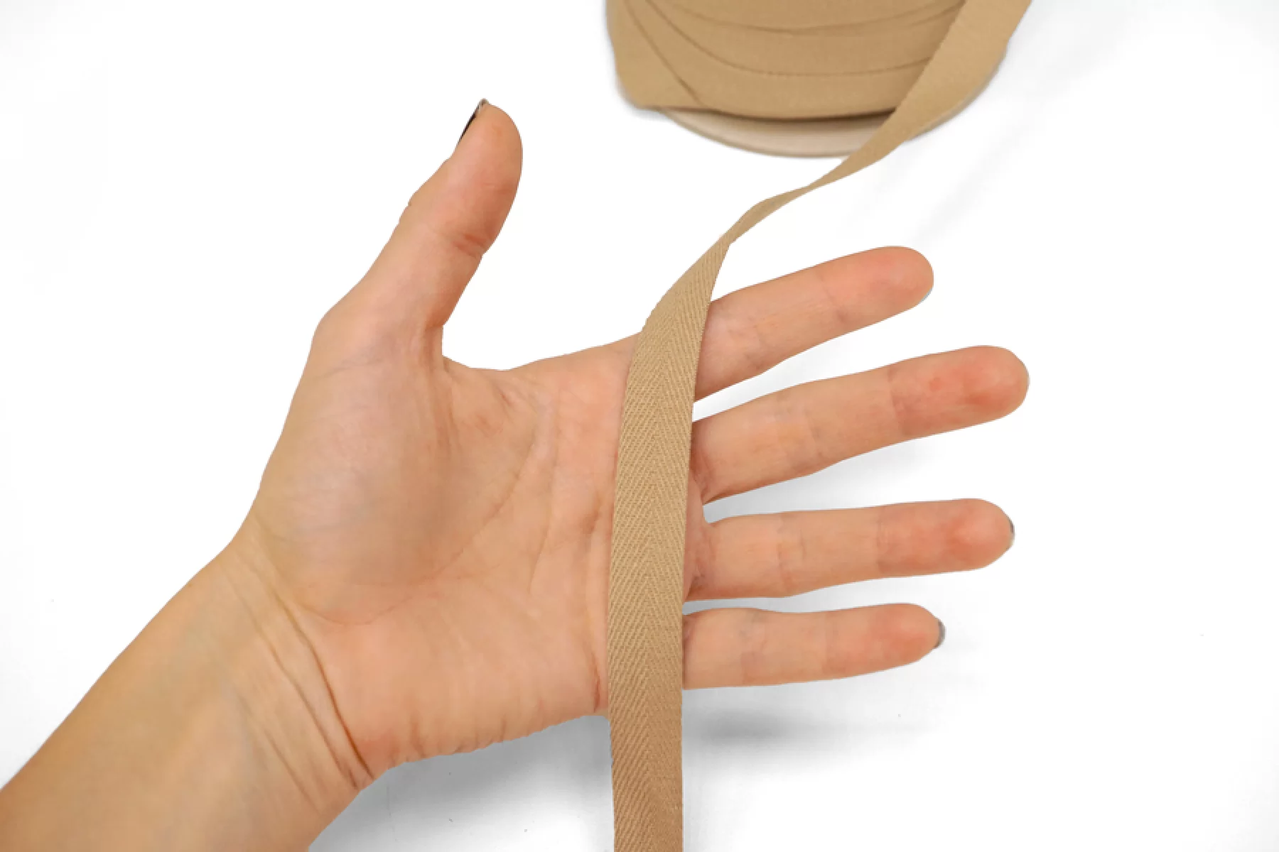 Бежевая киперная лента в тёплом оттенке из хлопка шириной 1,5 см. Плотная, средняя по пластичности.