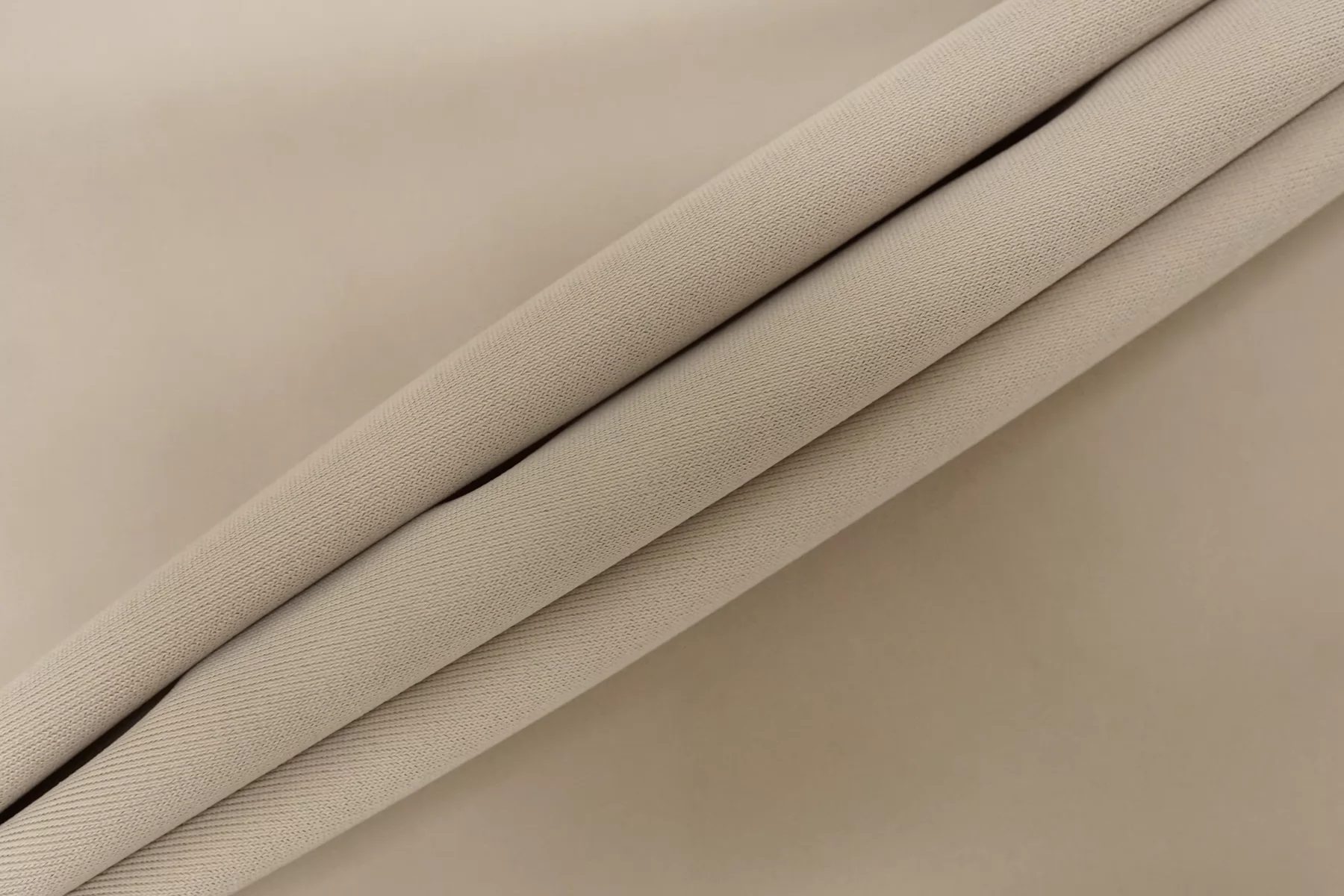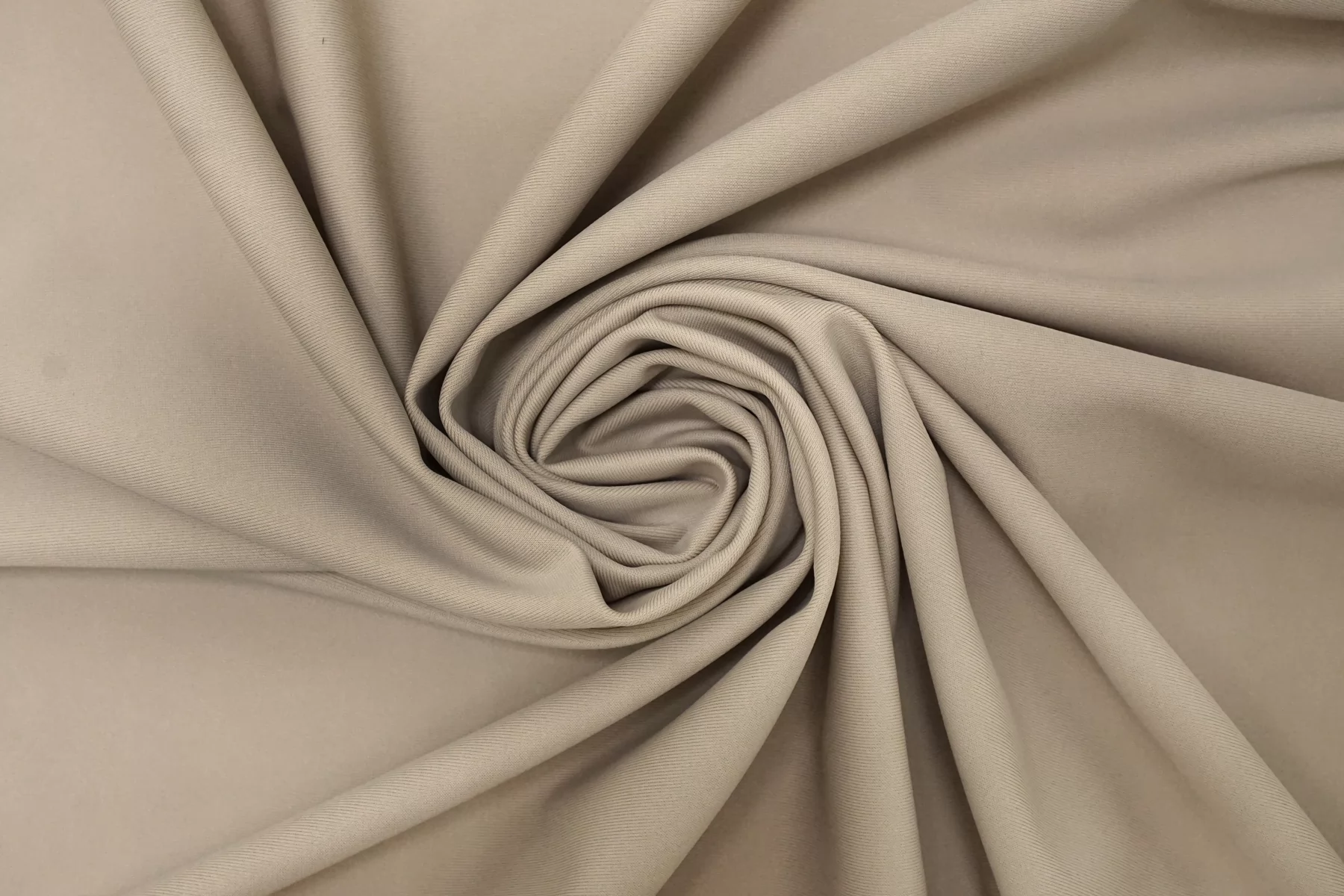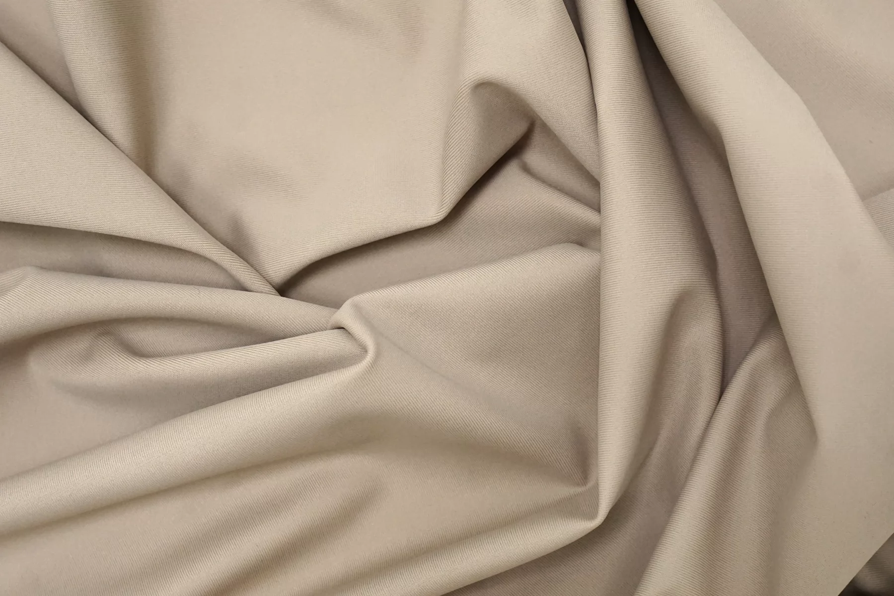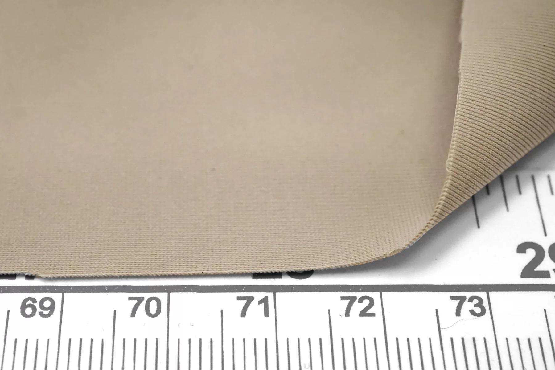 Итальянский бифлекс в бежевом цвете из переработанного сырья. Плотный, слегка просвечивает силуэт при сильном растяжении, пластичный, отлично тянется во все стороны, не мнется, хорошо прилегает, долговечен. Подойдет для пошива гимнастических, танцевальных, купальных костюмов, перчаток, спортивной одежды. Можно использовать в интерьере и декорировании одежды.