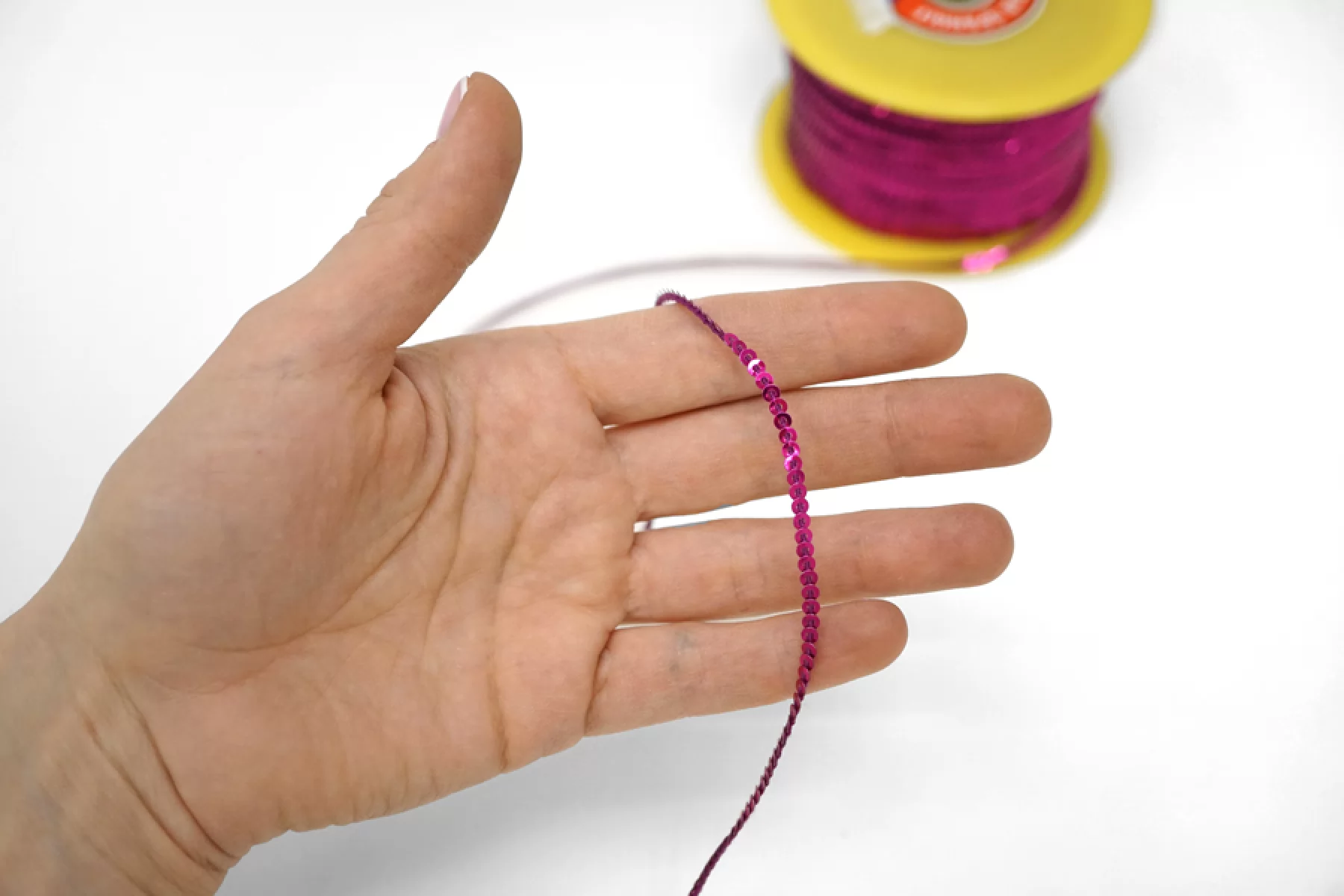 Очень красивая декоративная тесьма с пайетками в оттенке розовой фуксии. Диаметр пайеток - 0,3 см. Непрозрачные, красиво и ярко переливаются. Отличный вариант для декоративного оформления любых изделий.