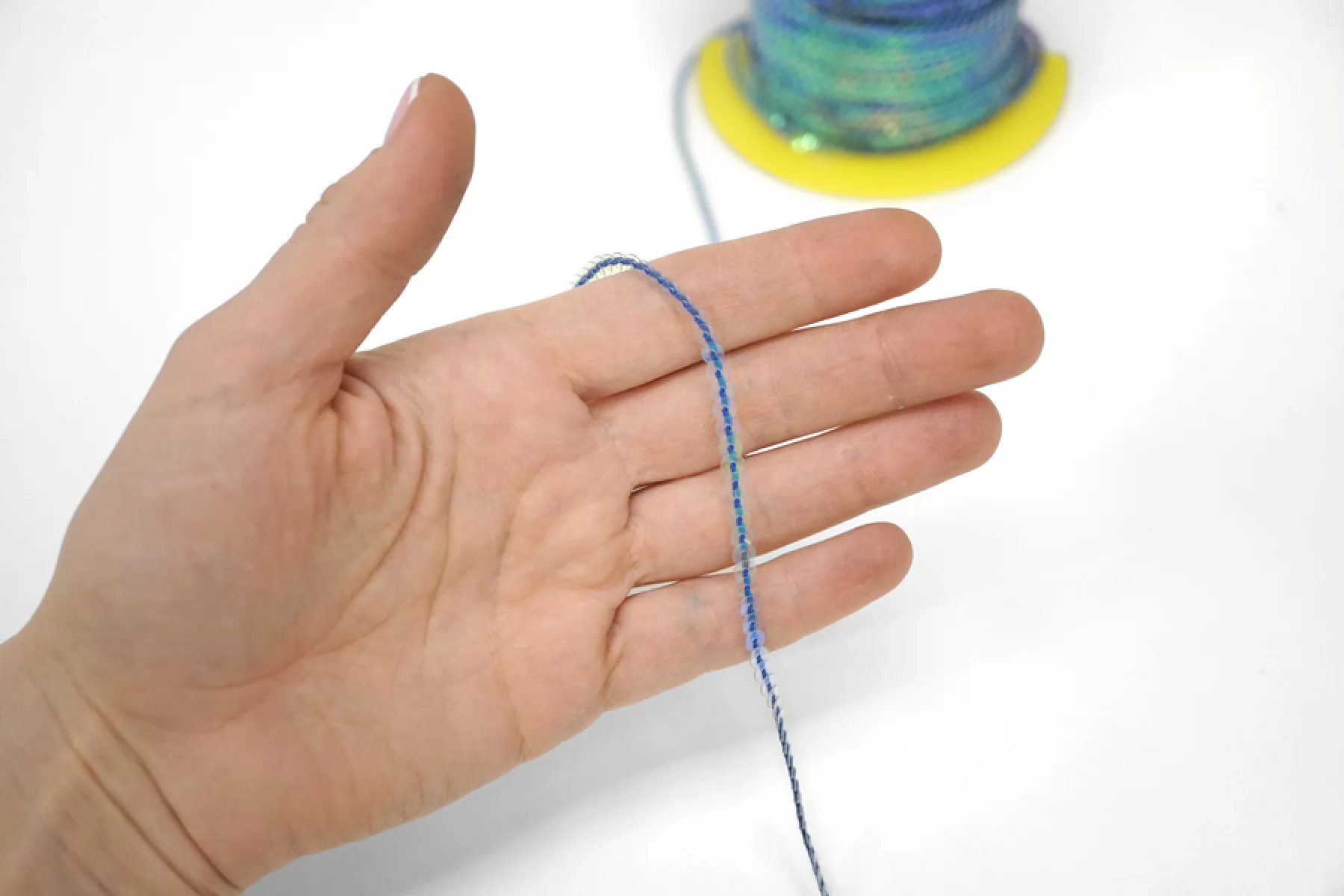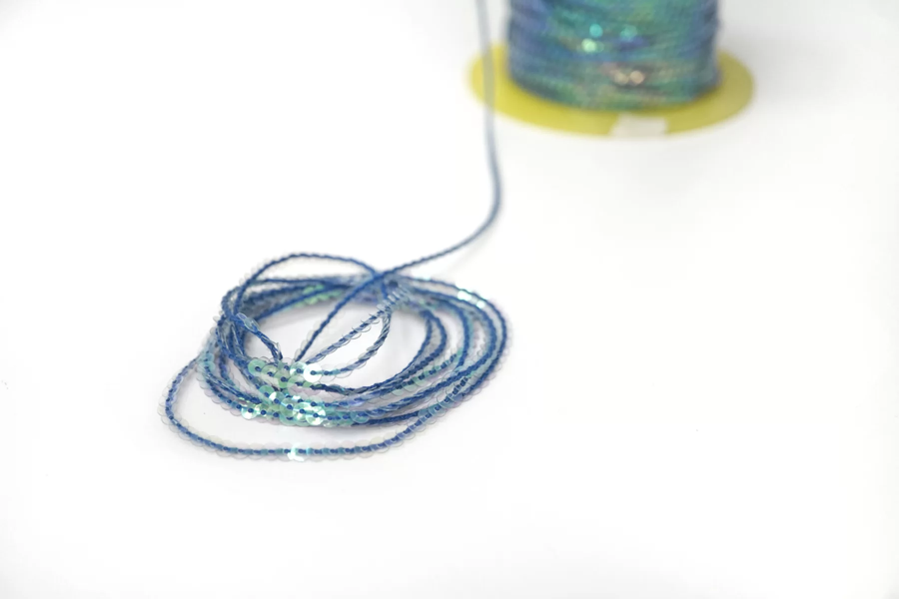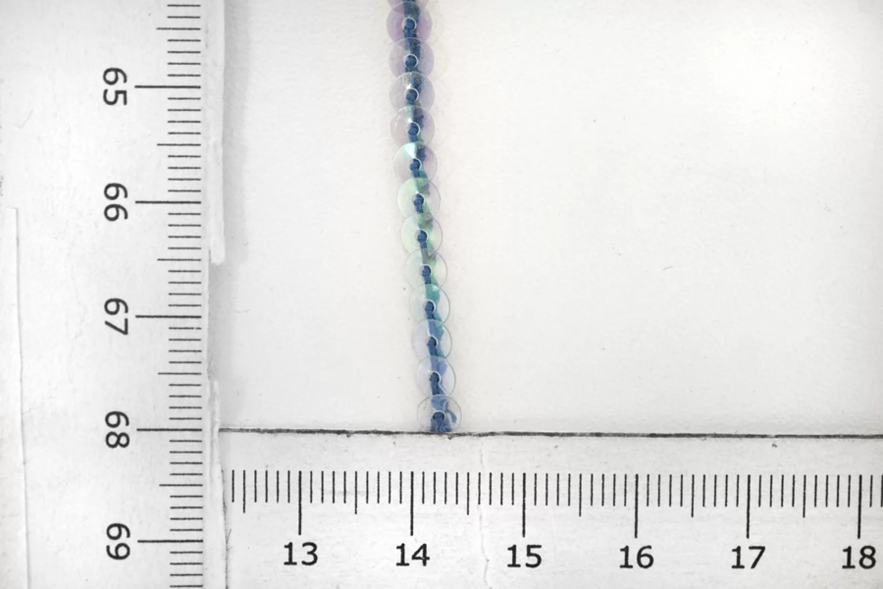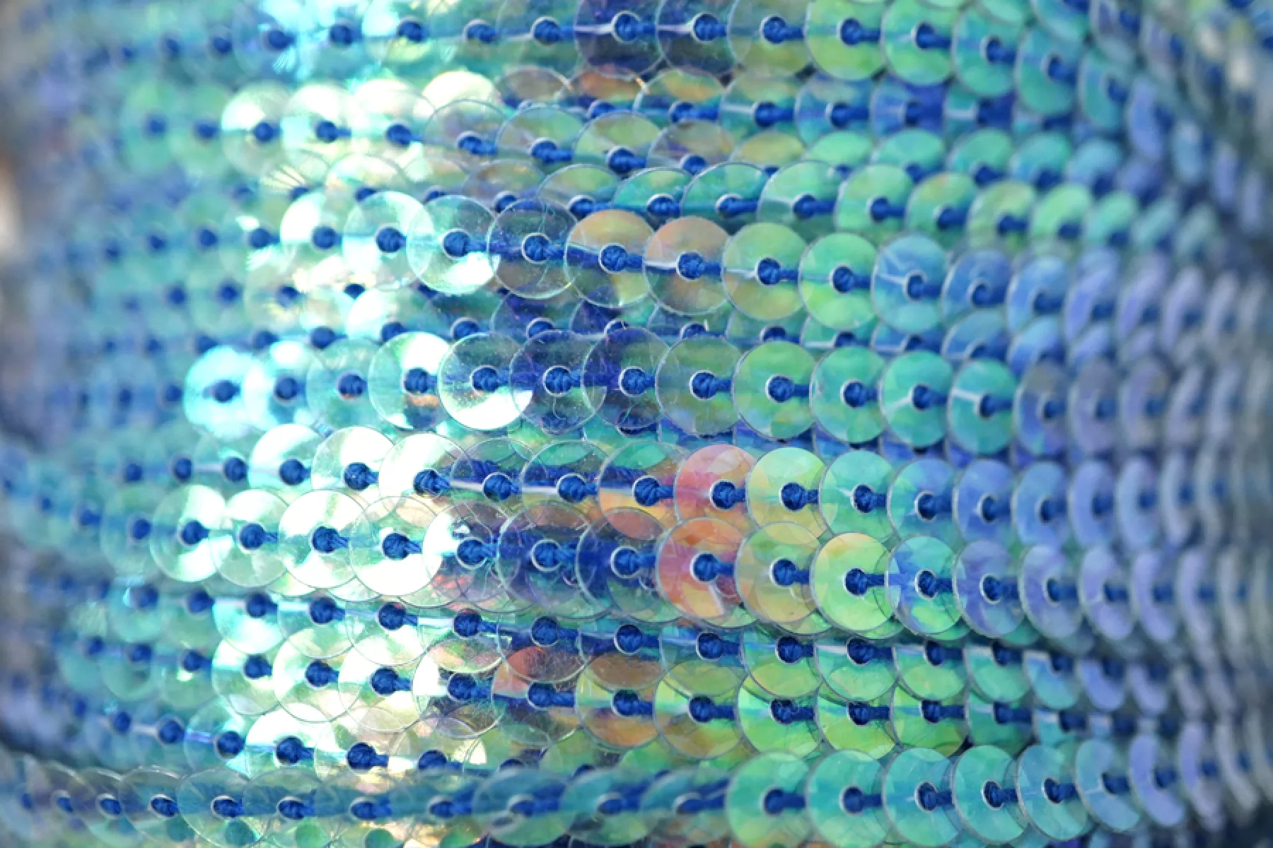 Очень красивая декоративная тесьма с пайетками - хамелеон - на синей нити. Диаметр пайеток - 0,4 см. Прозрачные, переливаются. Отличный вариант для декоративного оформления любых изделий.