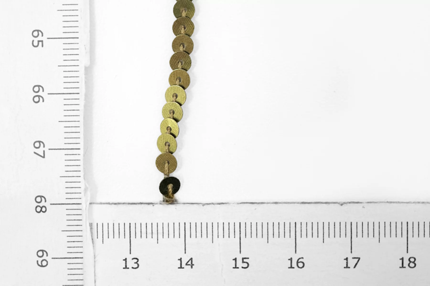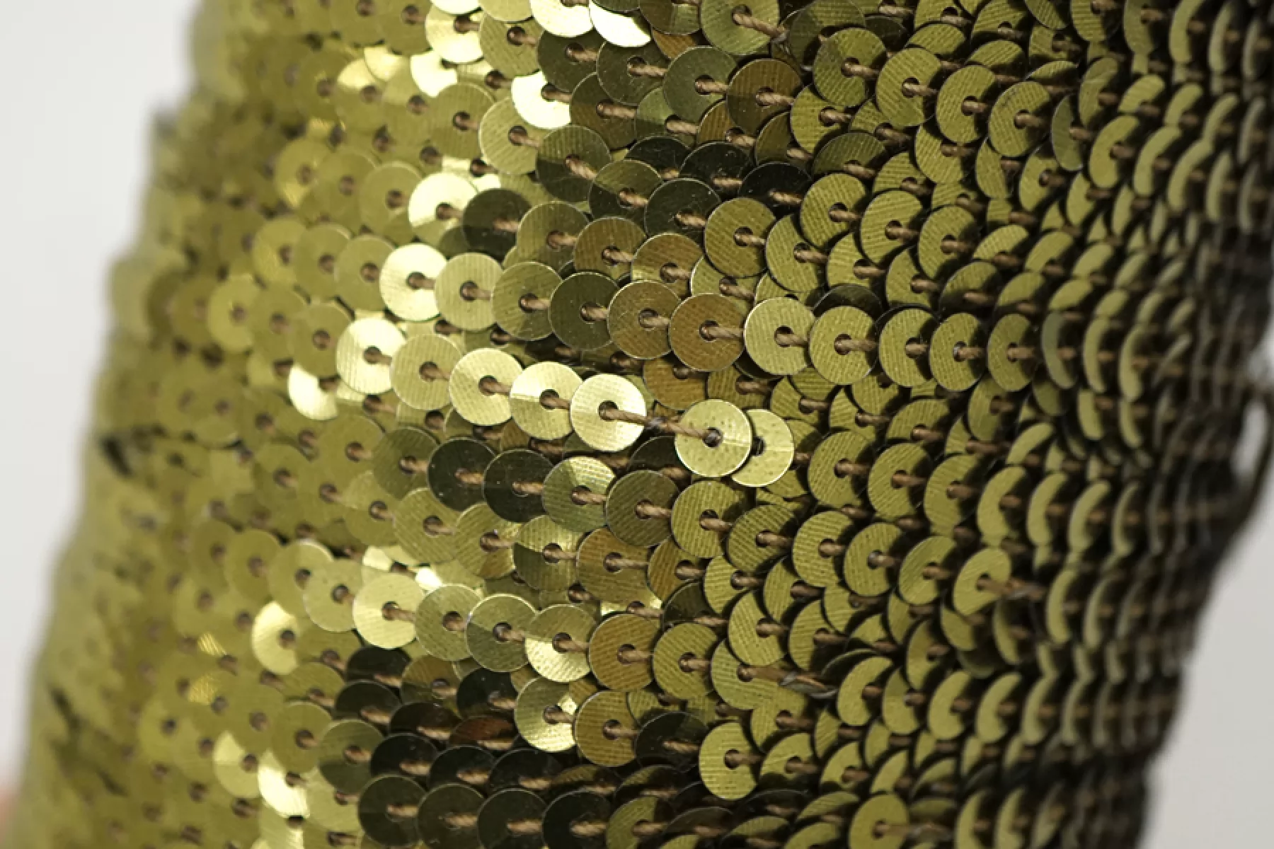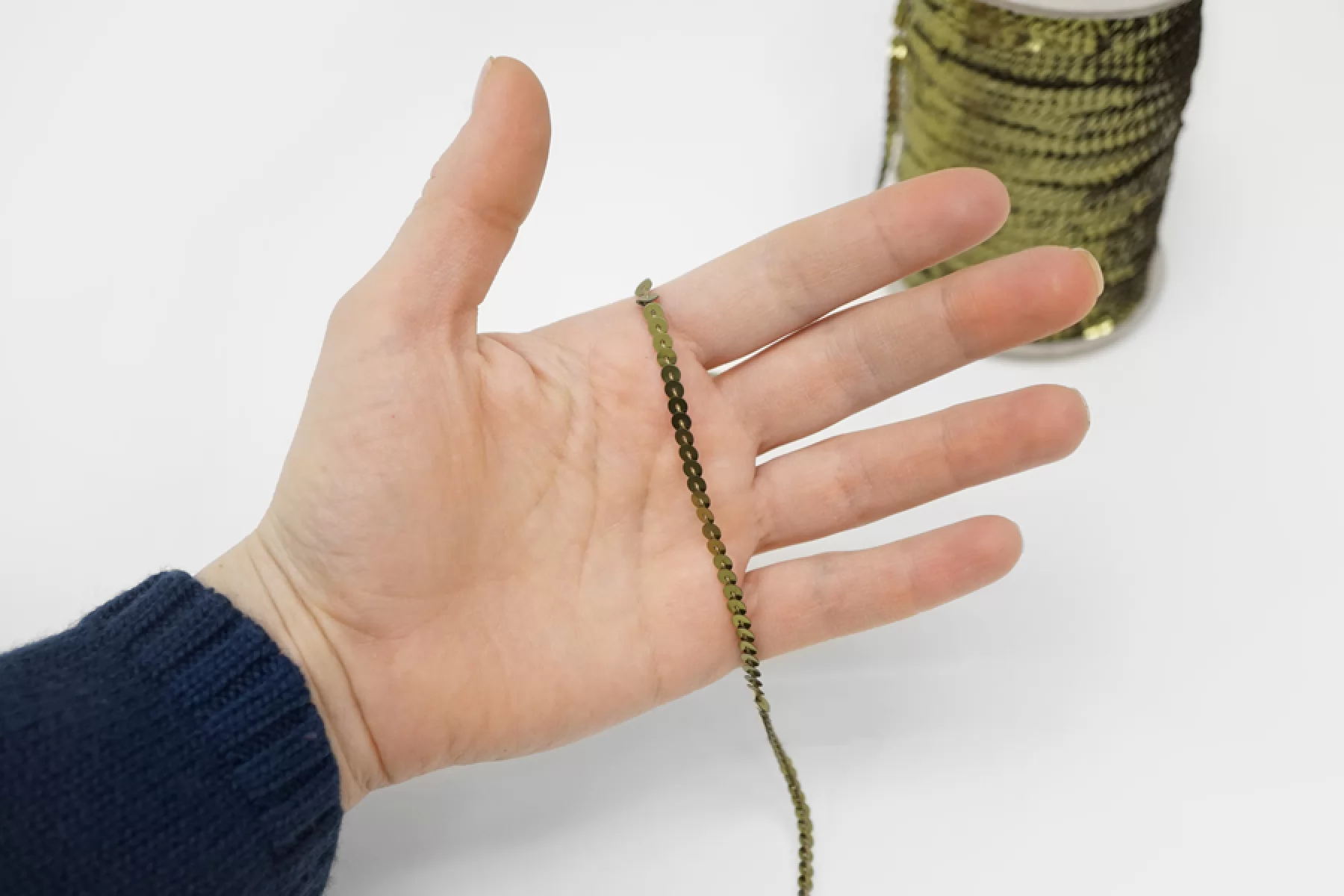 Очень красивая декоративная тесьма с пайетками в золотисто-зеленом оттенке. Диаметр пайеток - 0,4 см. Непрозрачные, красиво и ярко переливаются. Отличный вариант для декоративного оформления любых изделий.