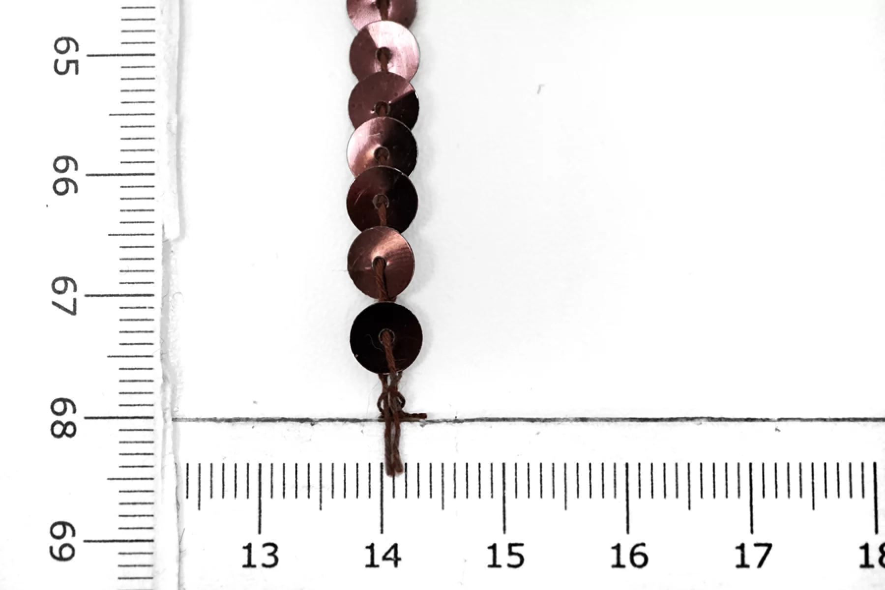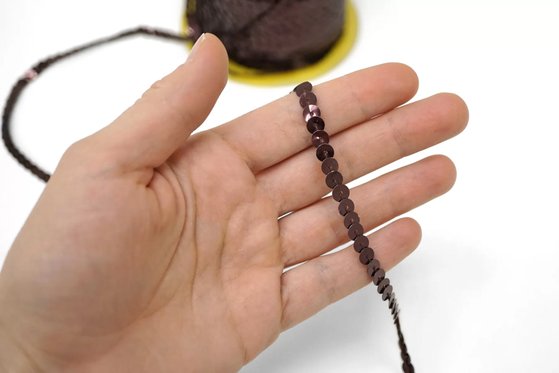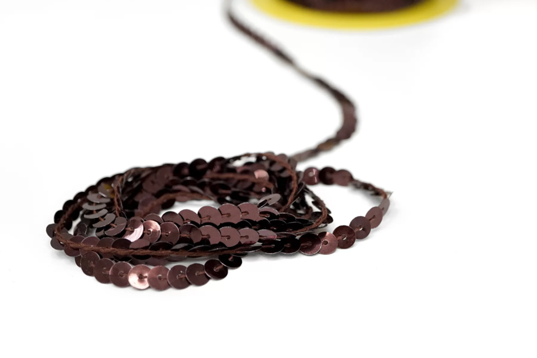 Красивая декоративная тесьма с пайетками в оттенке горячего шоколада. Диаметр пайеток - 0,5 см. Непрозрачные, красиво и ярко переливаются. Отличный вариант для декоративного оформления любых изделий.