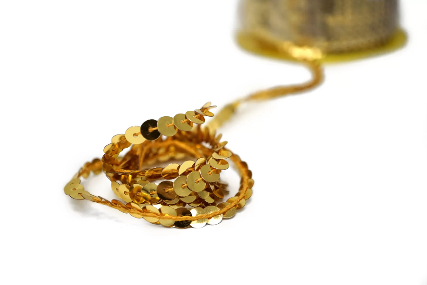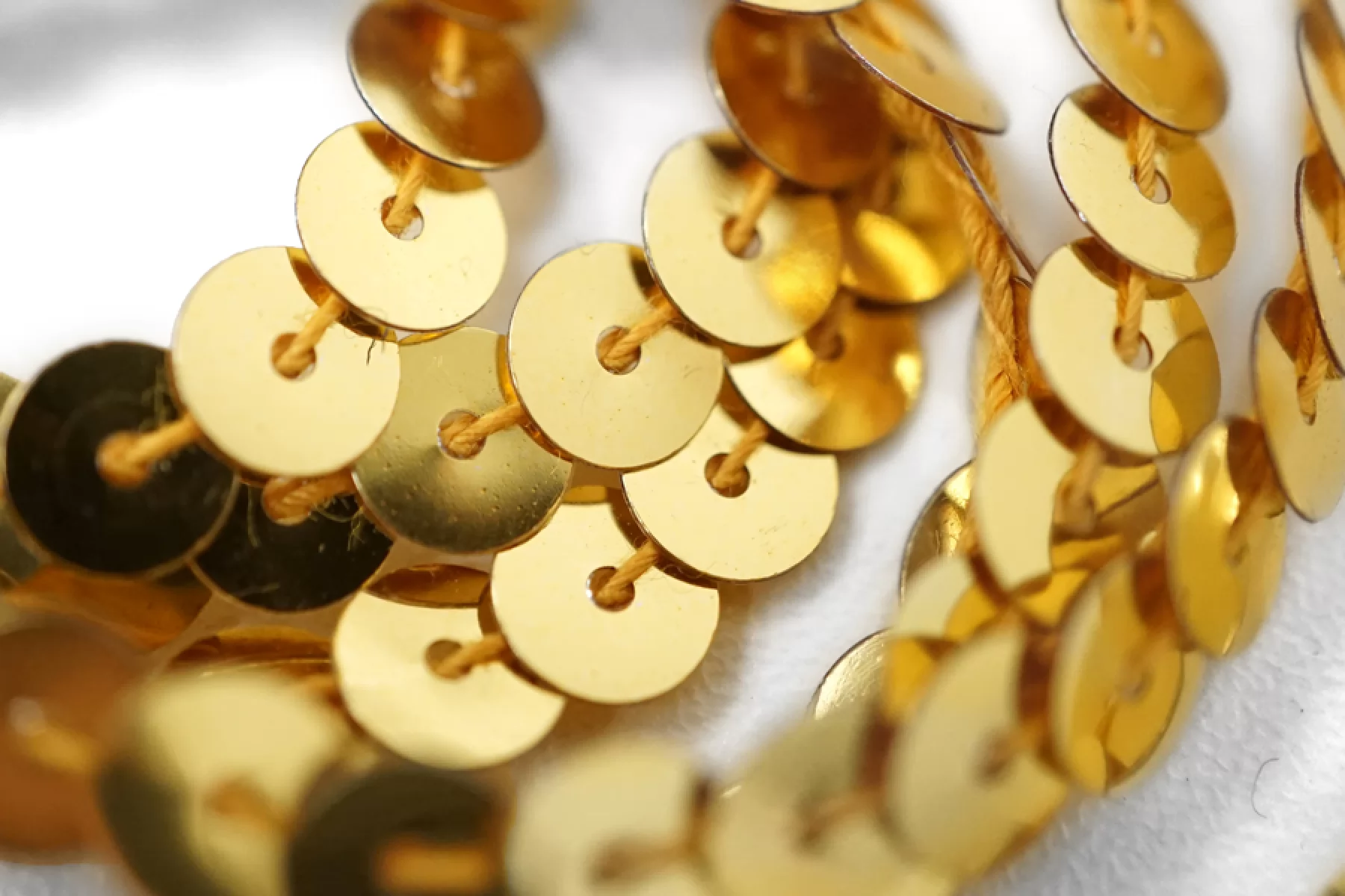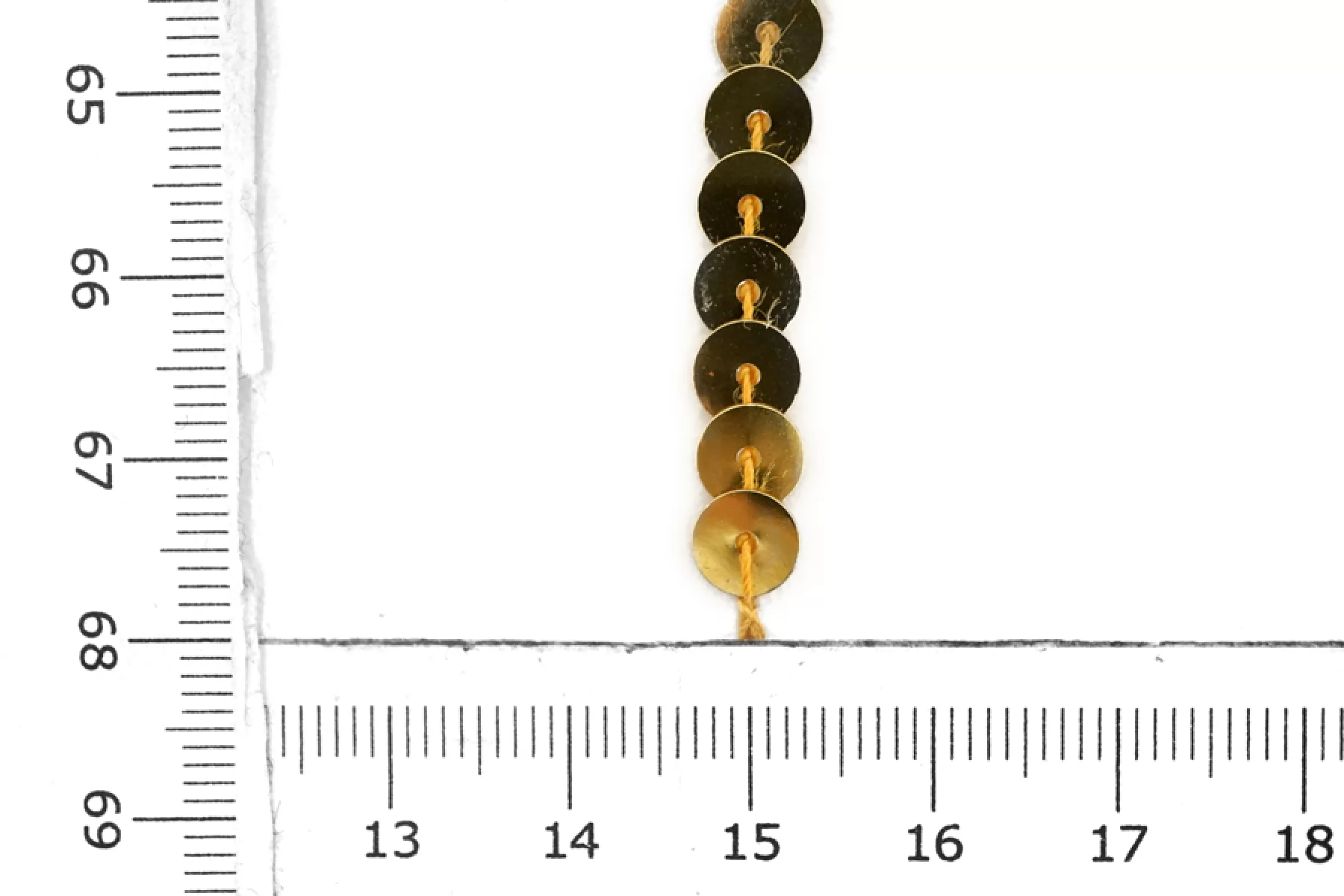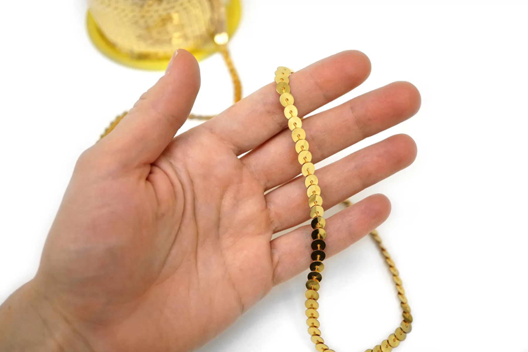 Очень красивая декоративная тесьма с пайетками в оттенке желтого золота. Диаметр пайеток - 0,5 см. Непрозрачные, красиво и ярко переливаются. Отличный вариант для декоративного оформления любых изделий.
