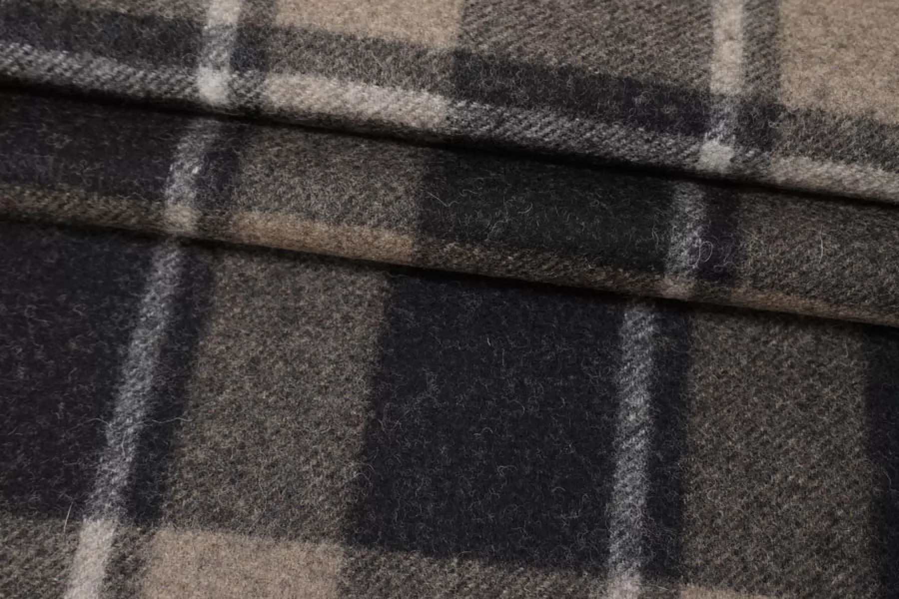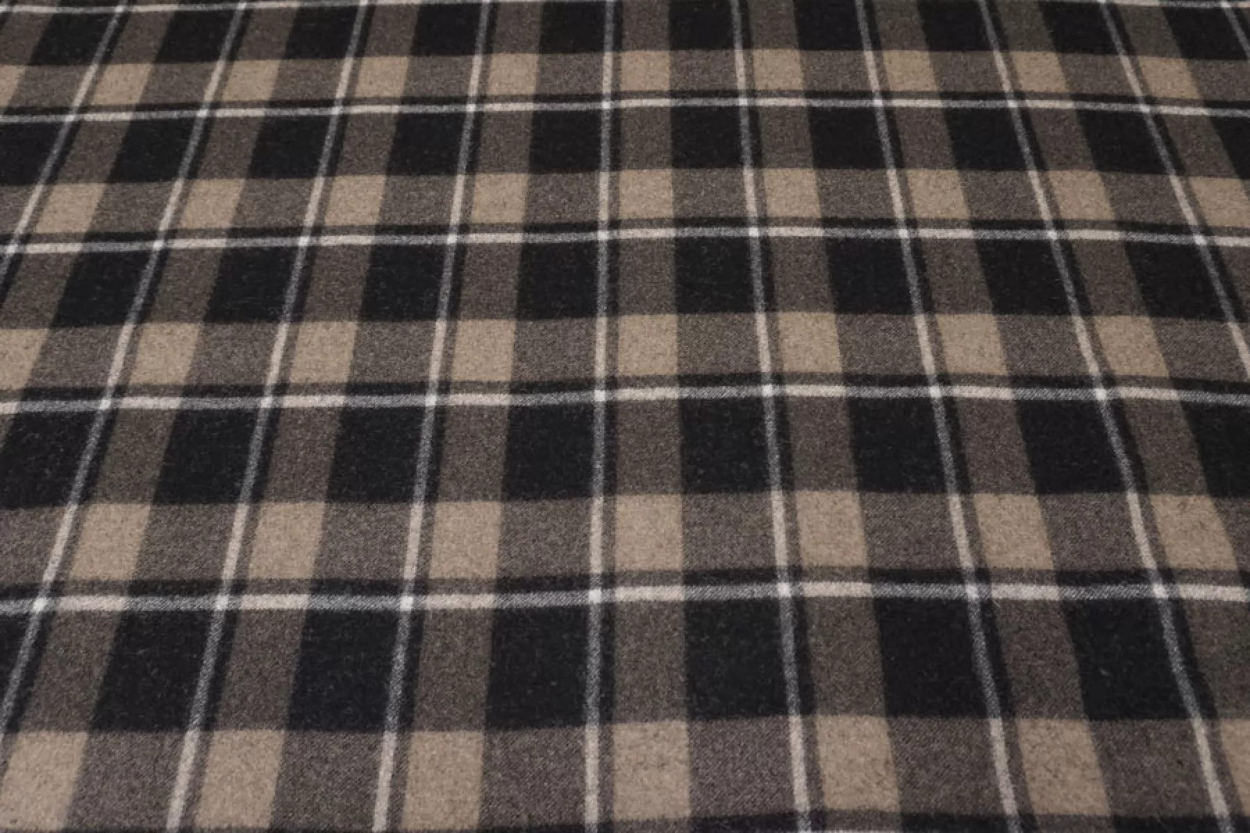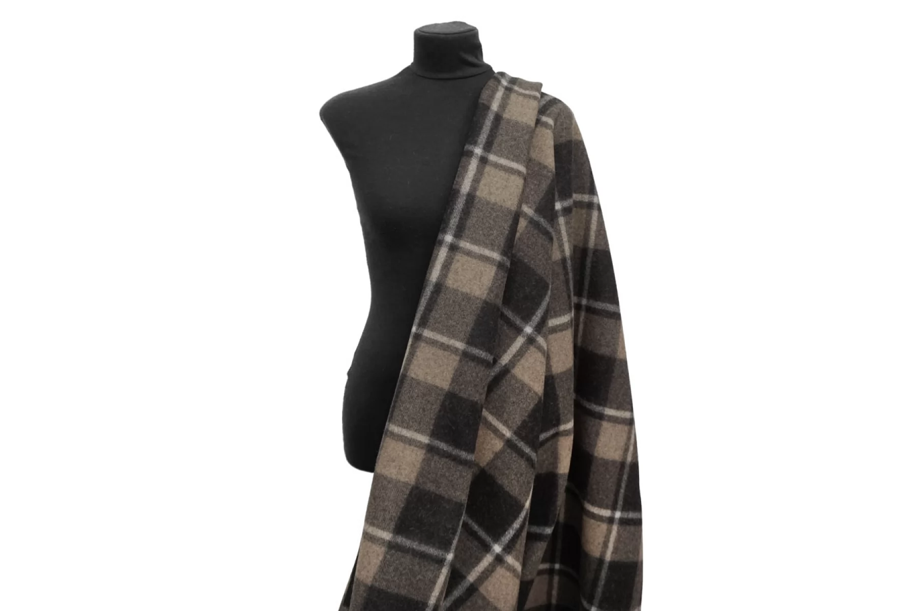 Прекрасный пальтовый шерсятной драп из двух слоев, которые не разделяются. Принт с обеих сторон - крупная коричнево-черная клетка. Драп - сукно из двойной шерстяной нити, не просвечивает, хорошо держит форму. Сухая, шероховатая наощупь. Ворс коротки прижатый. Не тянется. Не осыпается. Отличный вариант на пальто. Уход деликатный.