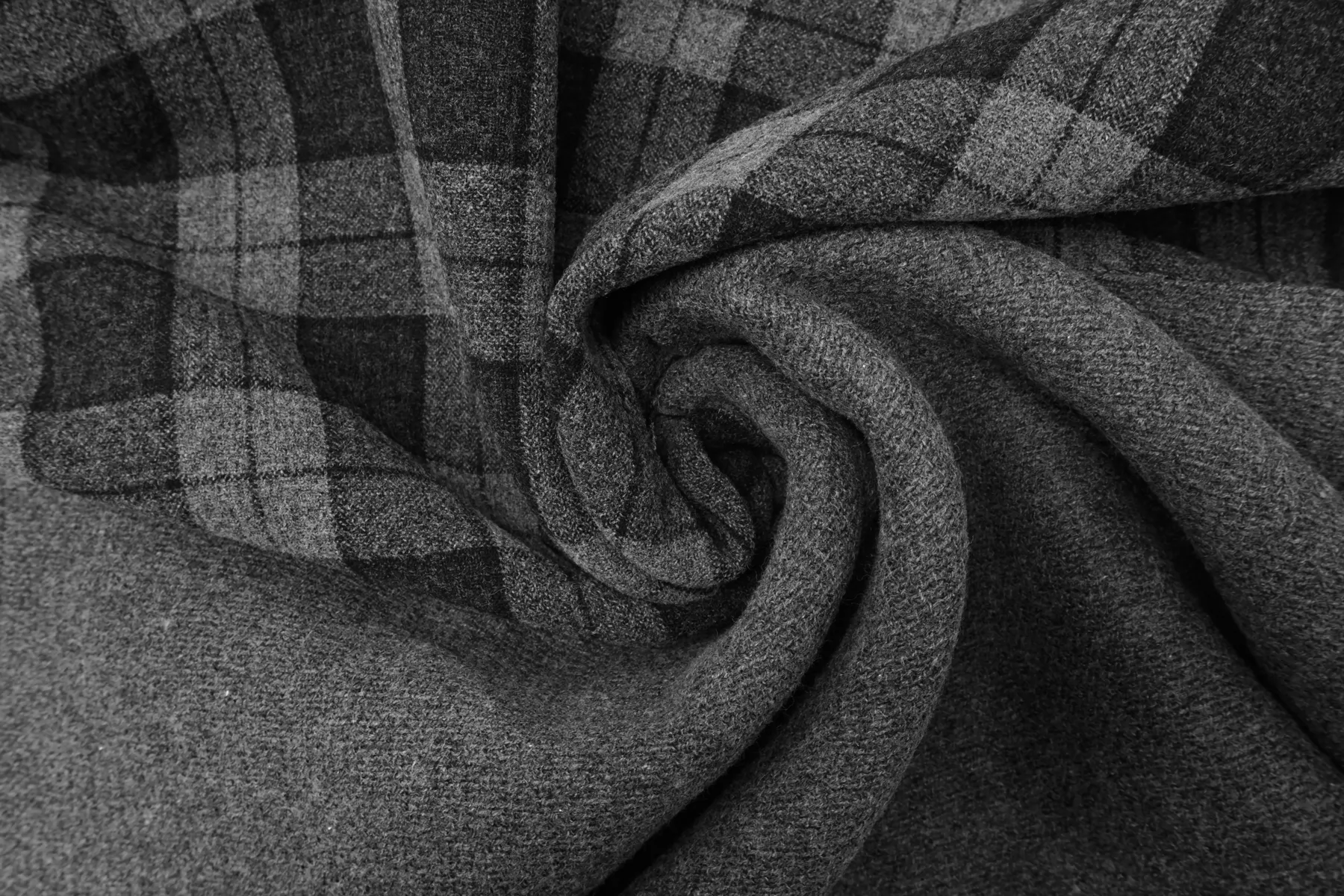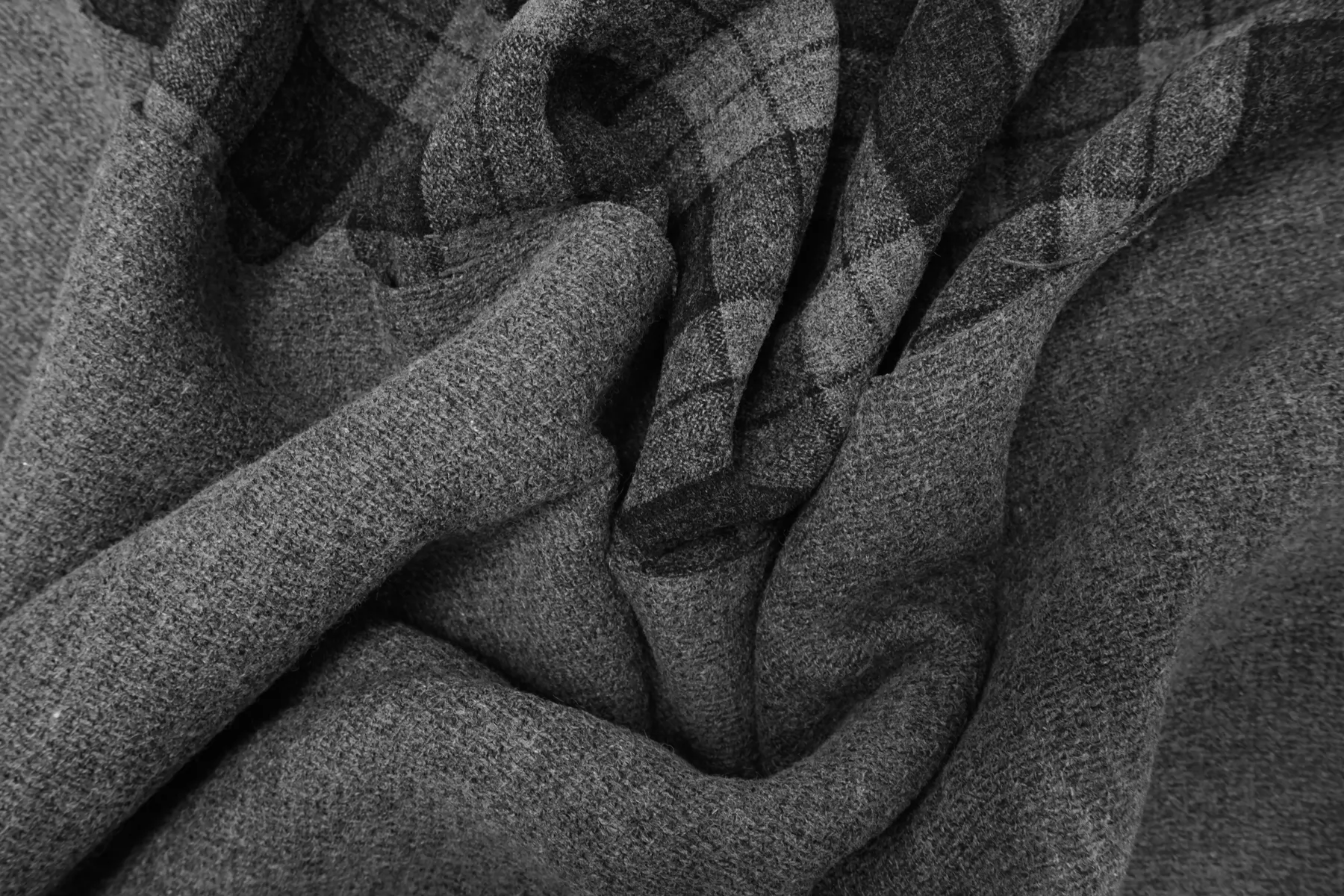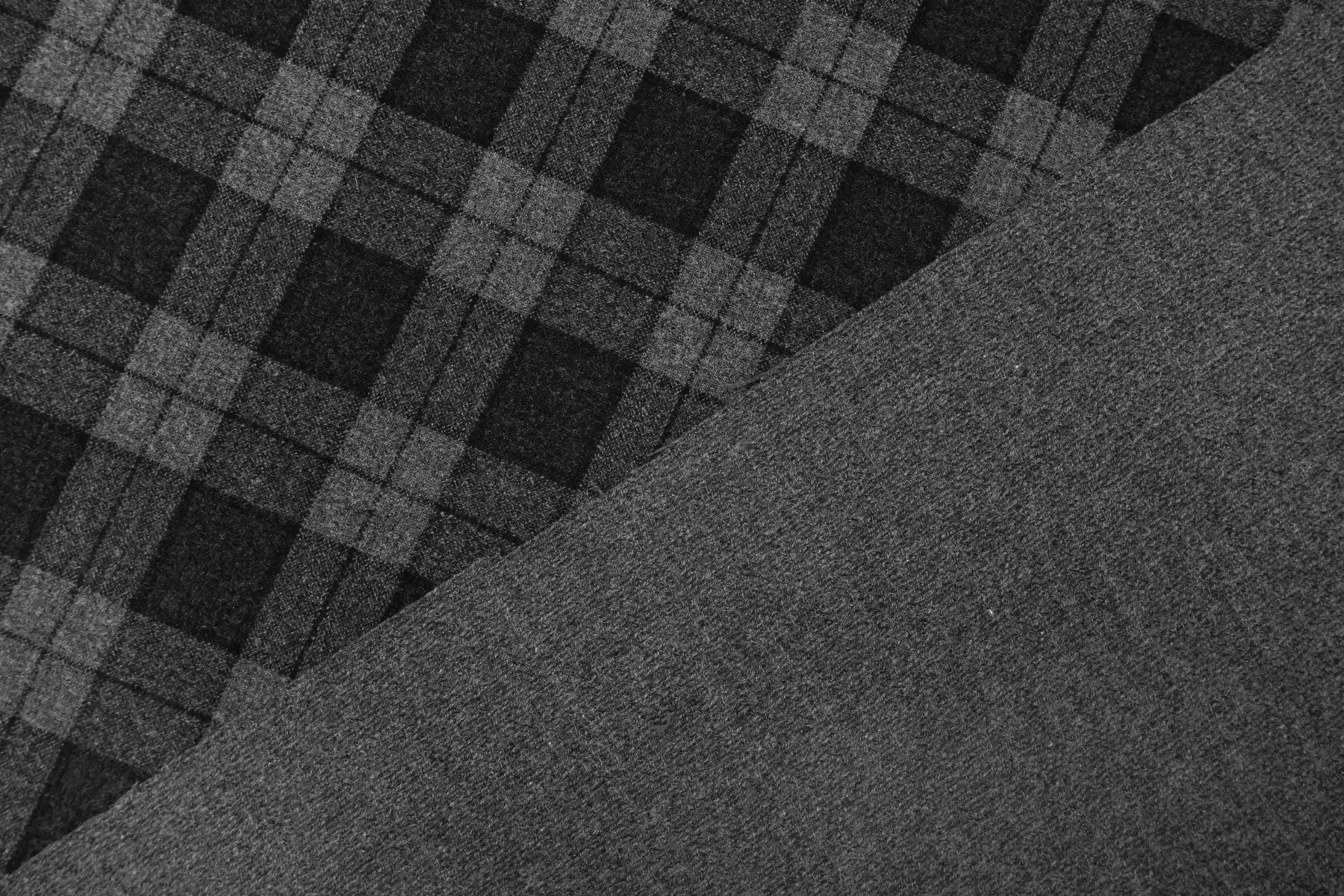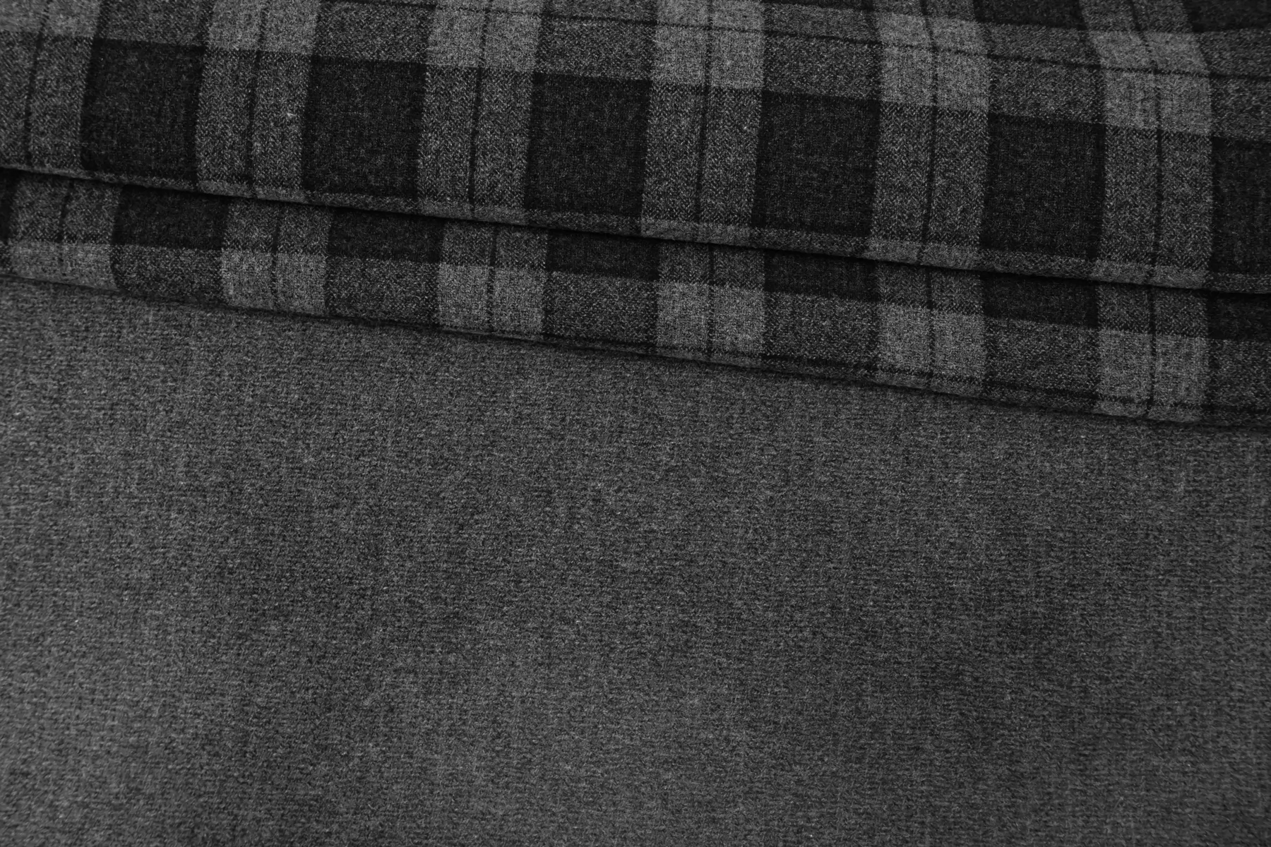 Пальтово-костюмная двухслойная шерсть, между слоёв вложен синтетический материал для объема и небольшого утепления. Одна сторона в клетку из нитей чёрного и серого цвета, другая однотонная серая. Тактильно слегка сухая. Не тянется. Форму держит. Не мнется. Отличный вариант для пошива пальто или тёплого жакета. Уход деликатный.