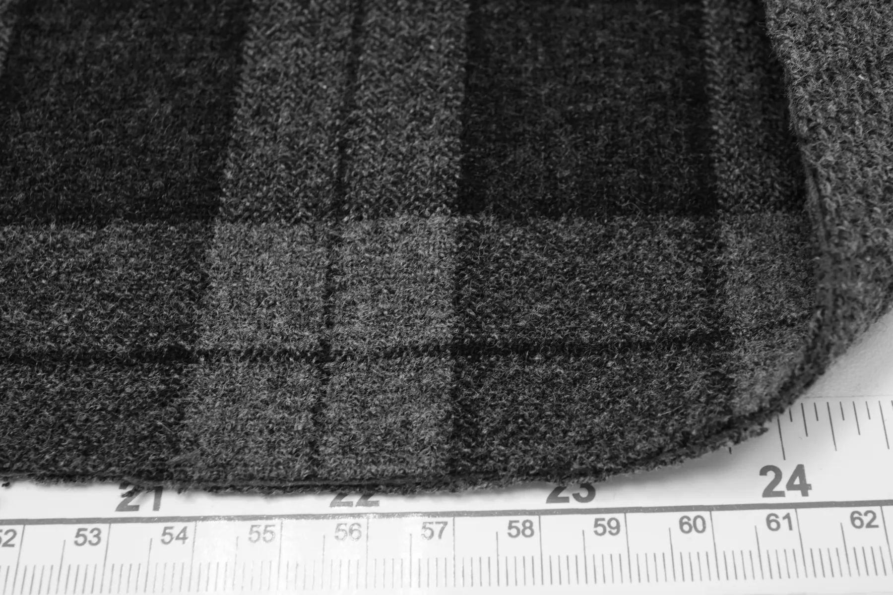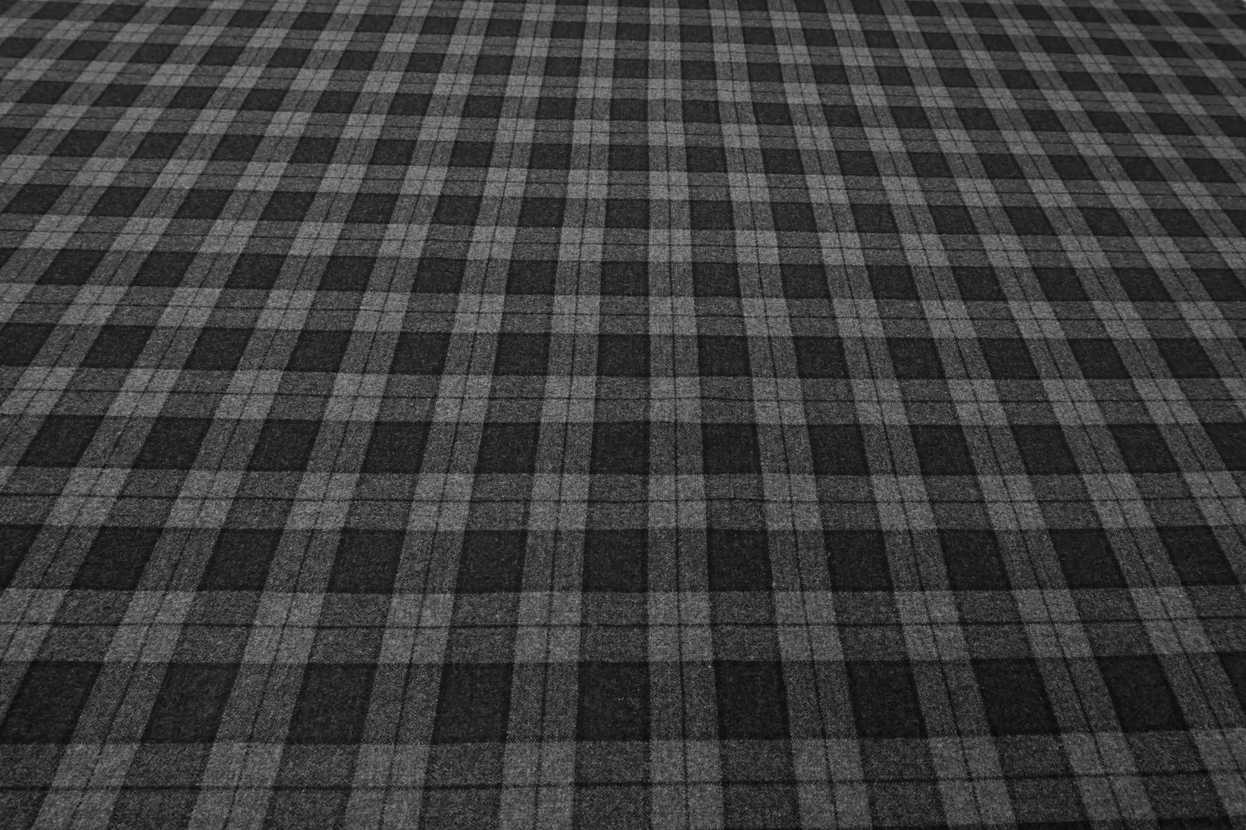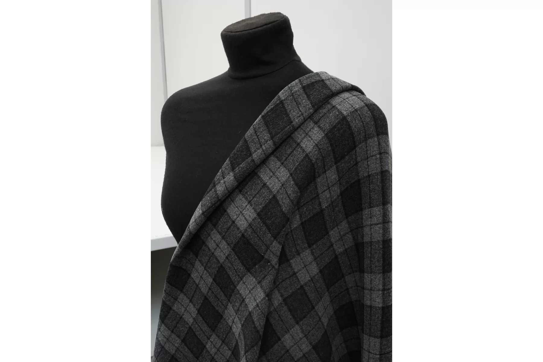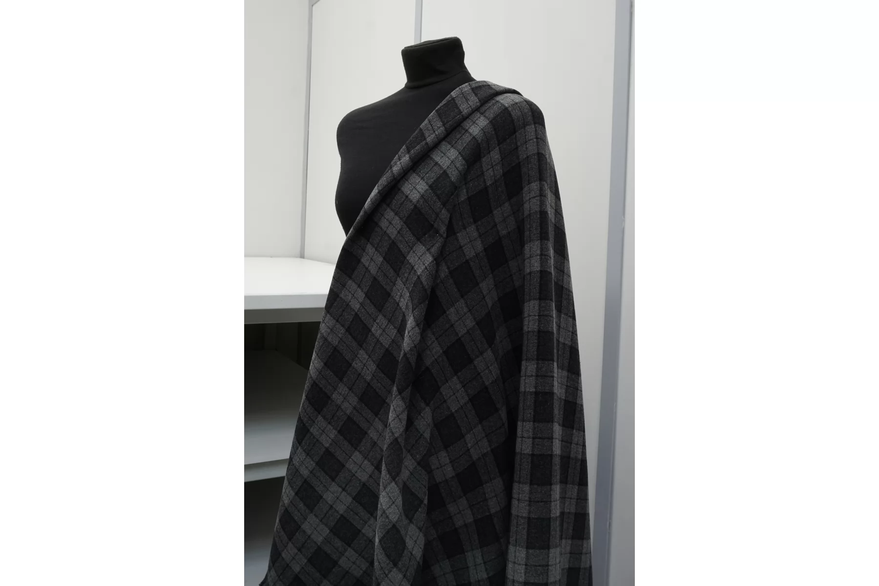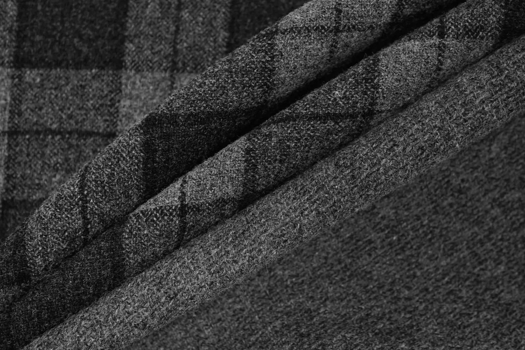 Пальтово-костюмная двухслойная шерсть, между слоёв вложен синтетический материал для объема и небольшого утепления. Одна сторона в клетку из нитей чёрного и серого цвета, другая однотонная серая. Тактильно слегка сухая. Не тянется. Форму держит. Не мнется. Отличный вариант для пошива пальто или тёплого жакета. Уход деликатный.
