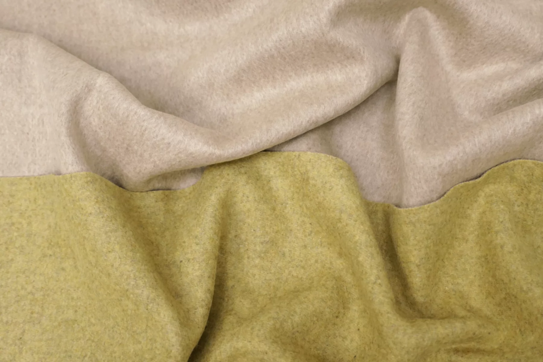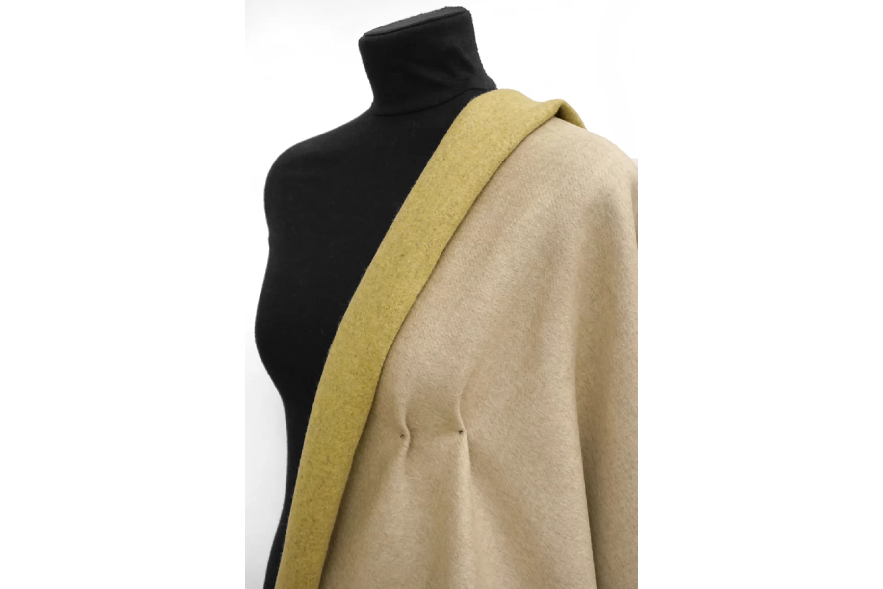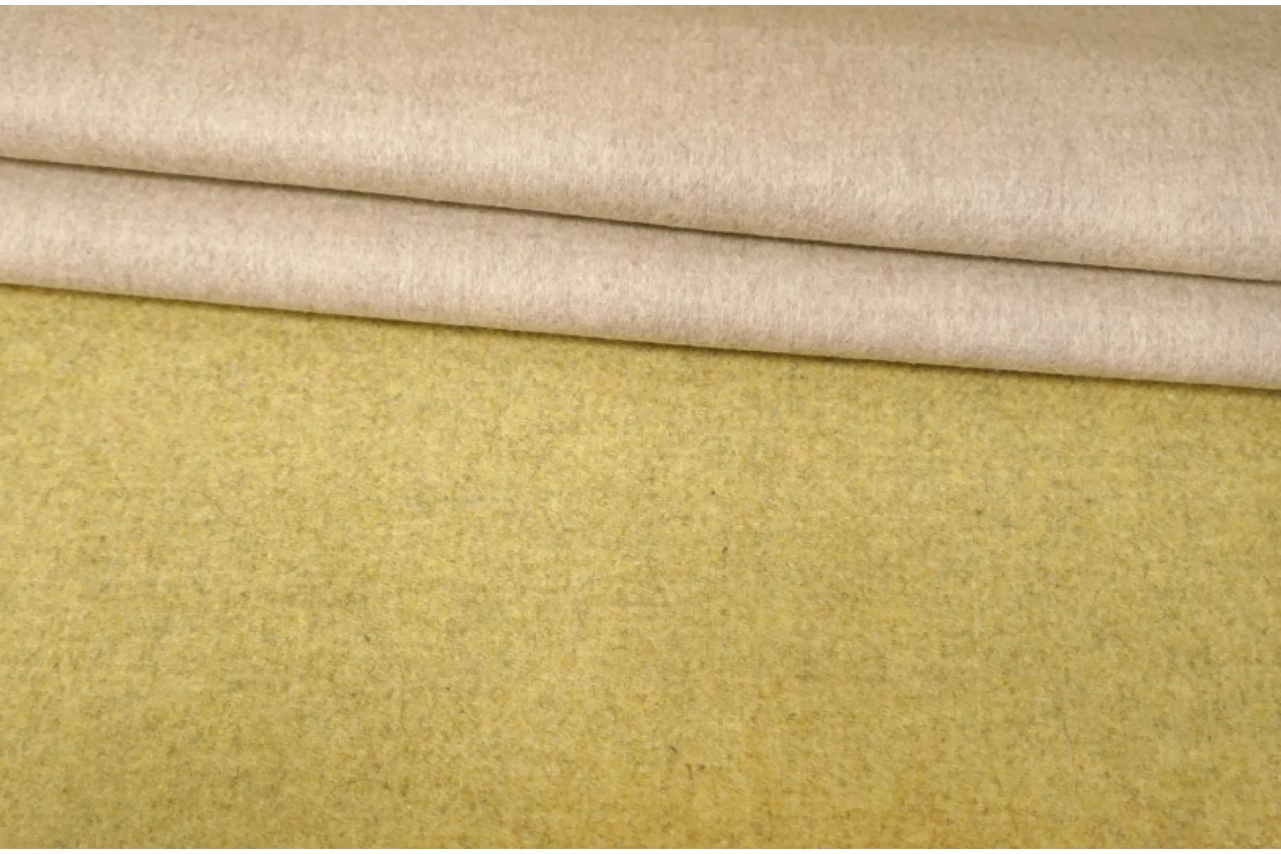 Шикарная двухслойная шерсть с альпакой костюмно-пальтовой плотности. Одна сторона припыленно-салатовая, ворс ненаправленный короткий прижатый, другая - светло-бежевая, ворс очень короткий направленный. С красивым лоском. Плотненький, около 1 мм толщиной. Не осыпается. Не просвечивает, отлично держит форму. Пластичный. Красив в складке. Не тянется. Прекрасный вариант на пальто, костюмы, утепленные жакеты, куртки-рубашки и другое. Уход - деликатный.