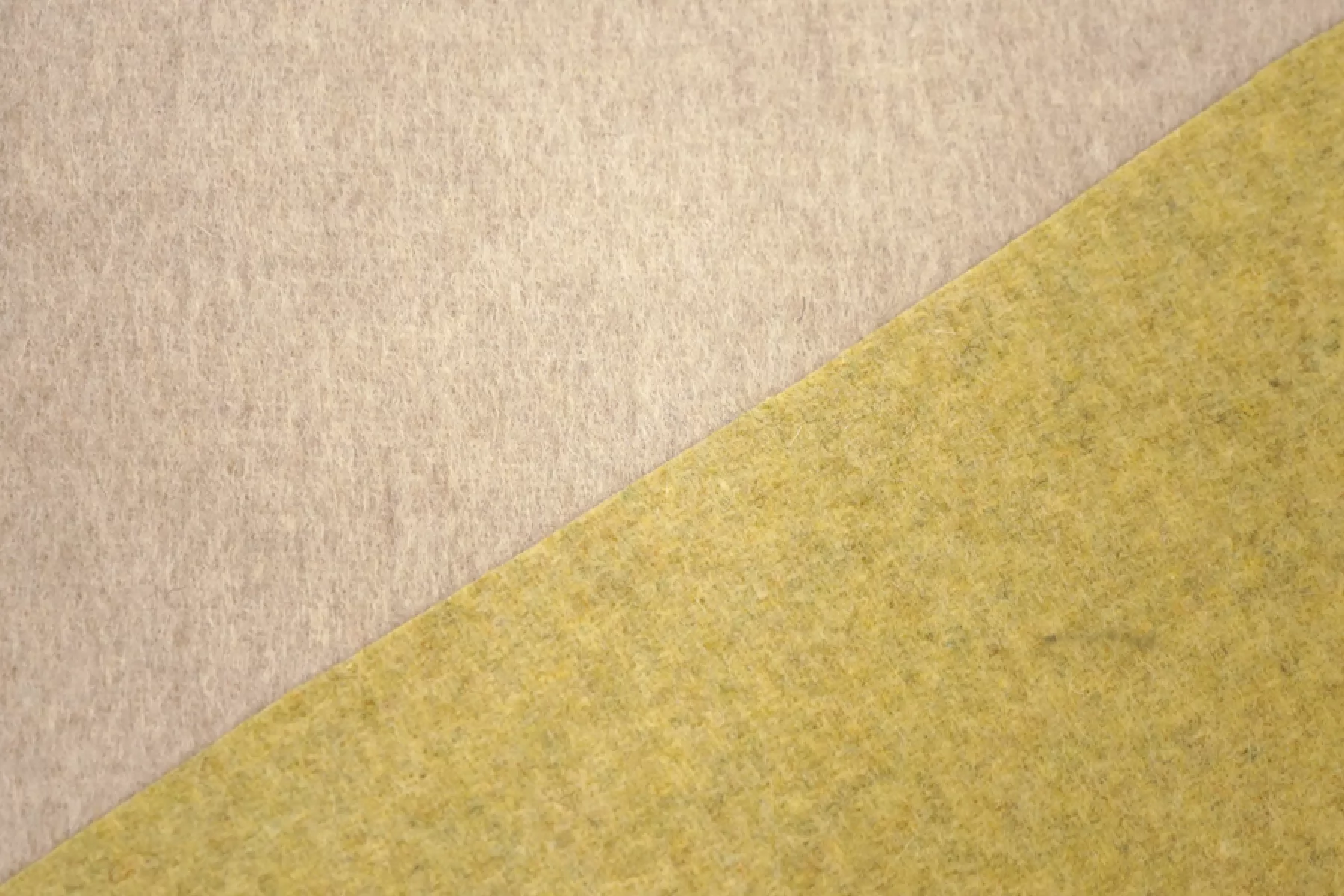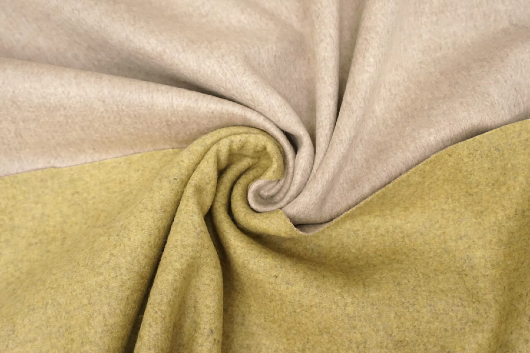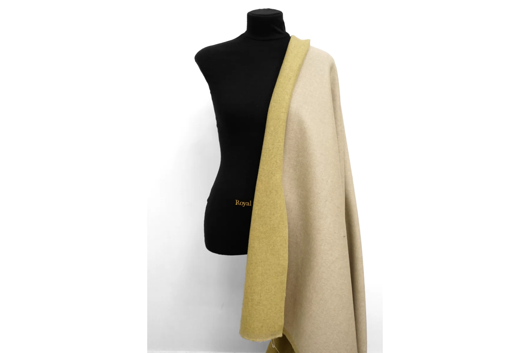 Шикарная двухслойная шерсть с альпакой костюмно-пальтовой плотности. Одна сторона припыленно-салатовая, ворс ненаправленный короткий прижатый, другая - светло-бежевая, ворс очень короткий направленный. С красивым лоском. Плотненький, около 1 мм толщиной. Не осыпается. Не просвечивает, отлично держит форму. Пластичный. Красив в складке. Не тянется. Прекрасный вариант на пальто, костюмы, утепленные жакеты, куртки-рубашки и другое. Уход - деликатный.