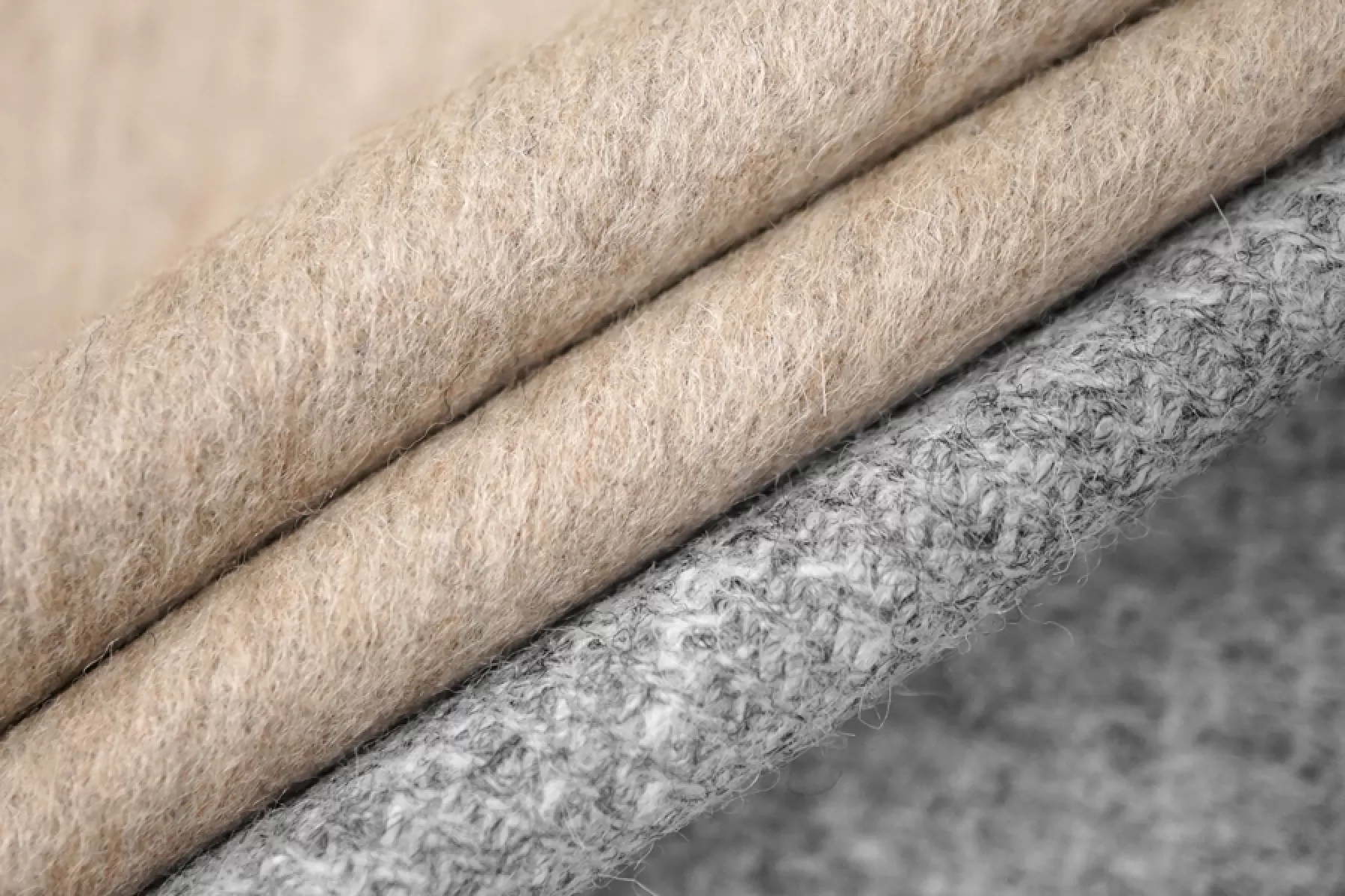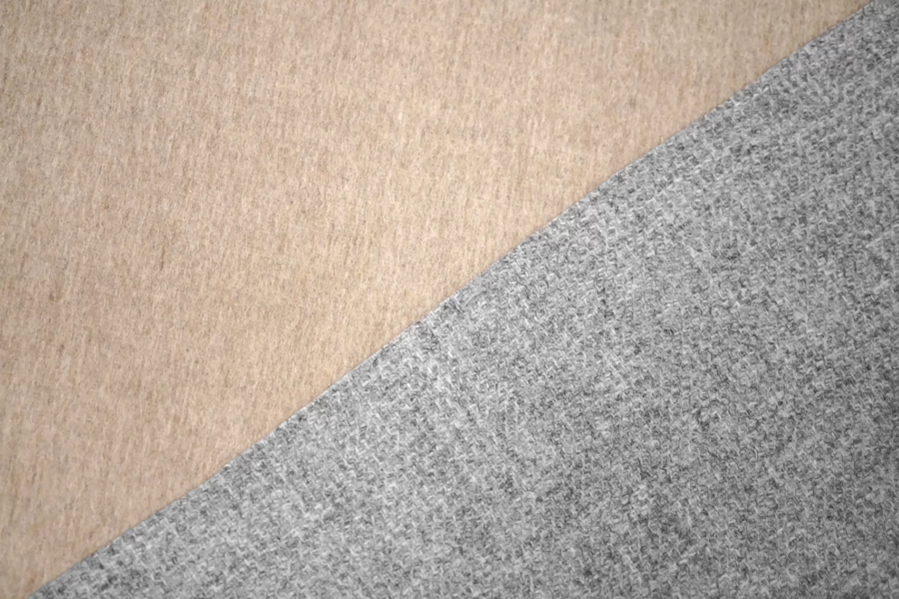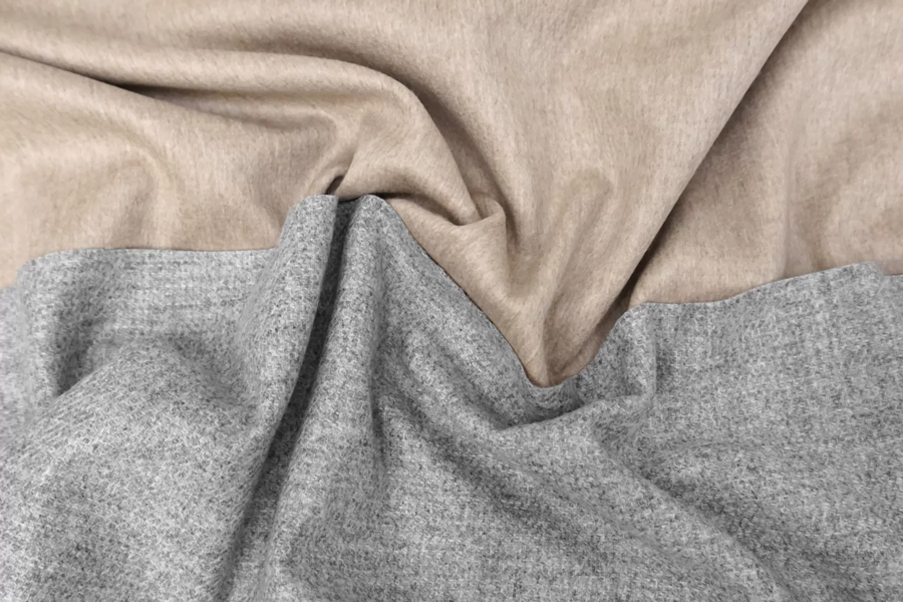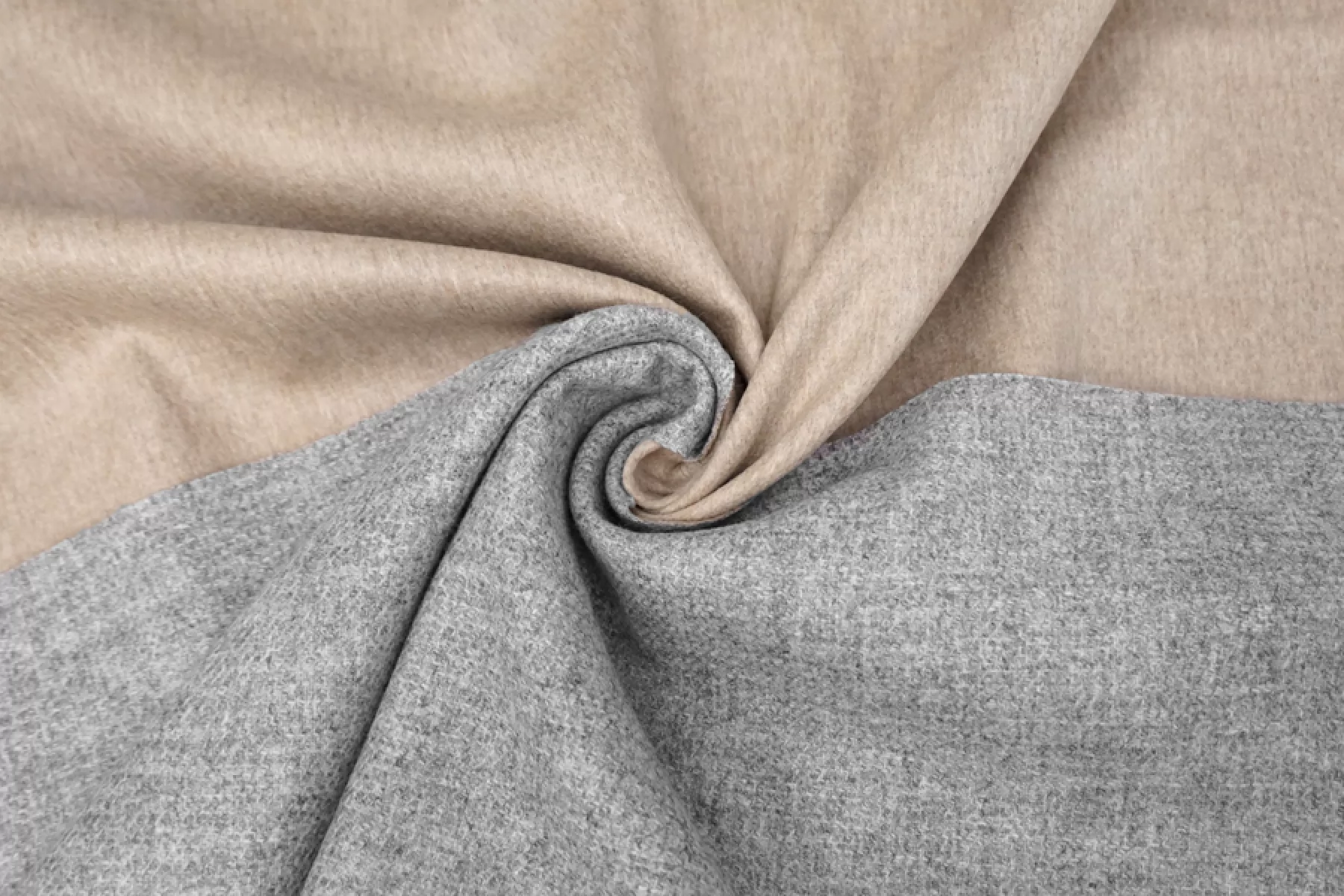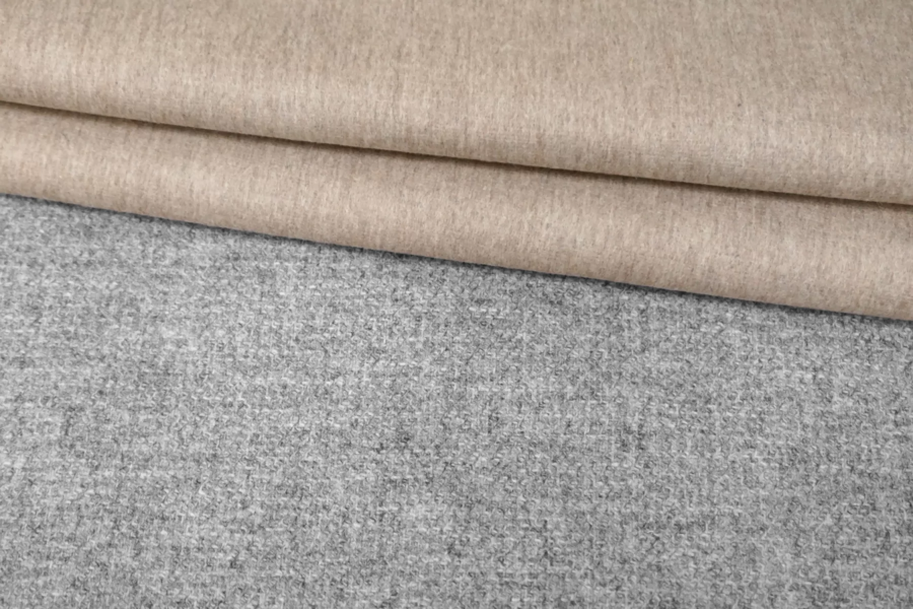 Прекрасная шерсть с альпакой двухслойная (слои сшиты и легко разделяются) и двусторонняя, одна сторона светло-бежевая с коротким направленным ворсом, другая серая с ярко-выраженным плетением. Бежевая сторона гладкая, серая - шероховатая. Материал колется. Достаточно тонкий, до1 мм толщиной. .Подойдет для пошива пальто, костюмов, теплых рубашек. Уход деликатный.
