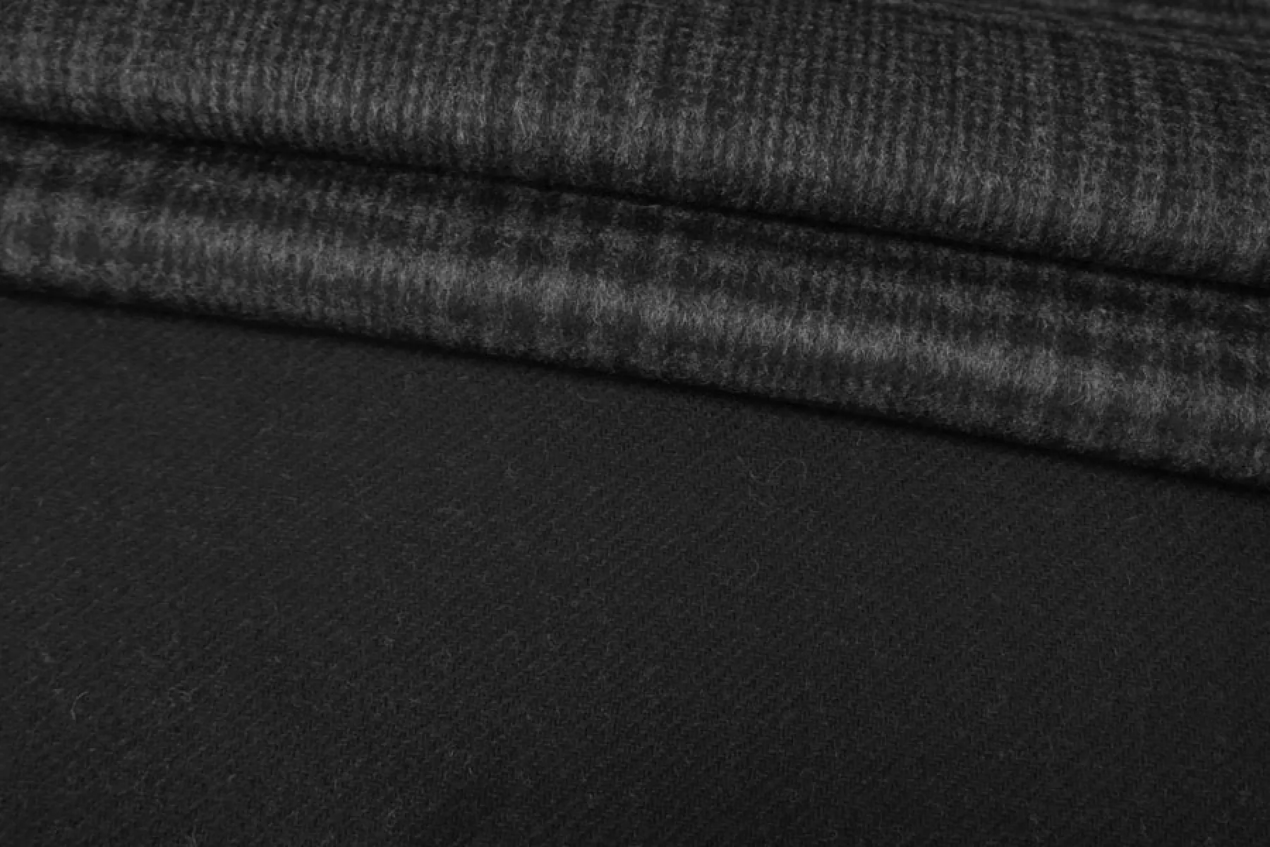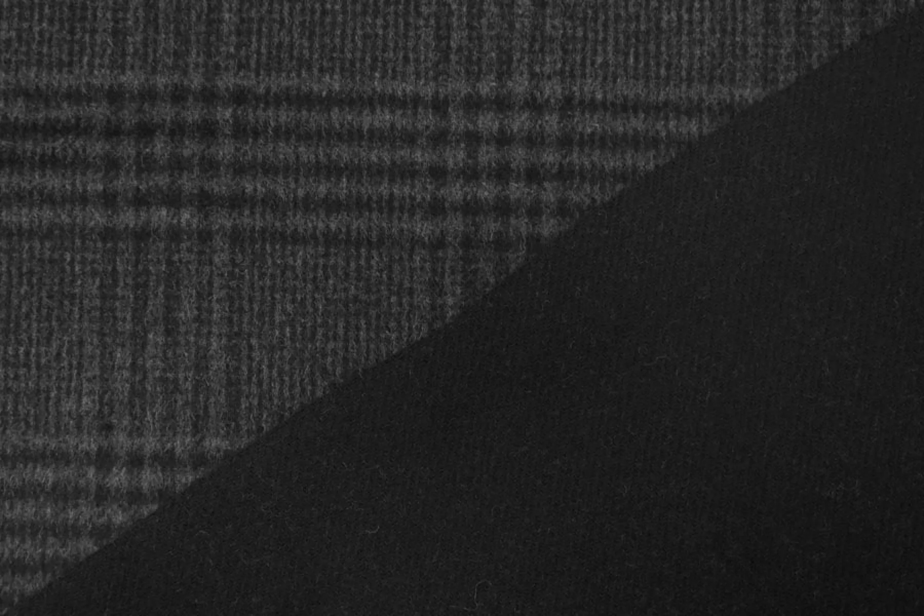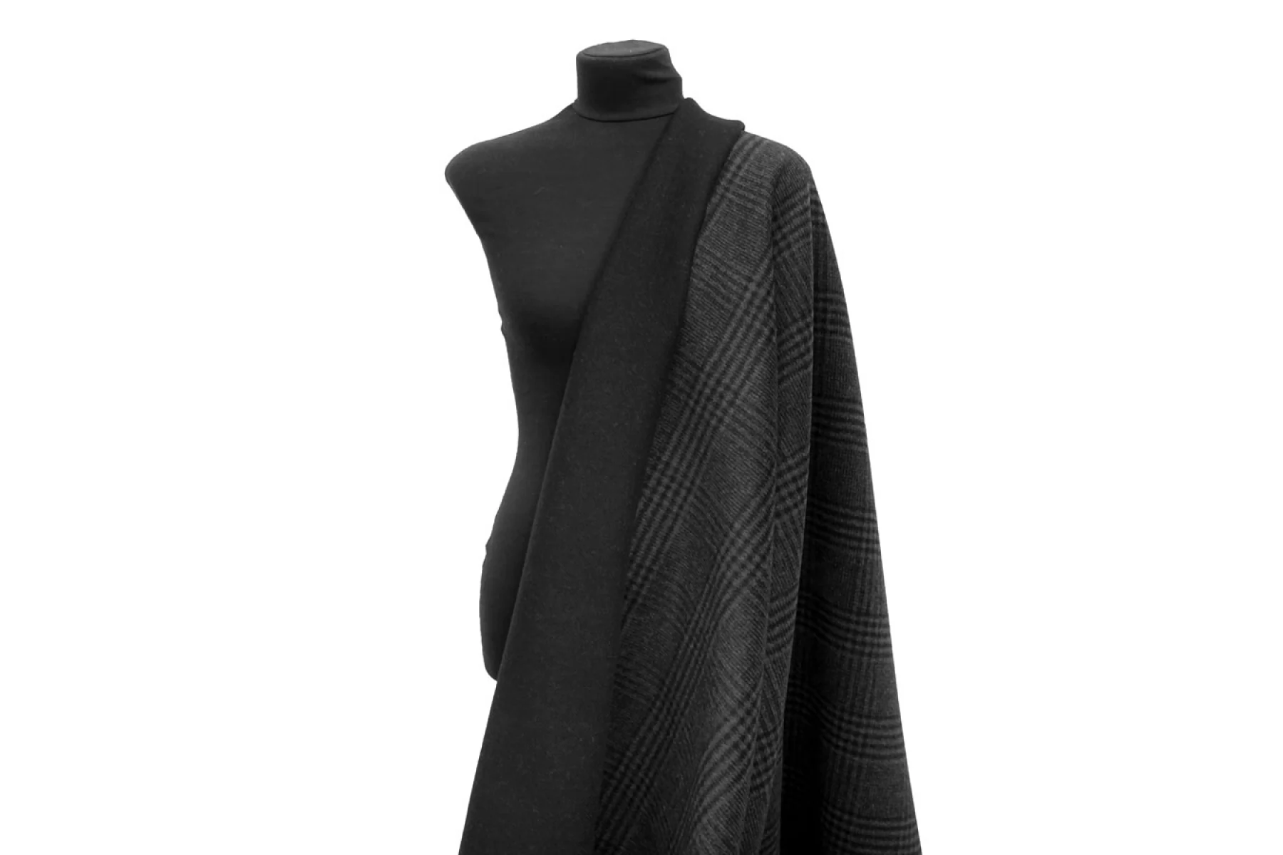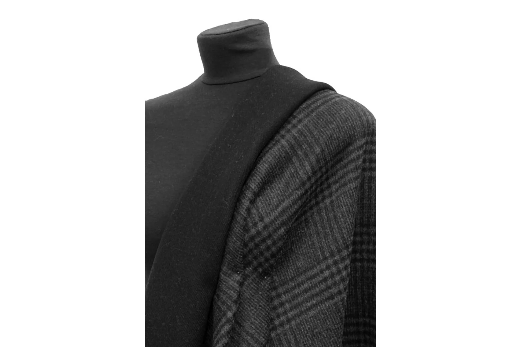 Шикарная пальтовая двусторонняя шерсть двуслойная (слои разделяются) одна сторона в крупную темно-серую клетку, другая однотонная черная. Ворс короткий направленный. Материал очень мягкий и приятный наощупь, гладкий. Примерно 1,5 мм толщиной. Совсем немного суховата наощупь, немножко колется Не тянется. Форму держит. Не мнется. Пластичный, не просвечивает. Красиво драпируется. Отличный вариант на пальто. Уход деликатный.