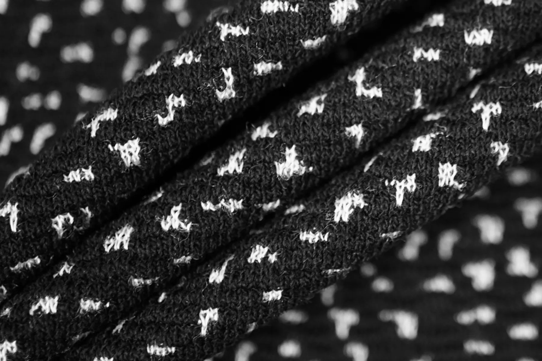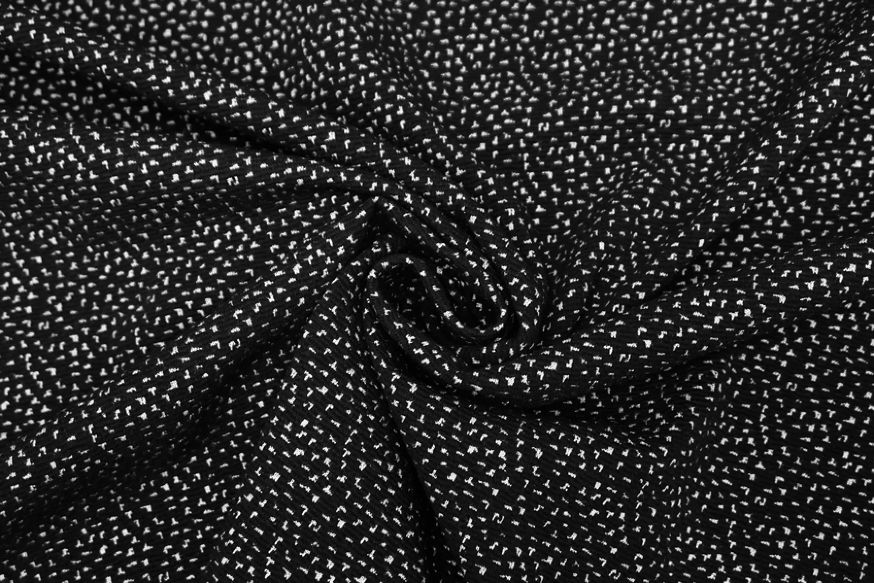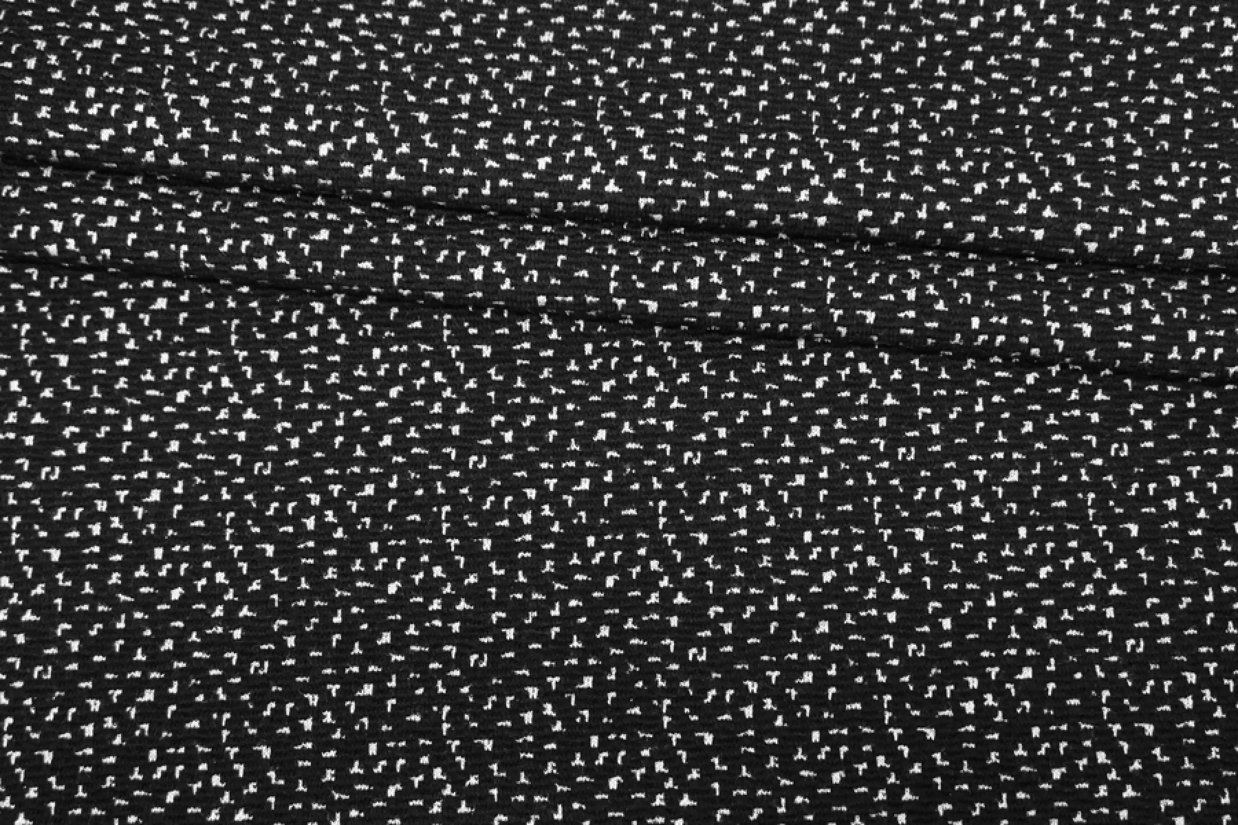 Хлопковый фактурный трикотаж джерси в черно-белом цвете. Материал тактильно слегка жестковатый, изнаночная сторона - гладка и блестящая. Не просвечивает. Не мнется. Не просвечивает. Хорошо тянется. Хорошо драпируется и держит форму. Отлично подойдет на любые трикотажные изделия, юбки, кардиганы, кофты, костюмные варианты и не только. Уход деликатный.