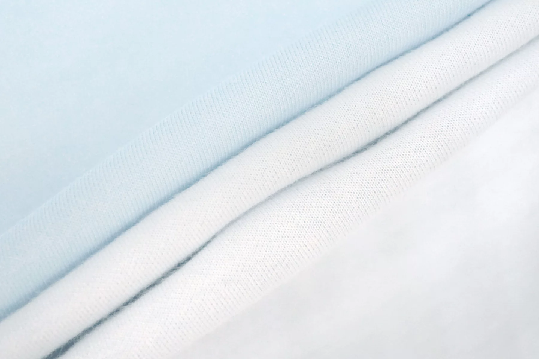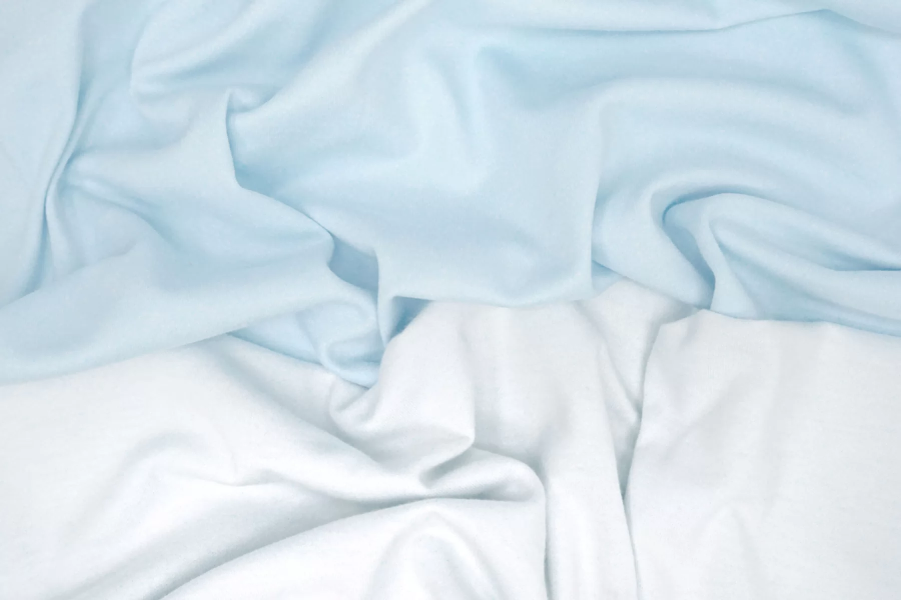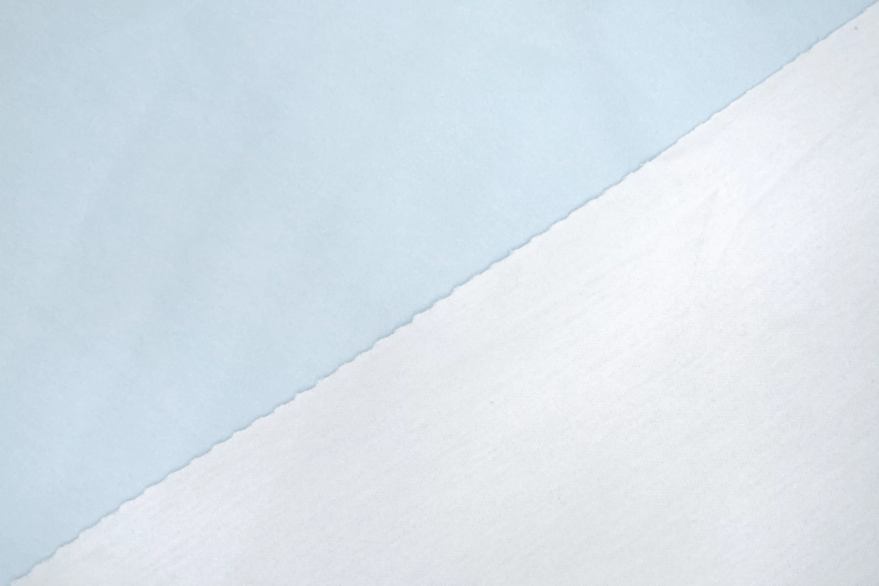 Шикарный двусторонний хлопковый джерси от бренда Monnalisa, одна сторона голубая, другая - белая. Гладкий, плотный, мягкий. Тянется благодаря плетению. Хорошо держит форму, тем не менее все равно очень пластичный и эластичный. Не мнется, не просвечивает. Идеальный вариант на костюмы, платья, юбки. Учитывайте возможную усадку.