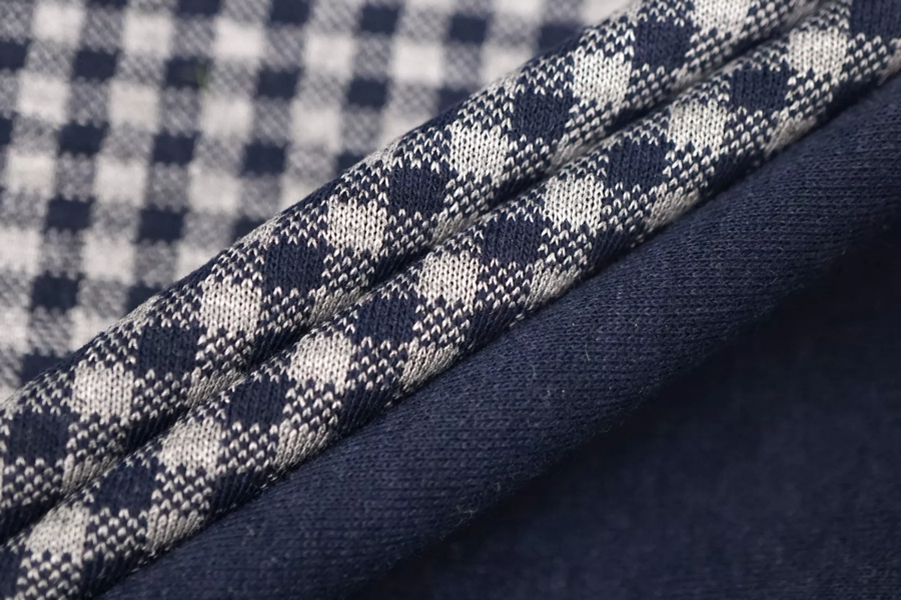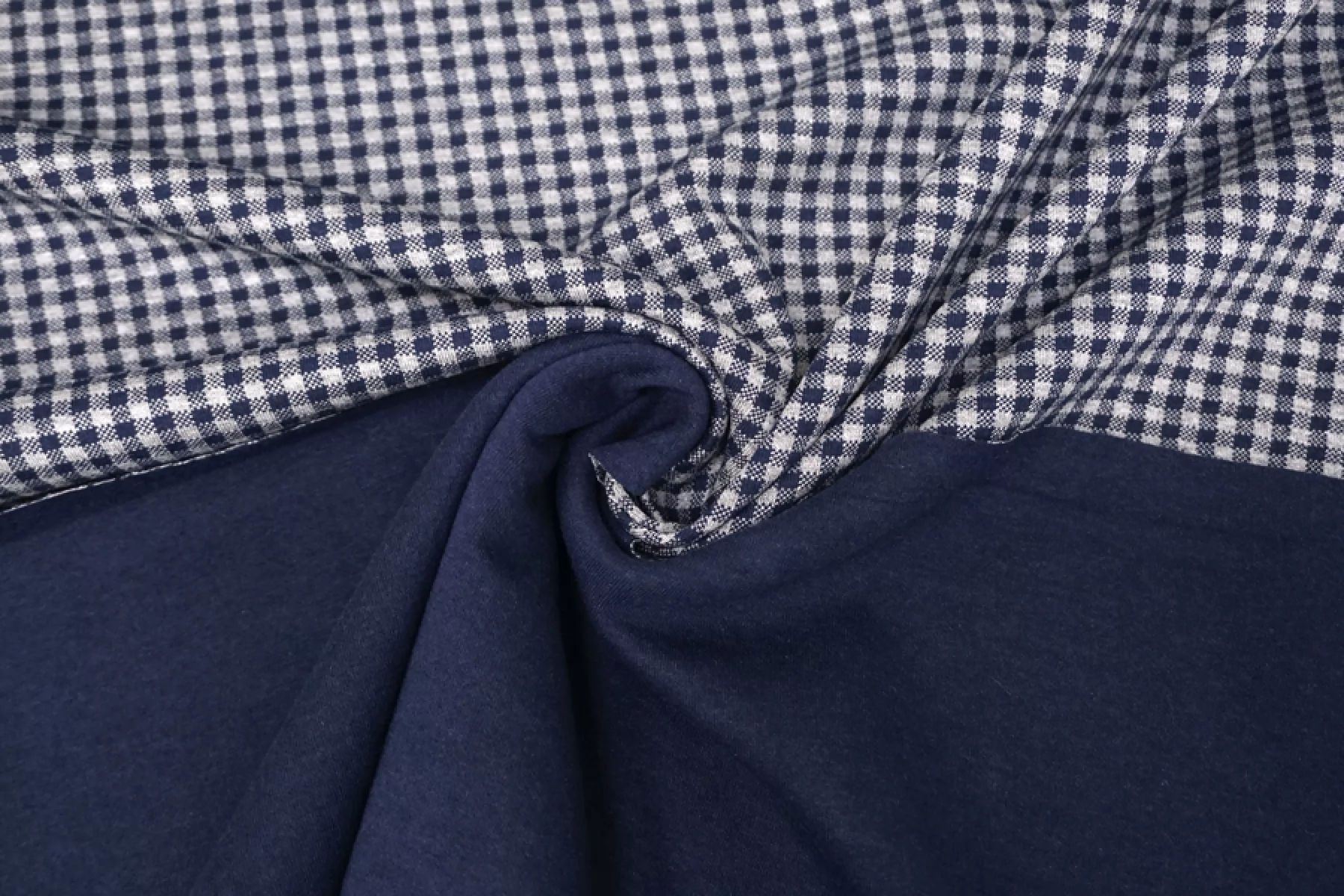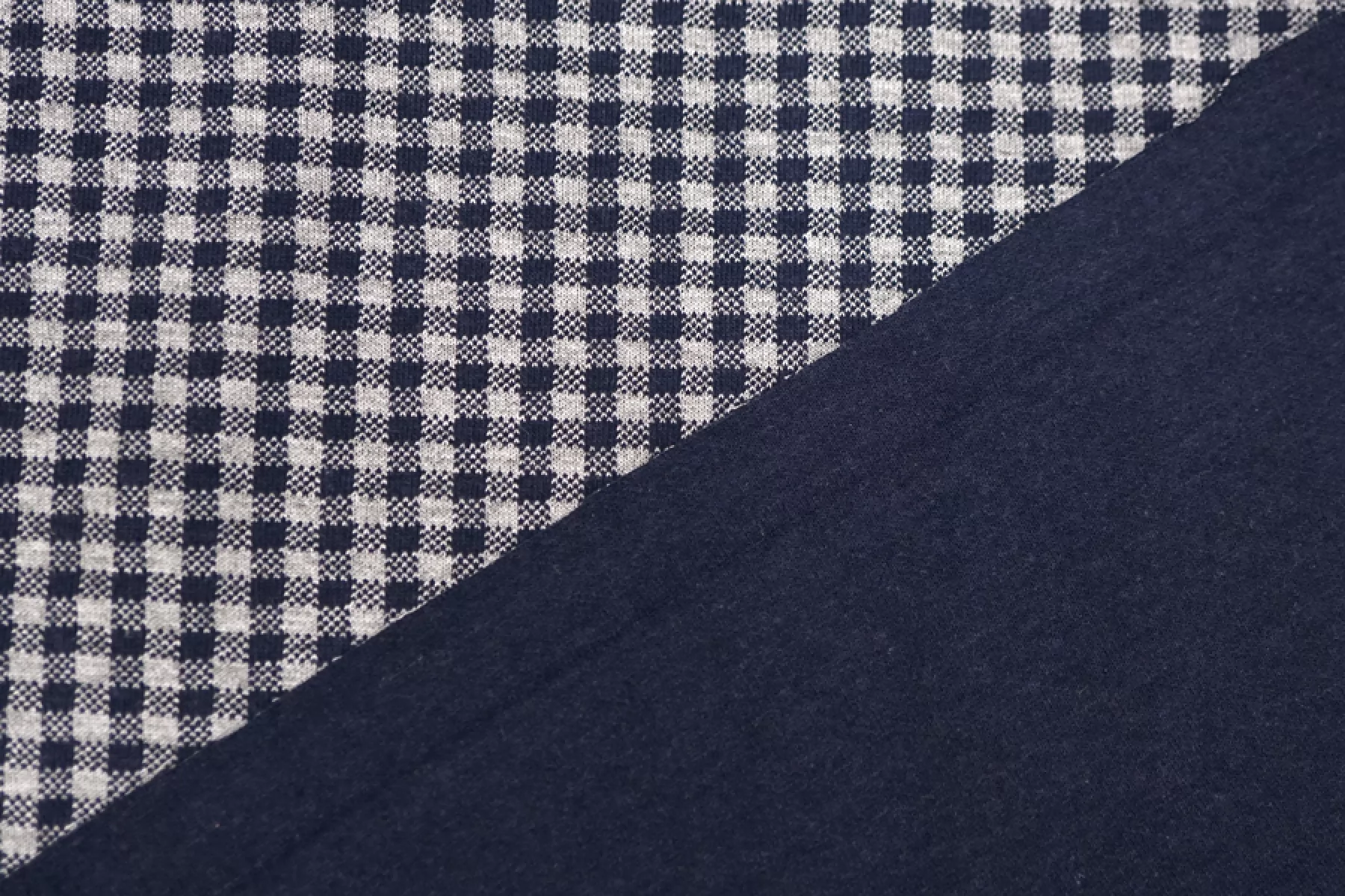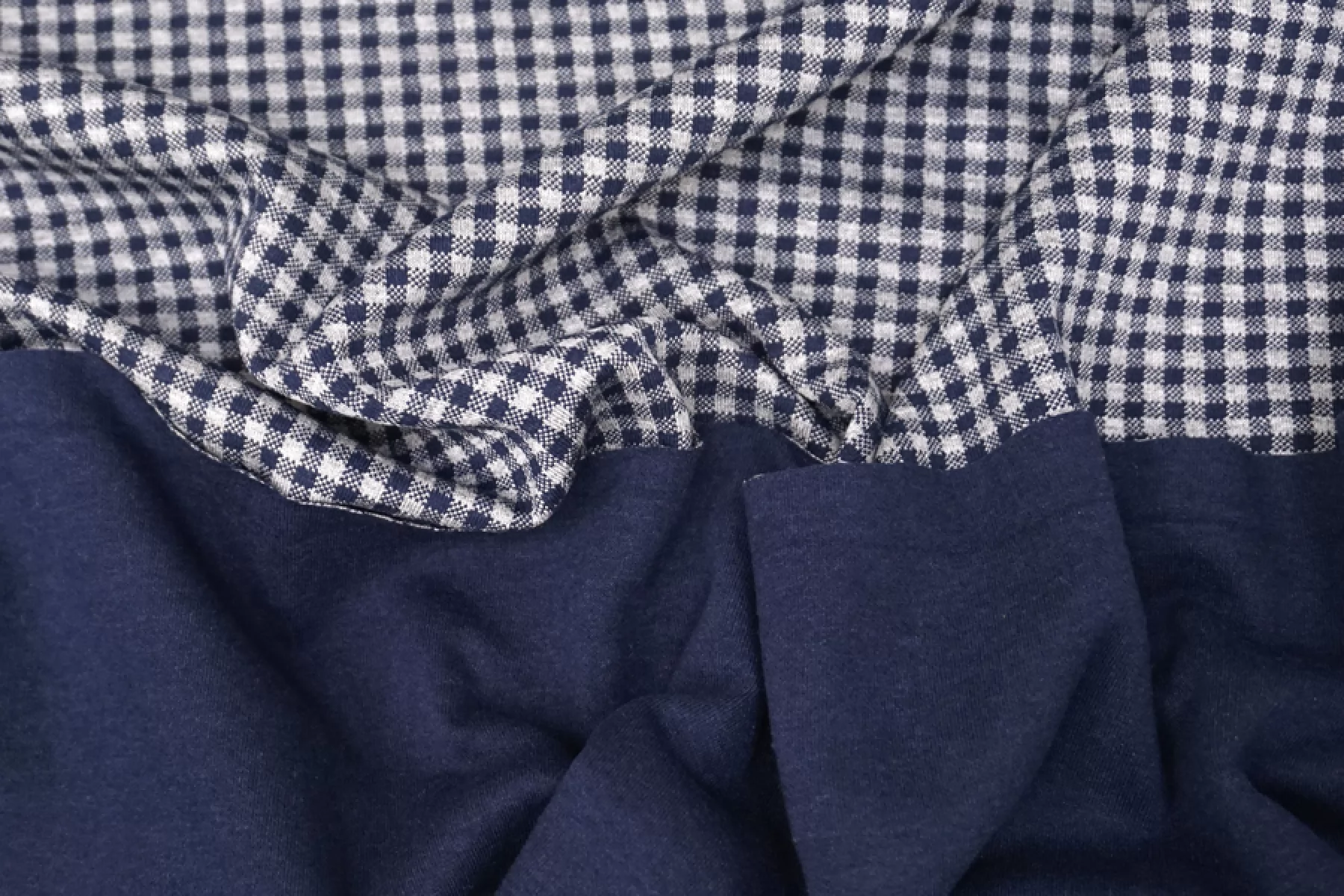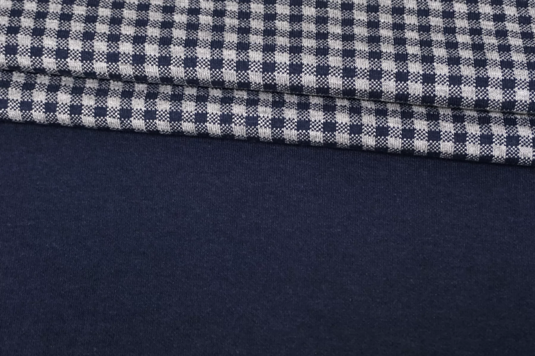 Прекрасный хлопковый фактурный джерси в мелкую клетку серого и синего цвета, одна сторона однотонная синяя. Мягкий и приятный наощупь. Немножко тянется. Не просвечивает. Плотненький. Форму держит. Пластичный. Подойдет для пошива костюмов, платьев, мягкий жакетов. Учитывайте возможную усадку.