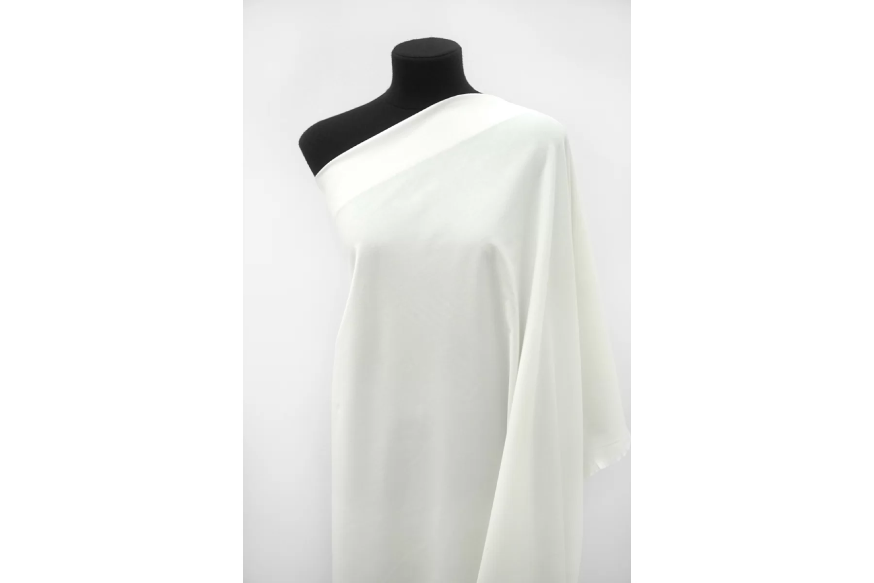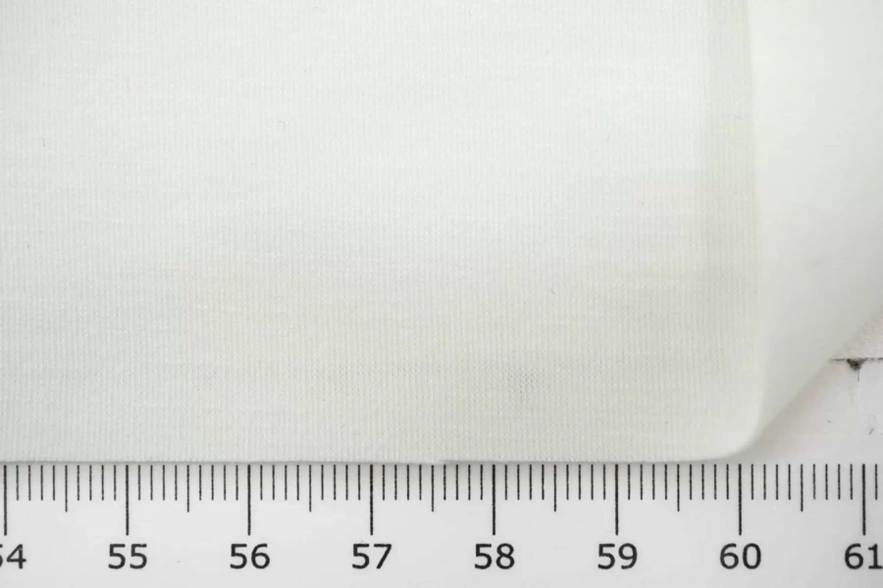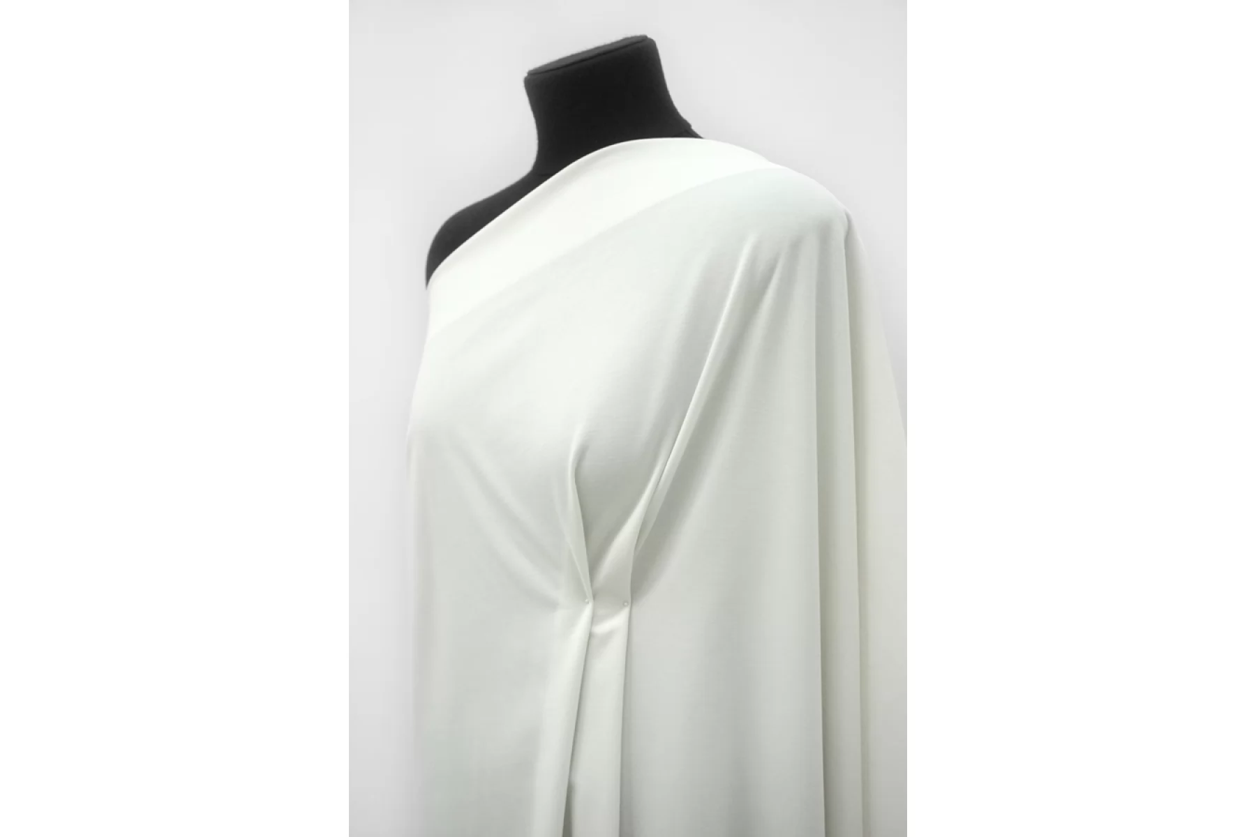 Трикотаж-джерси в белом цвете с очень легким молочным подтоном. Тонкий но при этом плотный. Эластичный, упругий, пластичный, при растяжении просвечивает. Подойдет для пошива платья, юбки.