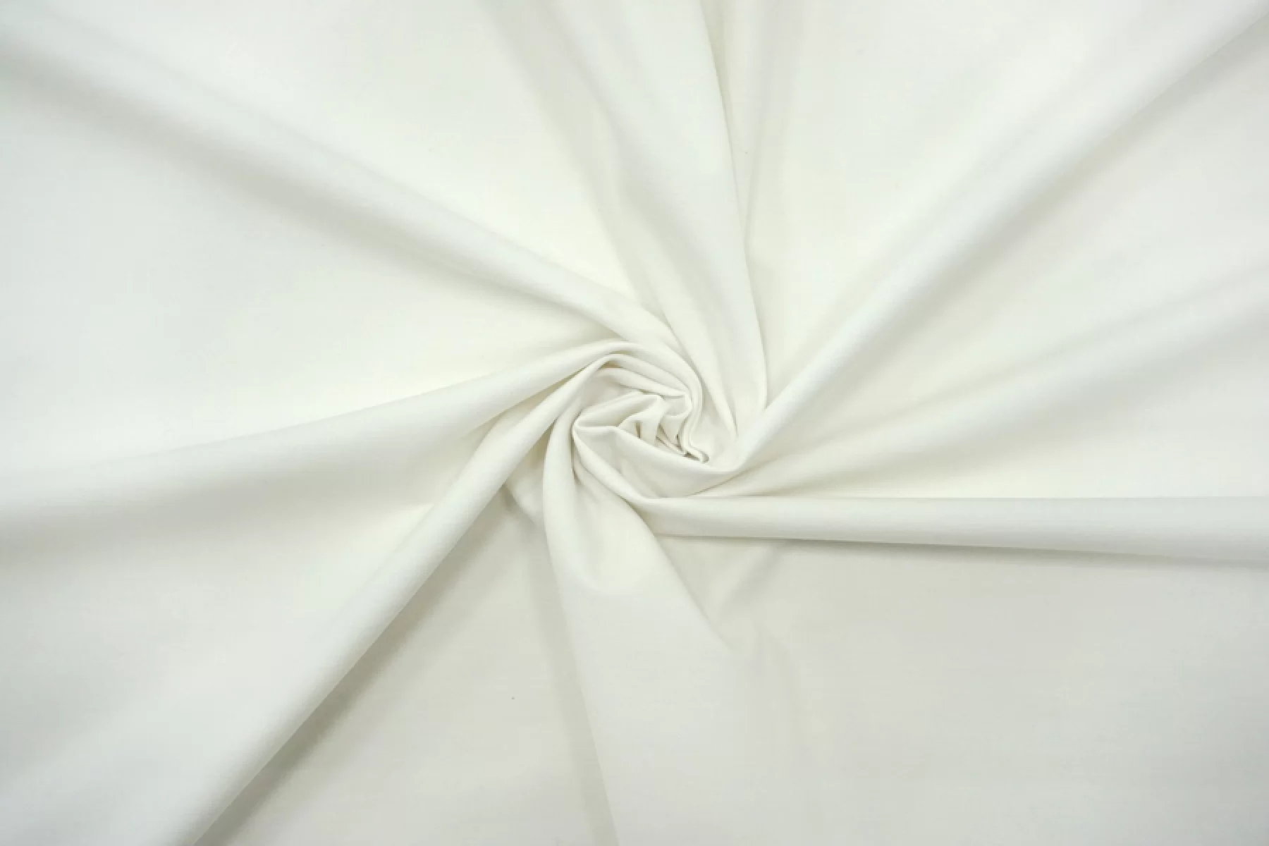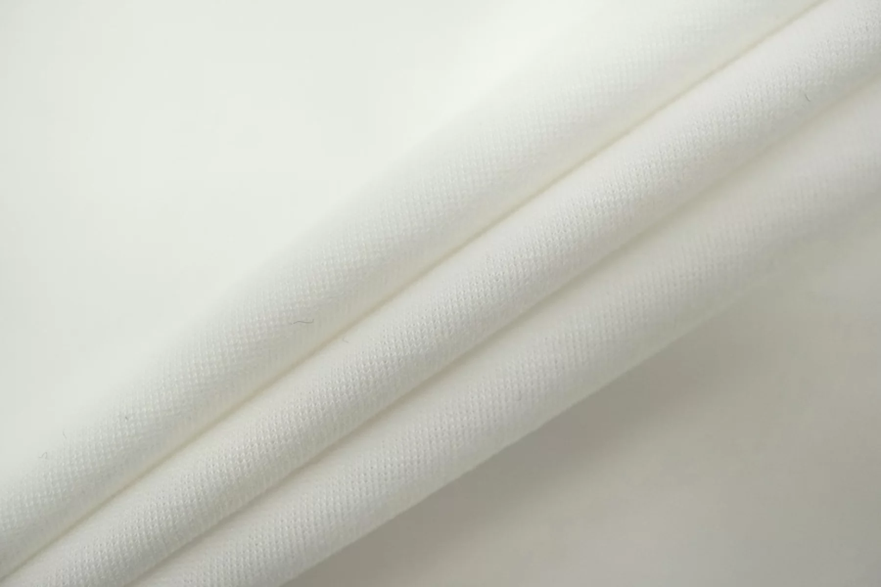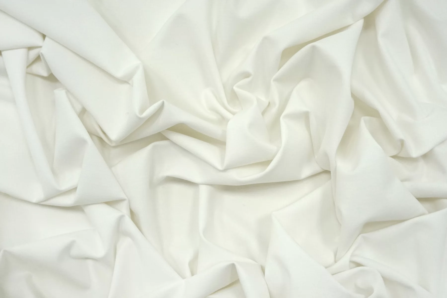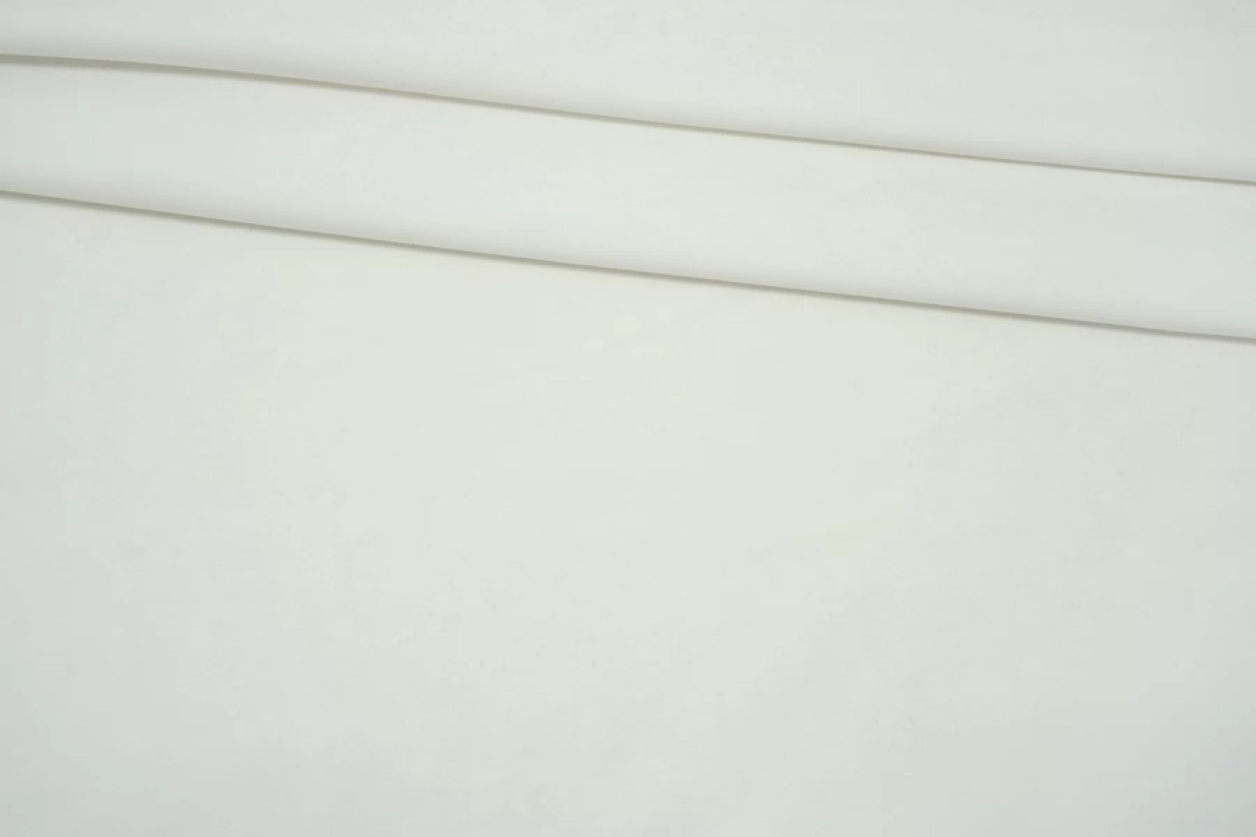 Трикотаж-джерси в белом цвете с очень легким молочным подтоном. Тонкий но при этом плотный. Эластичный, упругий, пластичный, при растяжении просвечивает. Подойдет для пошива платья, юбки.