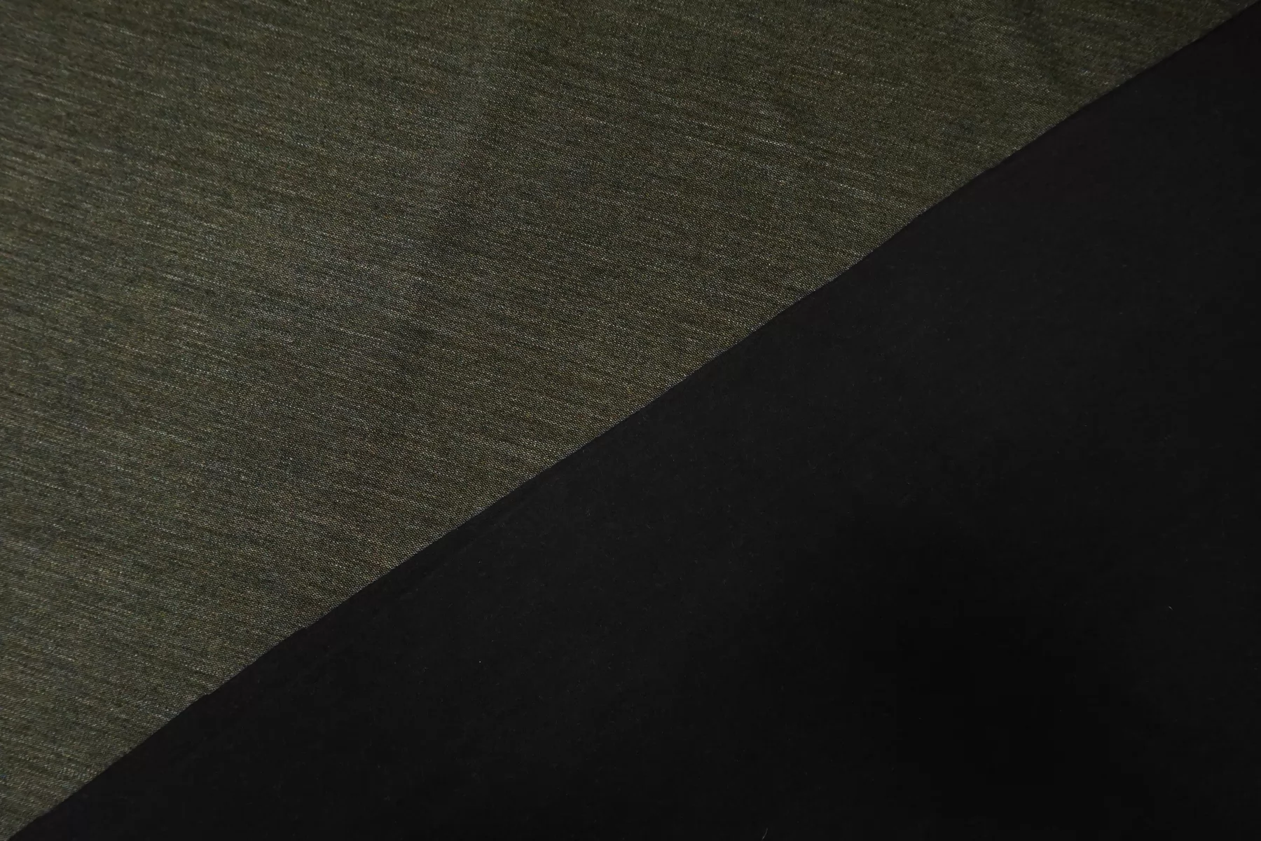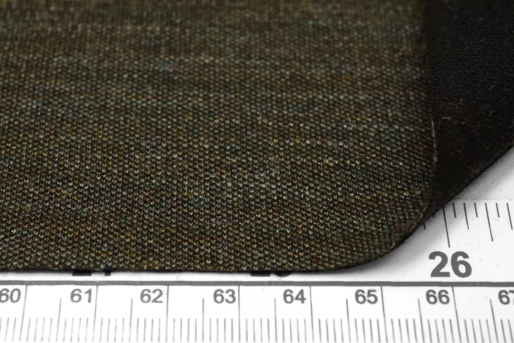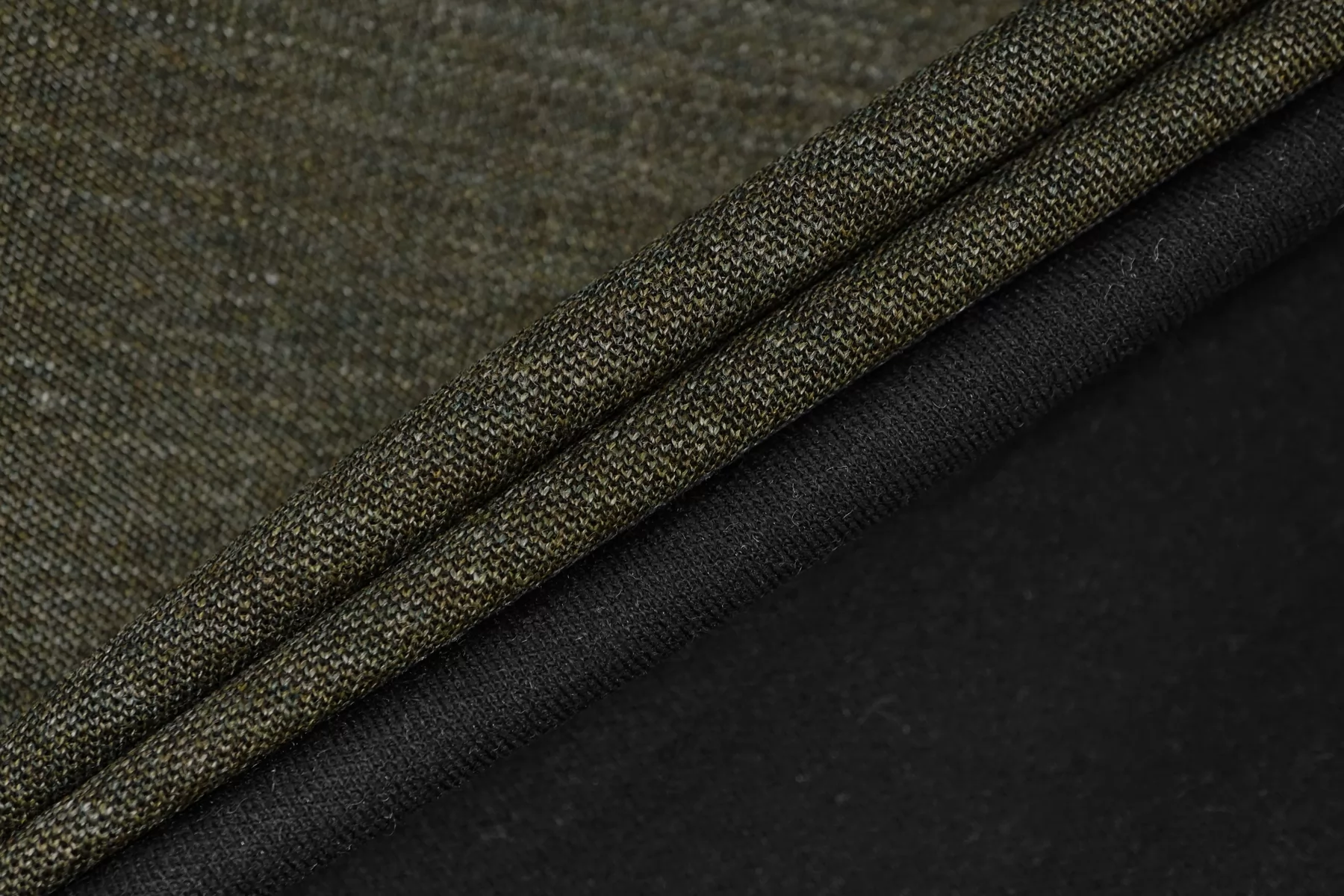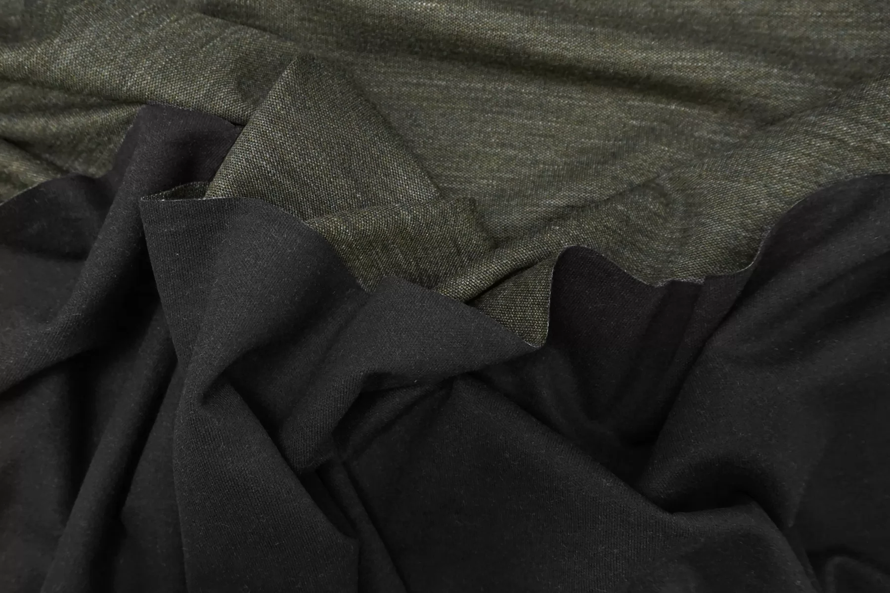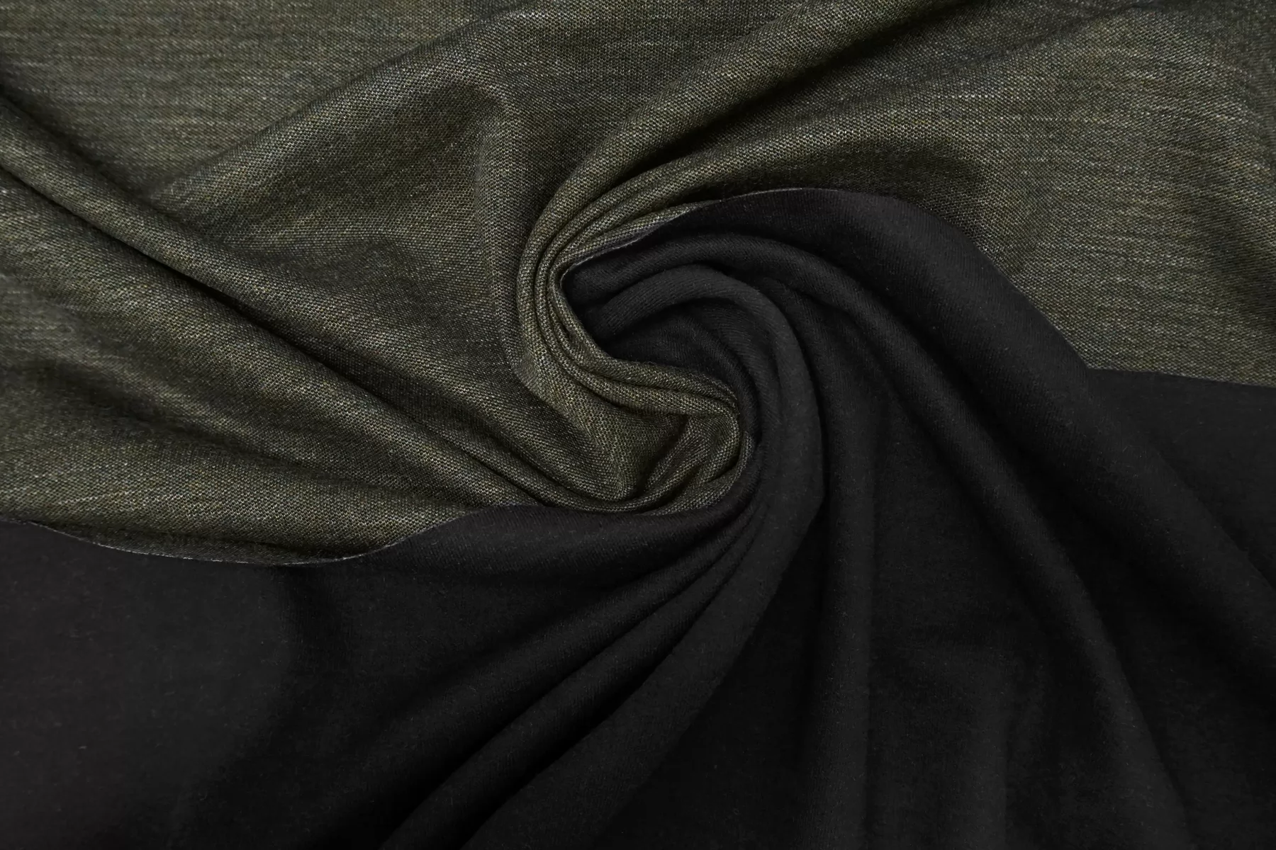 Вискозный трикотаж, одна сторона из нитей серого и болотно-зелёного цвета, другая сторона однотонная чёрная. Мягкий и приятный наощупь. Упруго тянется. Не просвечивает. Пластичный. Подойдет для пошива костюмов мягкой формы, платьев, юбок. Учитывайте возможную усадку.