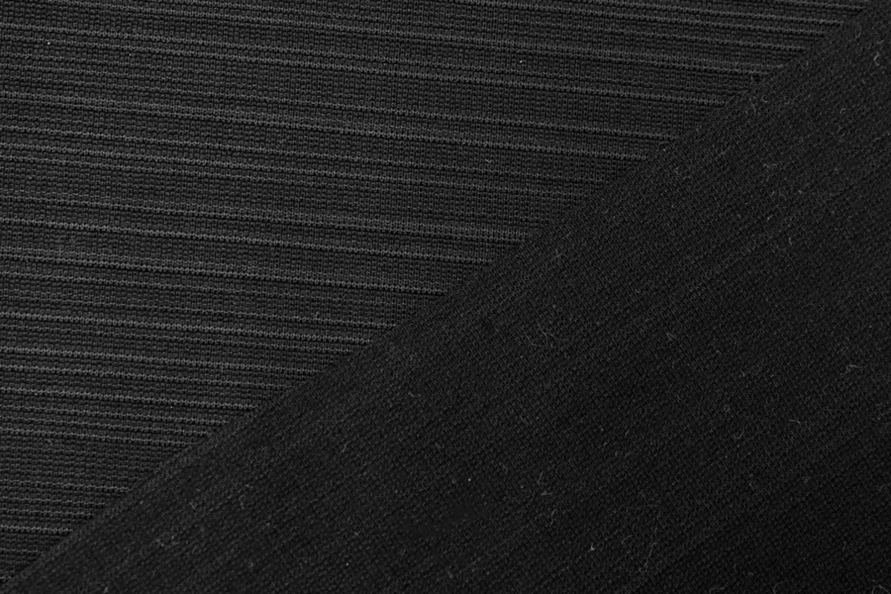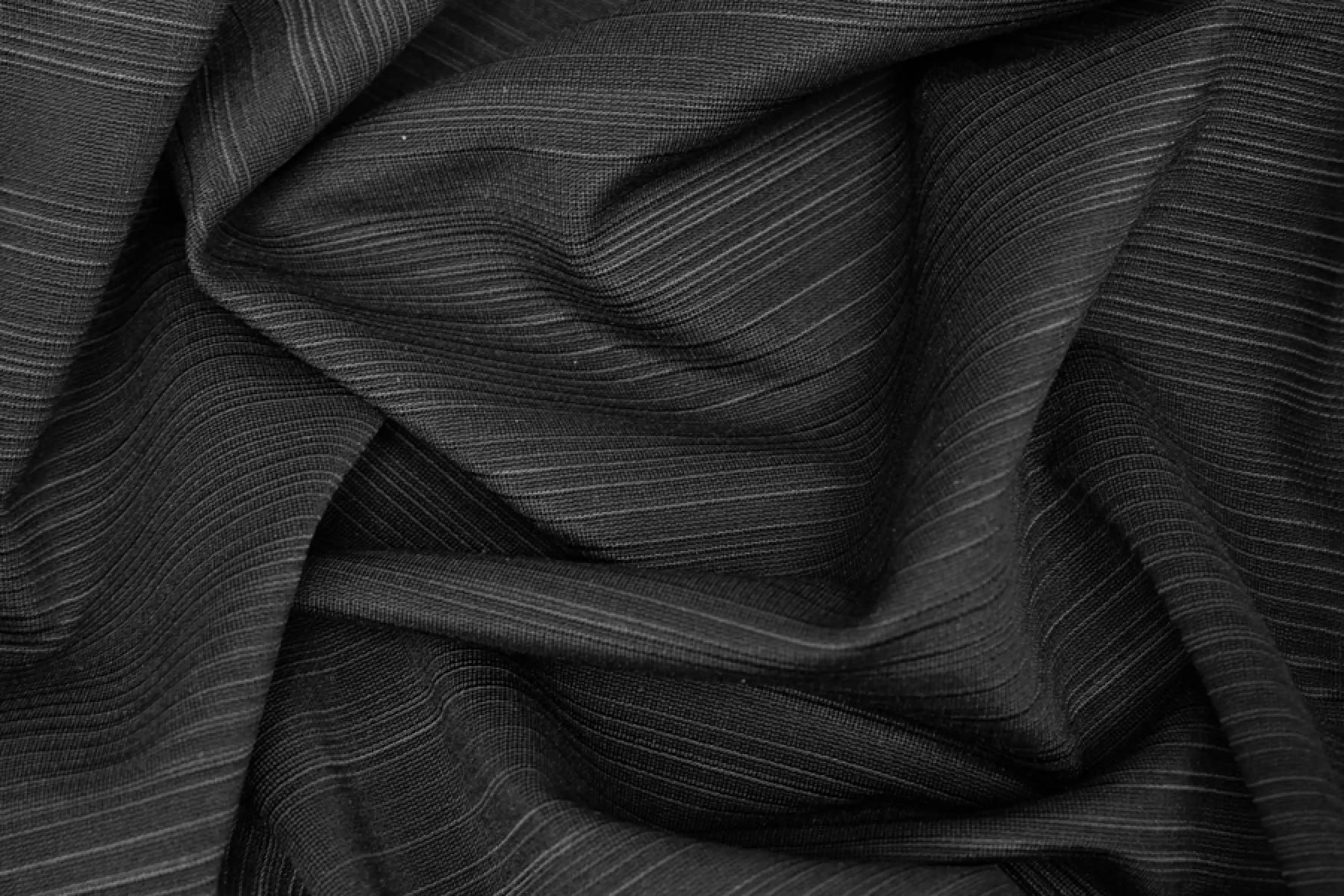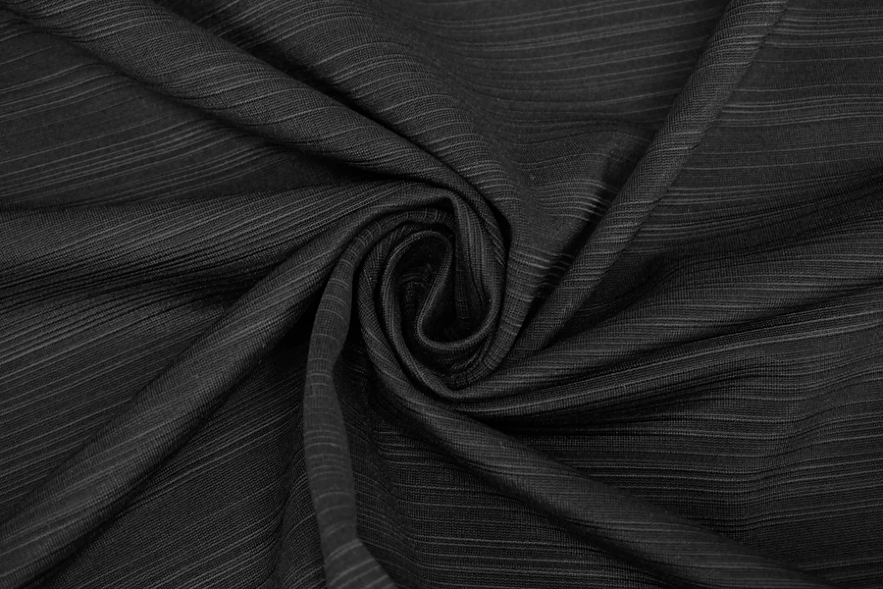 Классный вискозный джерси черного оттенка. Материал фактурный в полоску вдоль ширины. Тактильно суховатый, но приятный и мягкий. Пластичный, неплохо держит форму. Сминается, но восстанавливается практически полностью. Отлично, при этом упруго, тянется во все стороны за счет плетения и эластана. Плотненький, не просвечивает. Хорошо драпируется. Вариант на платья, кофты, юбки и не только. Обязательно учитывайте усадку 5-10%.
