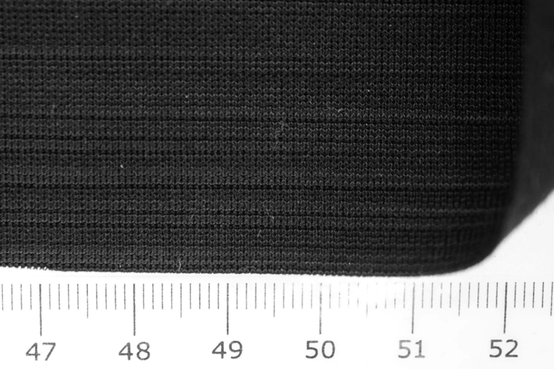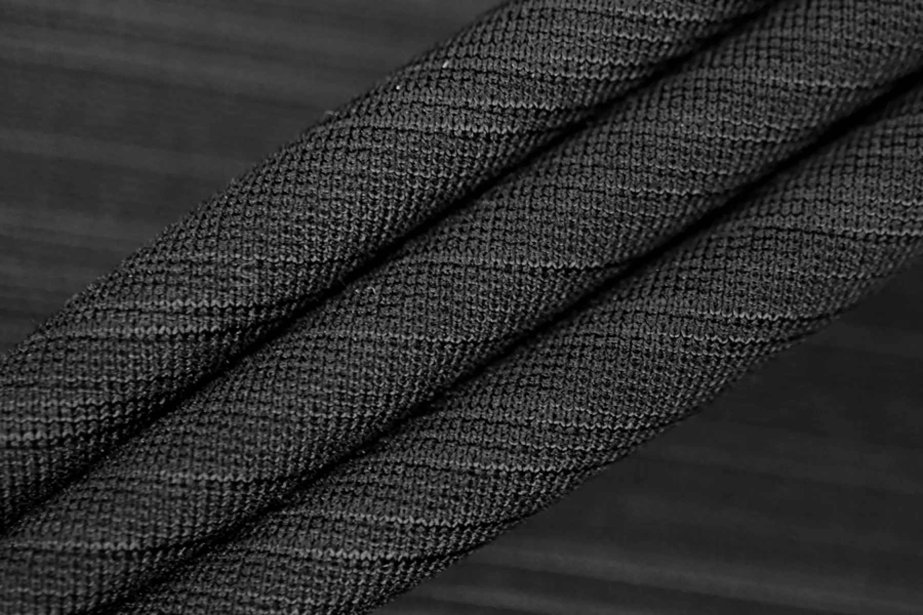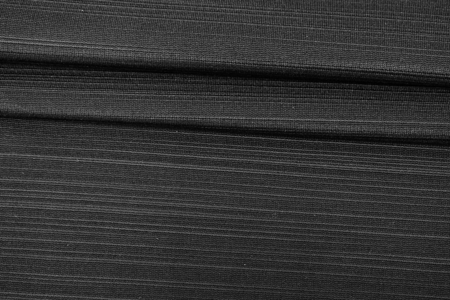 Классный вискозный джерси черного оттенка. Материал фактурный в полоску вдоль ширины. Тактильно суховатый, но приятный и мягкий. Пластичный, неплохо держит форму. Сминается, но восстанавливается практически полностью. Отлично, при этом упруго, тянется во все стороны за счет плетения и эластана. Плотненький, не просвечивает. Хорошо драпируется. Вариант на платья, кофты, юбки и не только. Обязательно учитывайте усадку 5-10%.