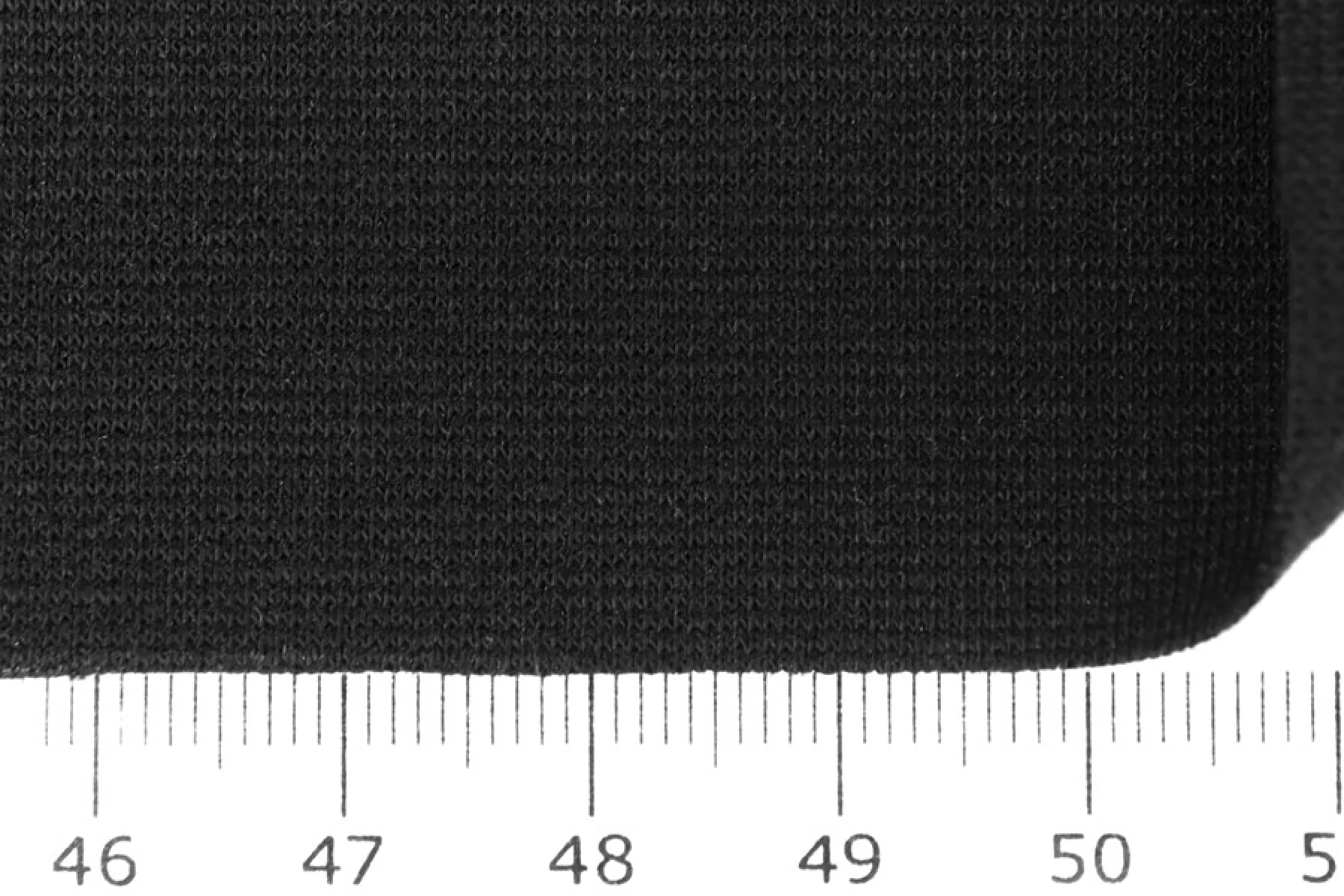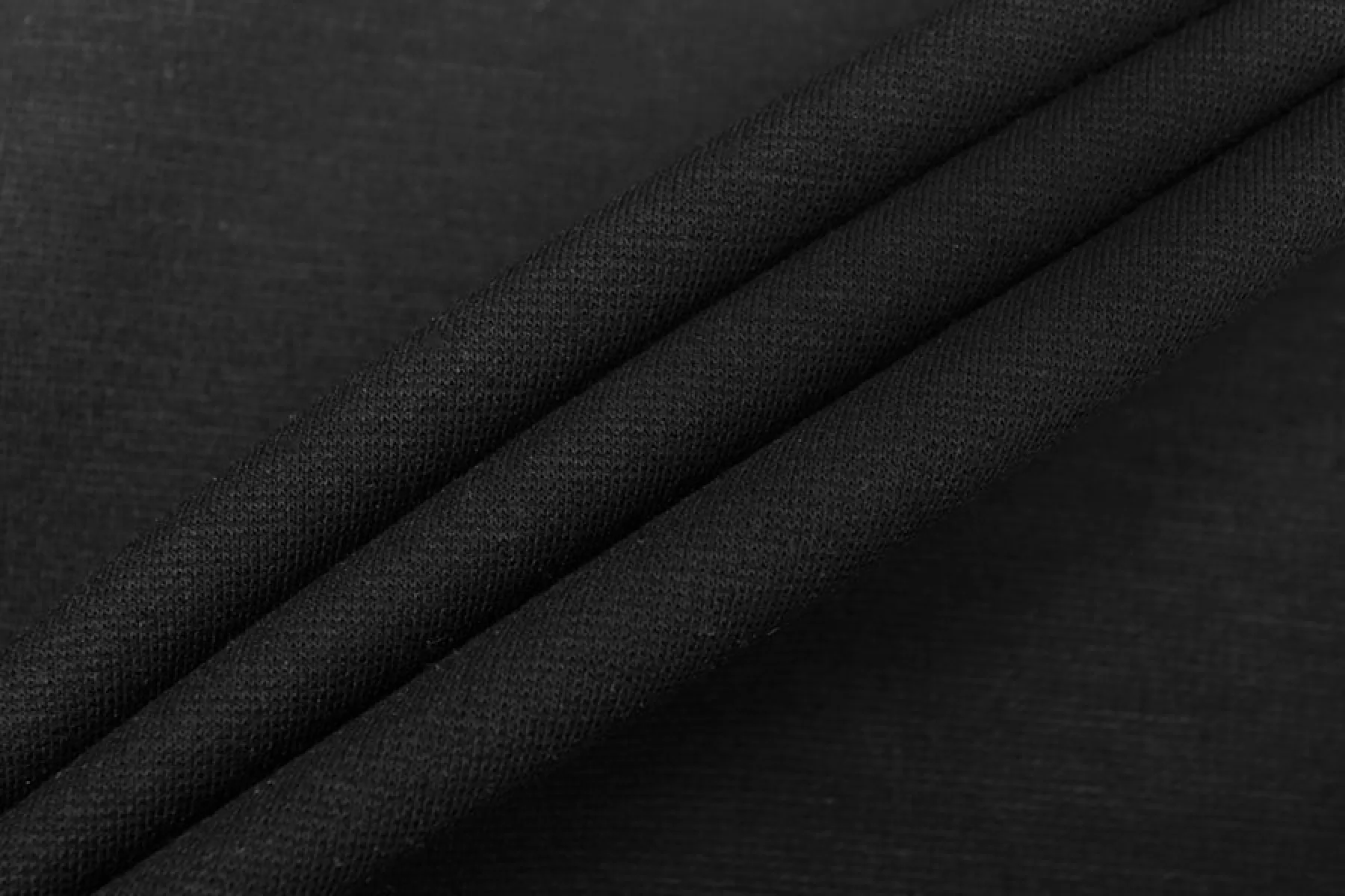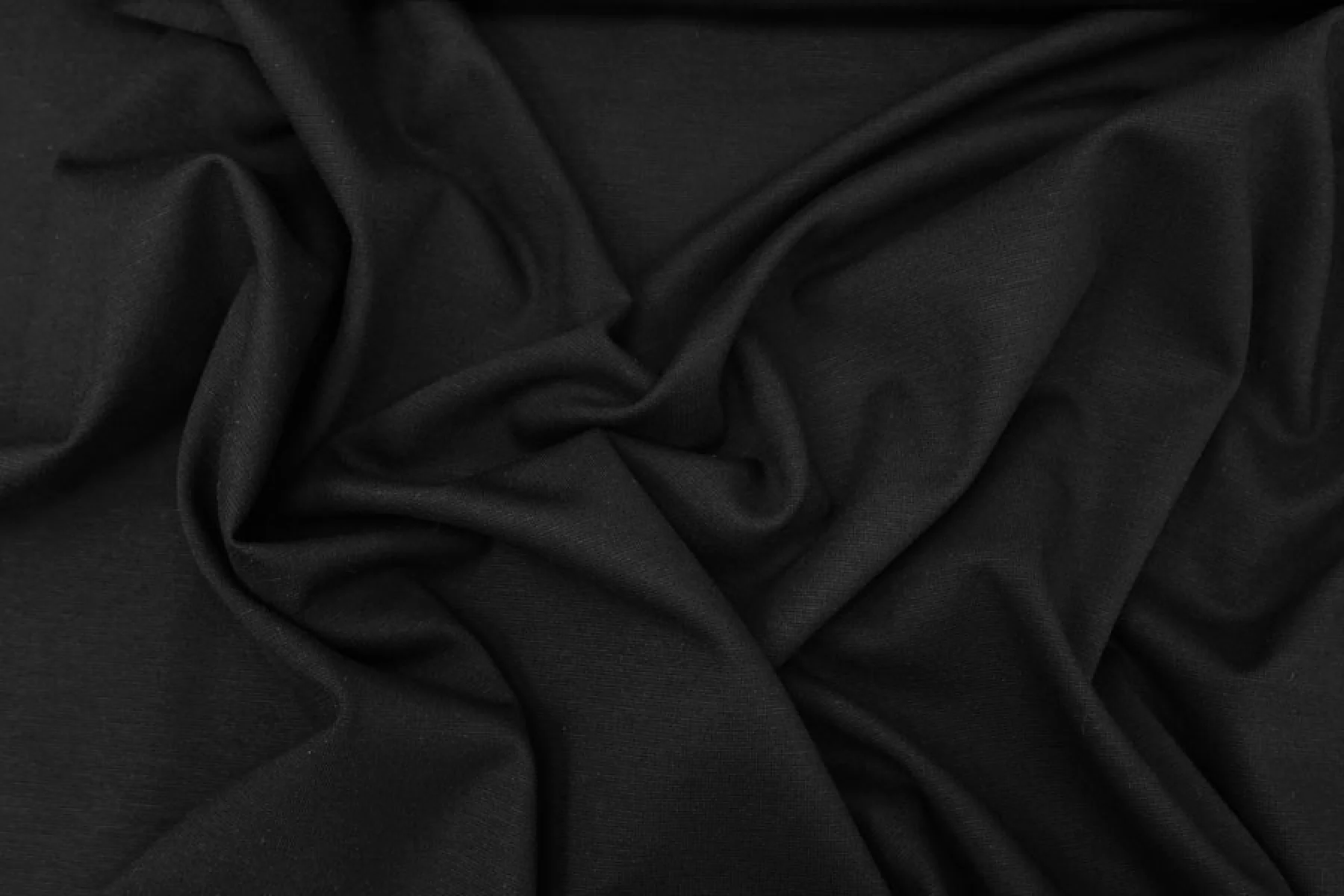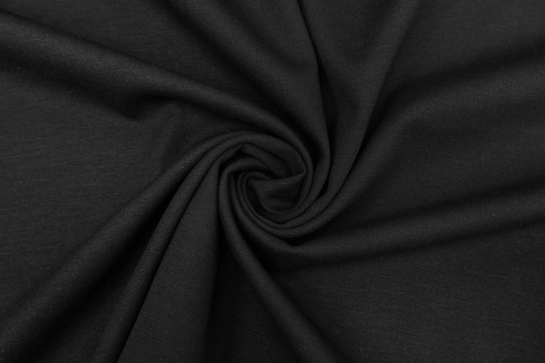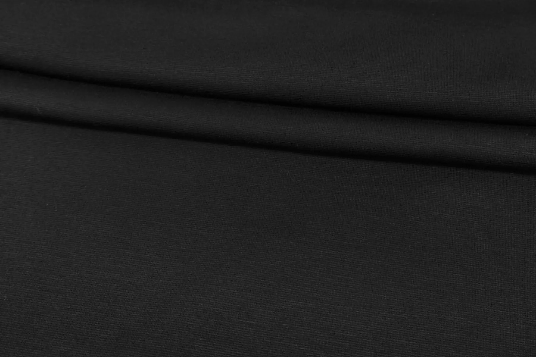 Вискозный джерси черного цвета. Тактильно приятный, гладкий, плотный. Пластичный. Практически не сминается. Упруго тянется за счет плетения. Не просвечивает. Хорошо драпируется и неплохо держит форму. Обладает очень легким матовым лоском. Шьем платья, кофты, костюмы, юбки и брюки на резинке и не только. Обязательно учитывайте усадку 5-10%.