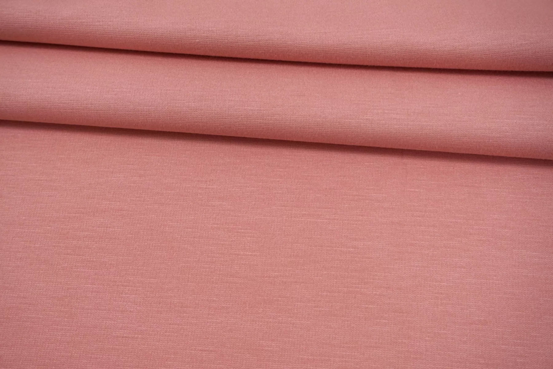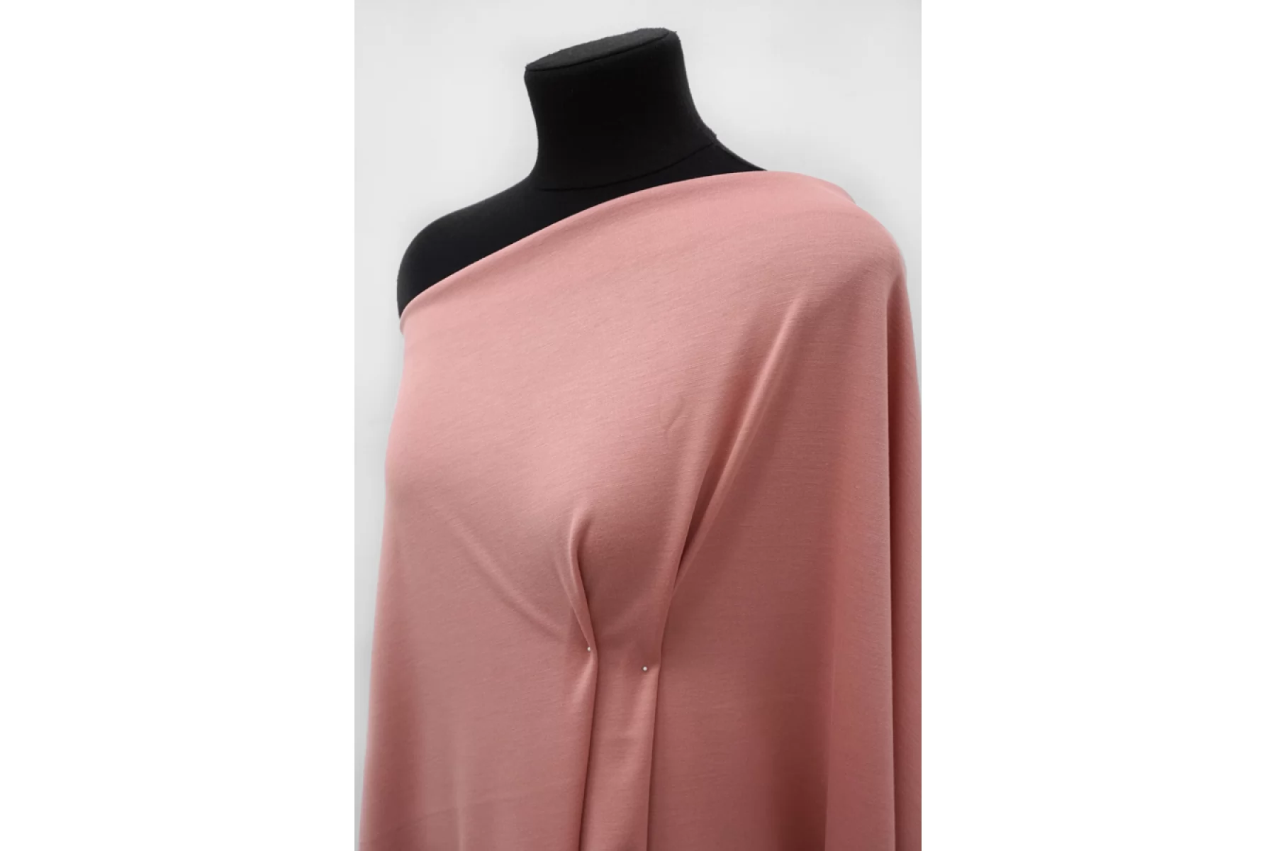Трикотаж-джерси вискозный в персиковом цвете. Эластичный, пластичный, плотный, не просвечивает. Подойдет для пошива платья, юбки, топа, кофты или кардигана.