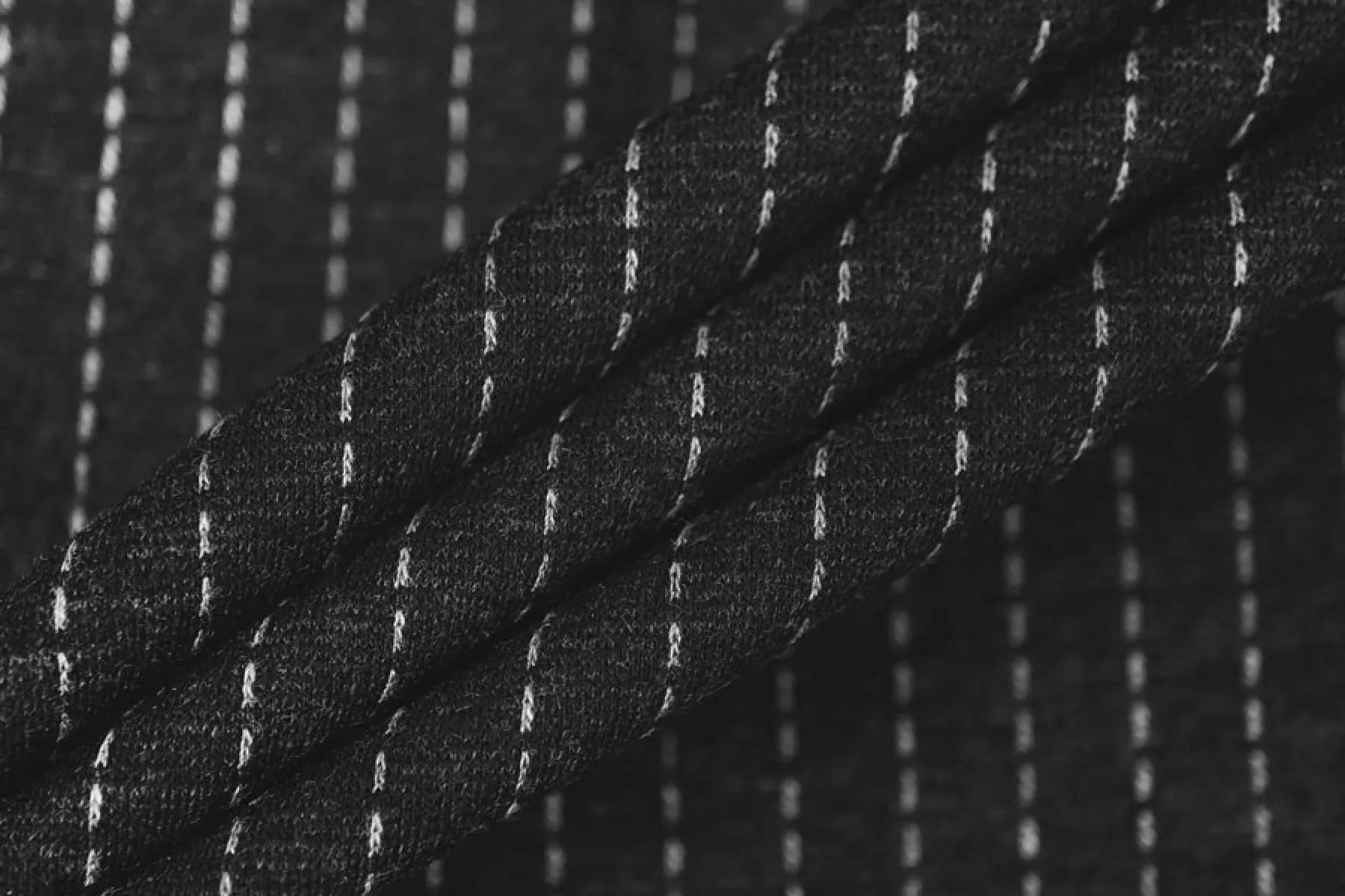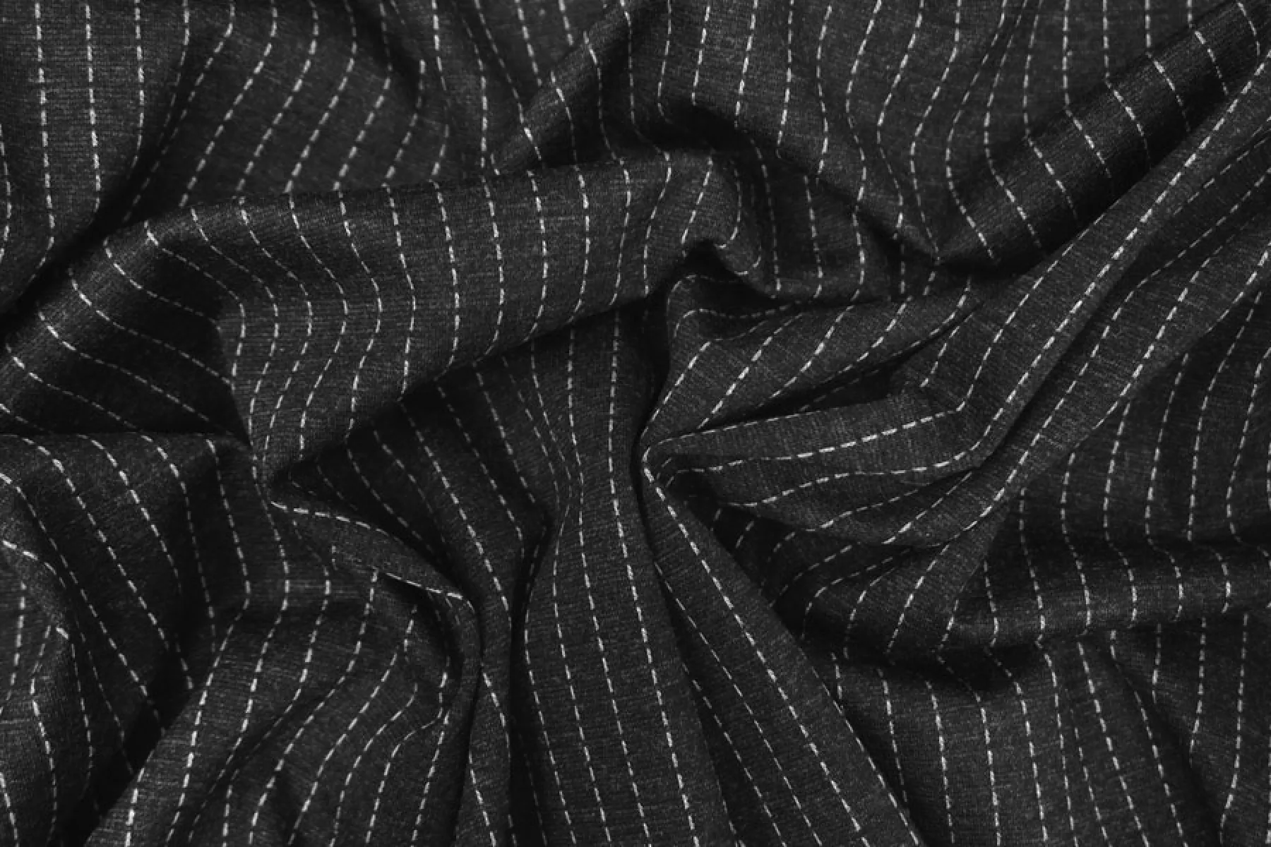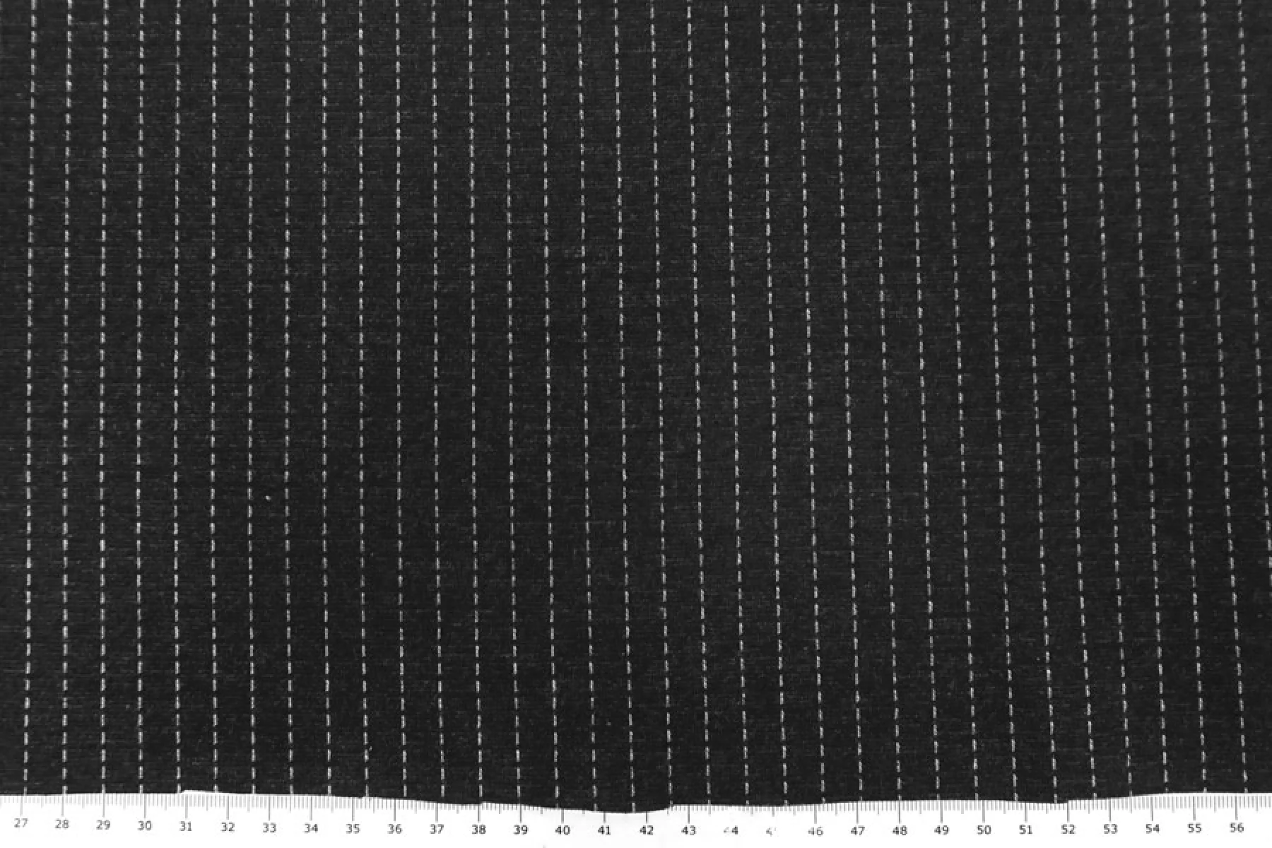 Классный вискозный трикотаж джерси с добавлением шерсти темно серого оттенка в полоску. Приятный и мягкий, суховатый наощупь, чувствуется, что шерсть. Не колется. Не толстый. Хорошо тянется, не мнется. Форму держит. Подойдет для пошива платья, лонгслива, юбки. Учитывайте возможную усадку. Уход деликатный.