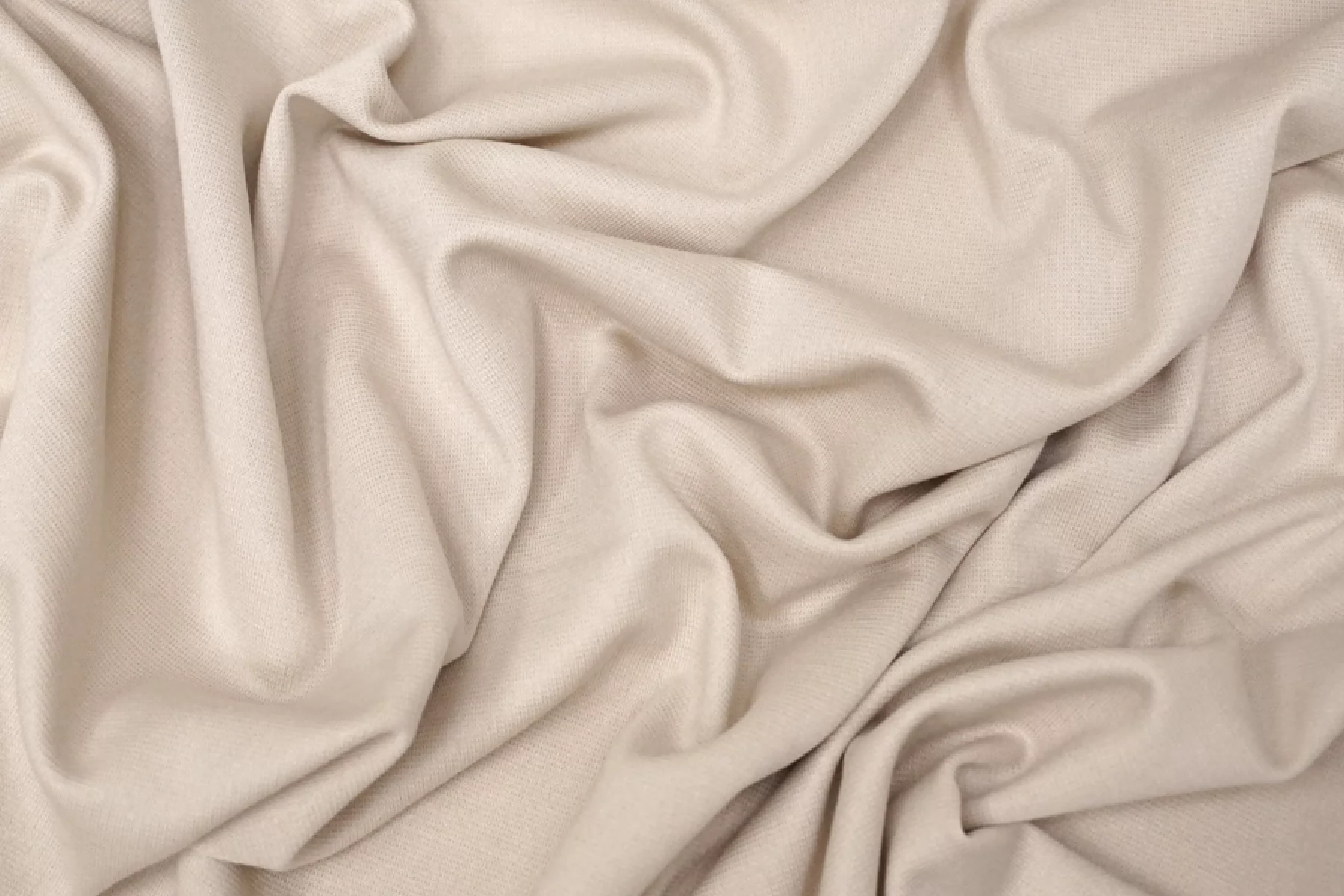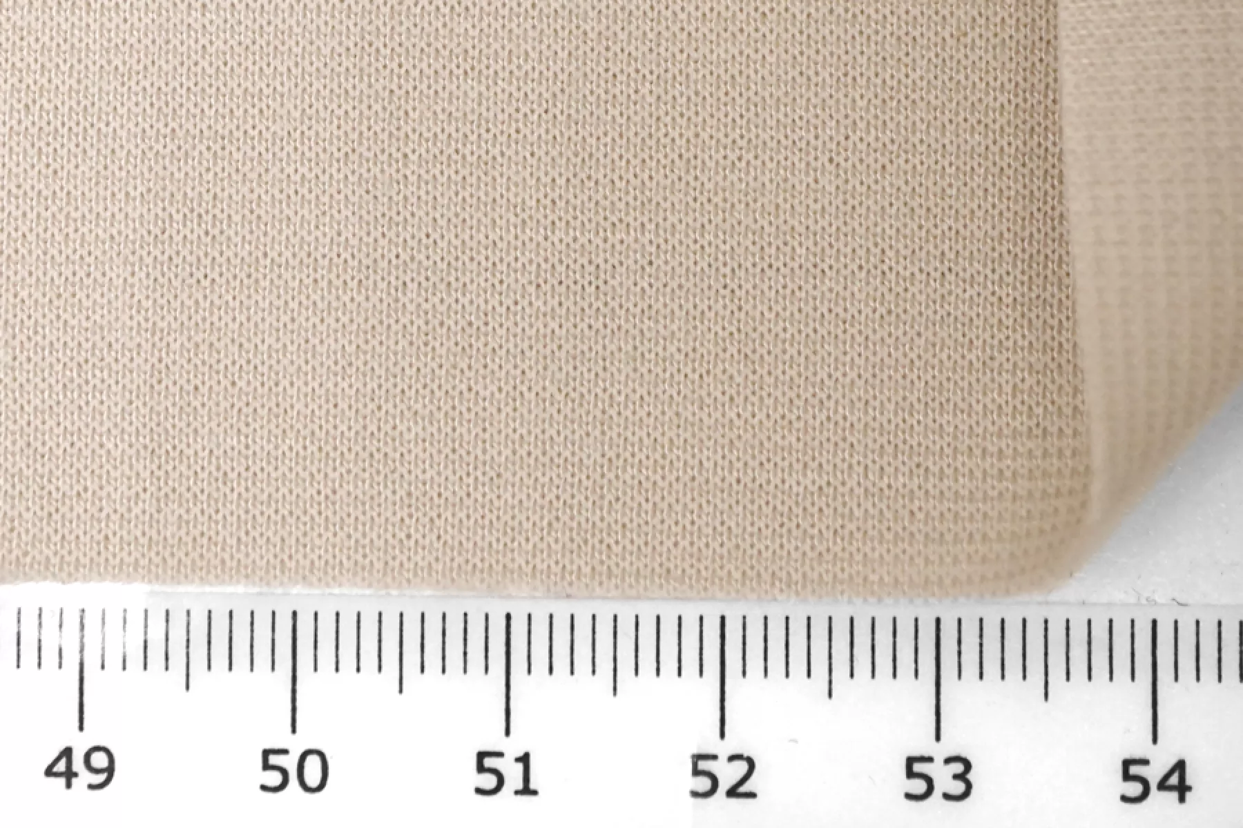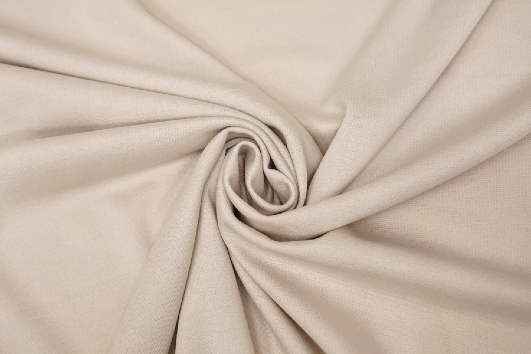Трикотаж вискозный джерси в светло-бежевом оттенке. Тонкий, мягкий, но при этом плотный. Эластичный, упругий, пластичный, просвечивает при растяжении. Немного держит форму. Подойдет для пошива платья, юбки, лонгслива. Учитывайте возможную усадку.