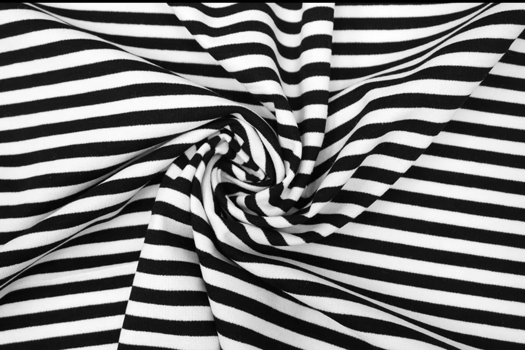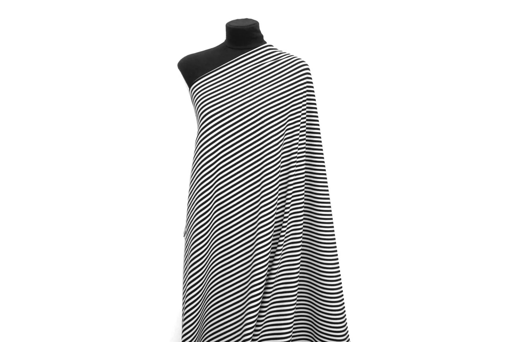 Трикотаж джерси вискозный в среднего размера полоску черно-белого цвета. Эластичный, пластичный, немного просвечивает. Как-будто слегка креповый наощупь. Форму держит. Не мнется. Подойдет для пошива платья, юбки, топа, кофты или кардигана. Учитывайте возможную усадку.