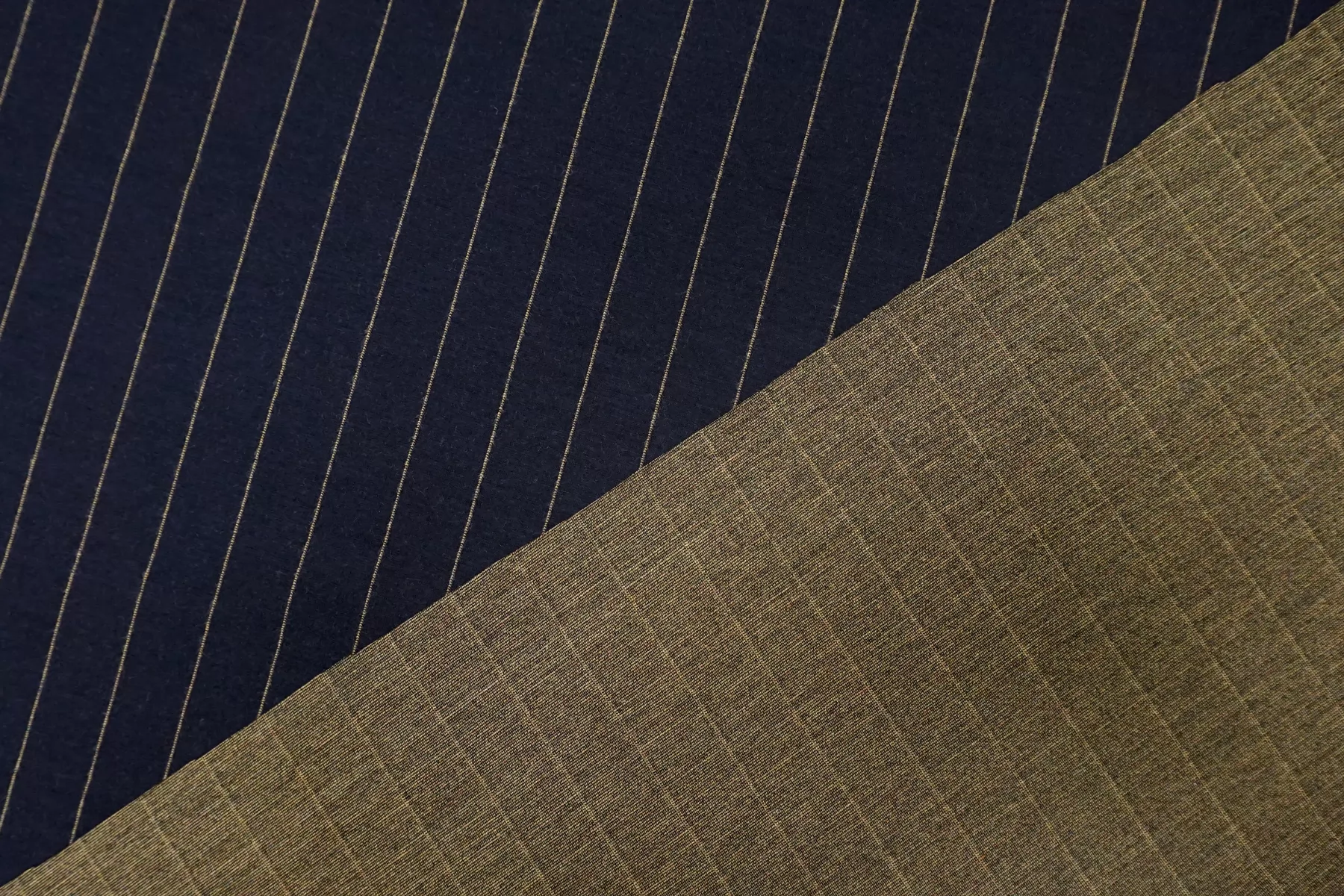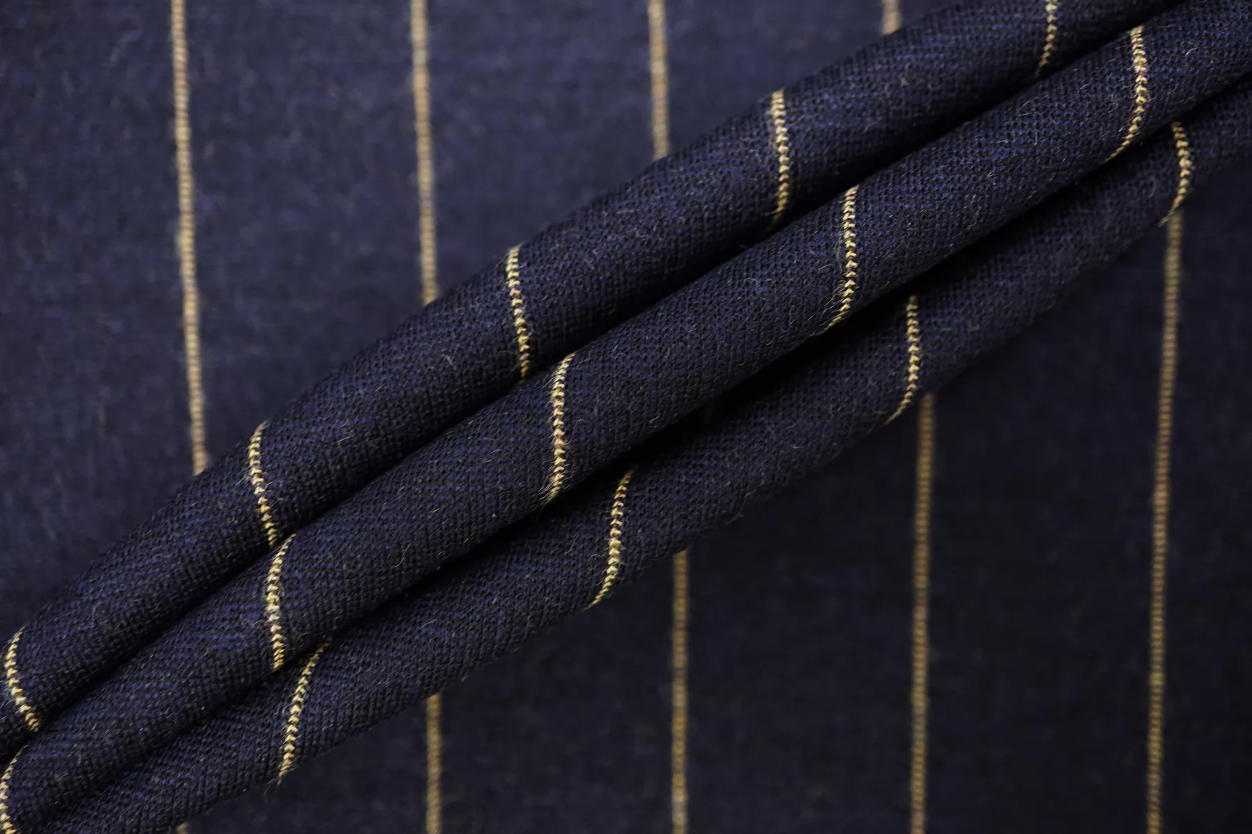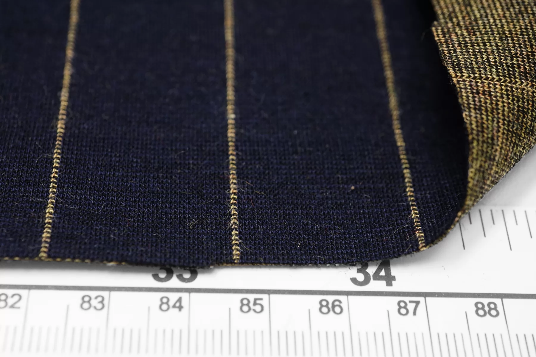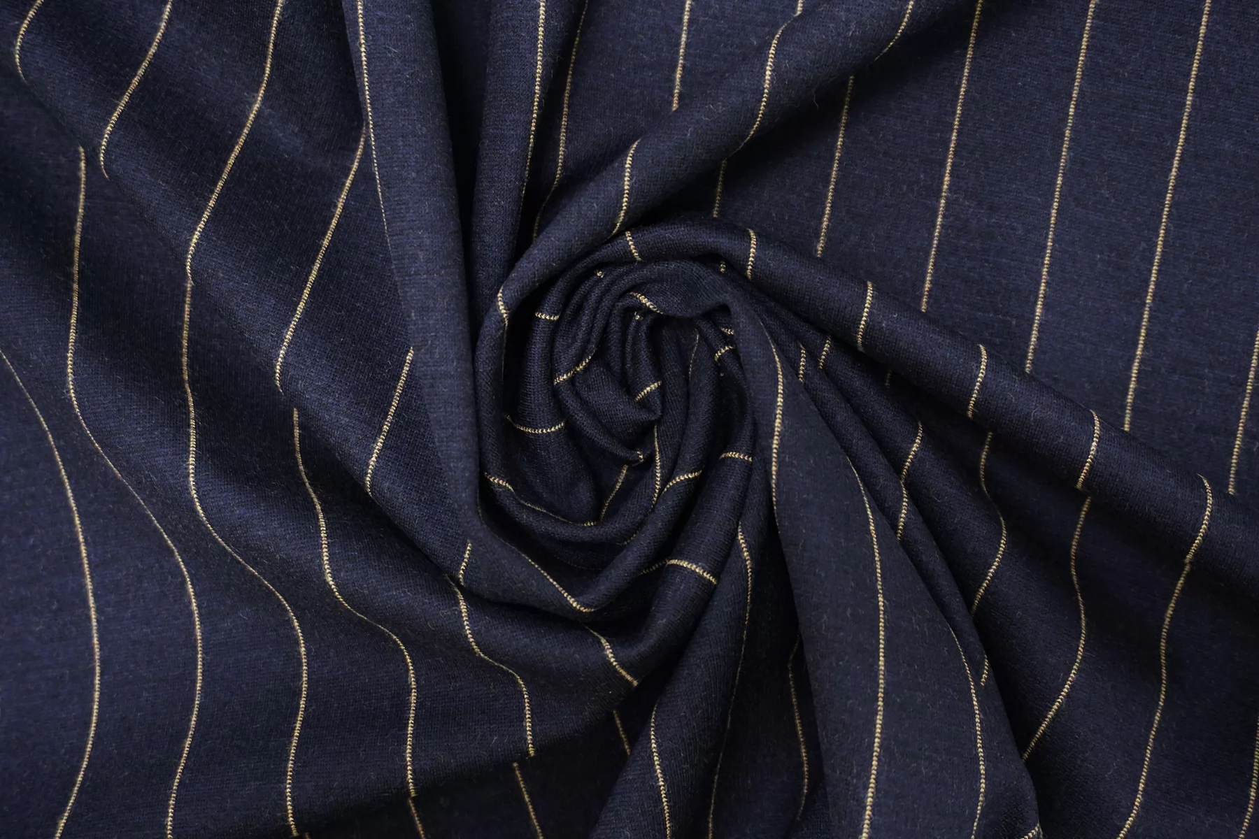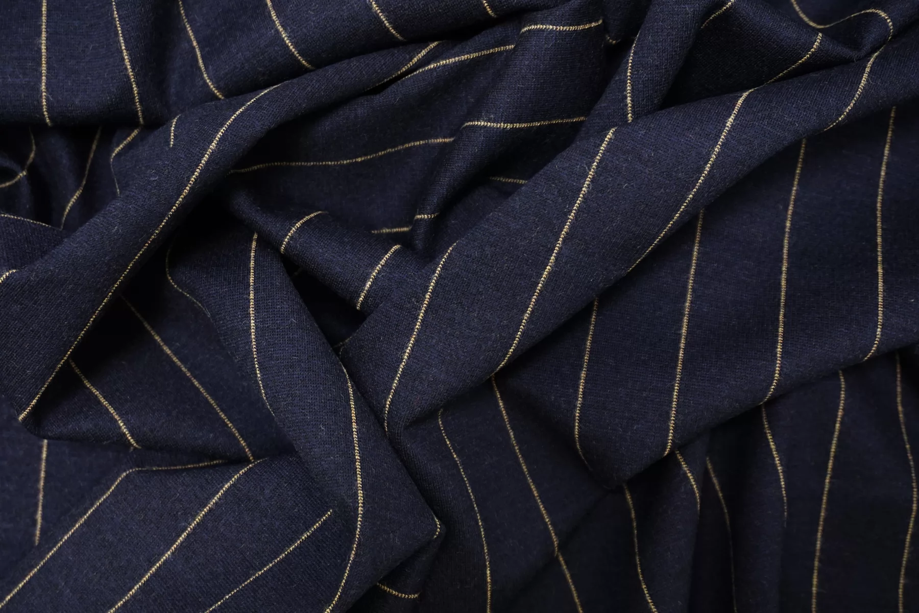 Классный вискозный трикотаж джерси тёмно-синего цвета в тонкую приглушённо-жёлтую полоску. Приятный и мягкий. Не толстый. Хорошо тянется, не мнется. Форму держит. Подойдет для пошива платья, лонгслива, юбки. Учитывайте возможную усадку. Уход деликатный.
